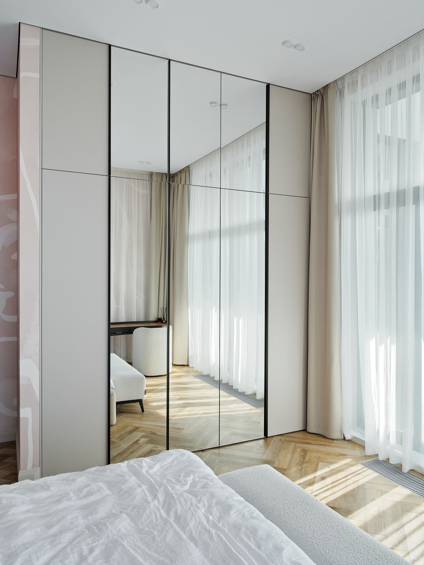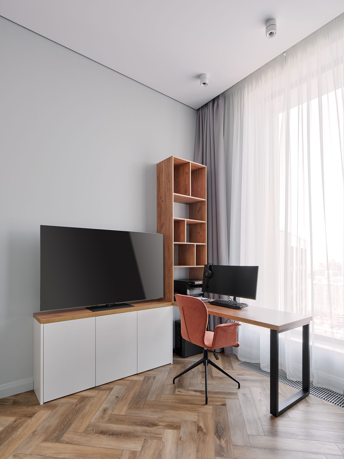 Для остальной части квартиры также использована мебель от «Марии». Гостиная оснащена зоной отдыха с телевизором и камином. Кабинет оборудован функциональным рабочим столом, тумбой под телевизор и шкафом. Спальная и прихожая дополнены красивыми шкафами с зеркалами.
