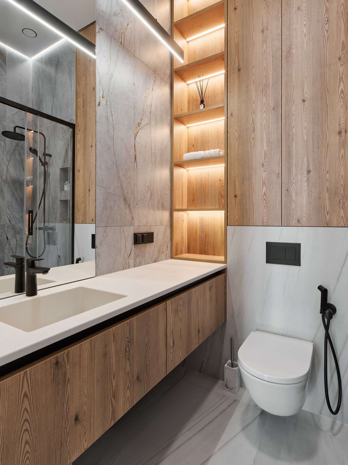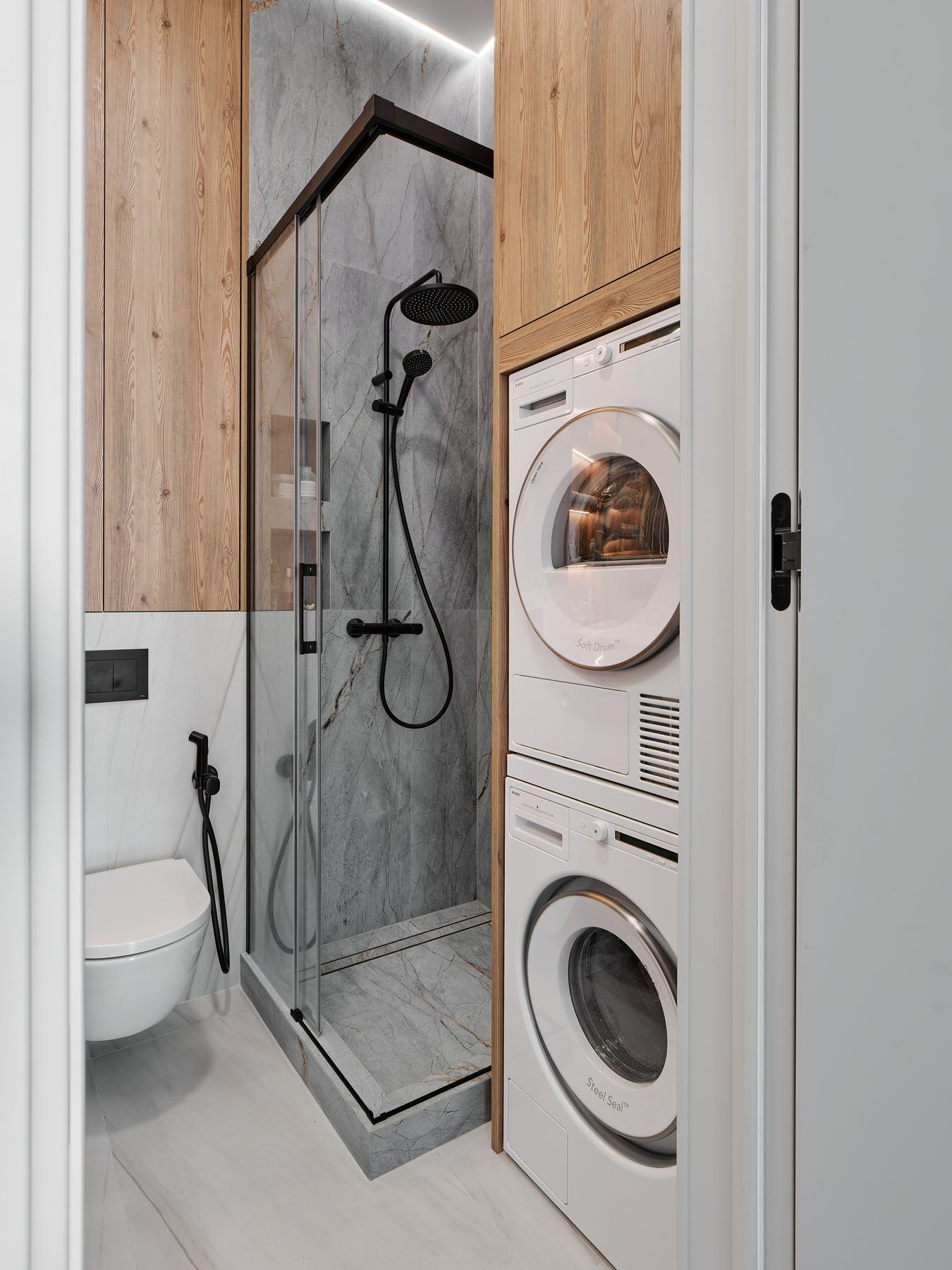 Две санузлы оснащены удобными тумбами с раковинами и столешницами из искусственного камня, шкафом-постирочной и шкафчиками для хранения бытовых принадлежностей.