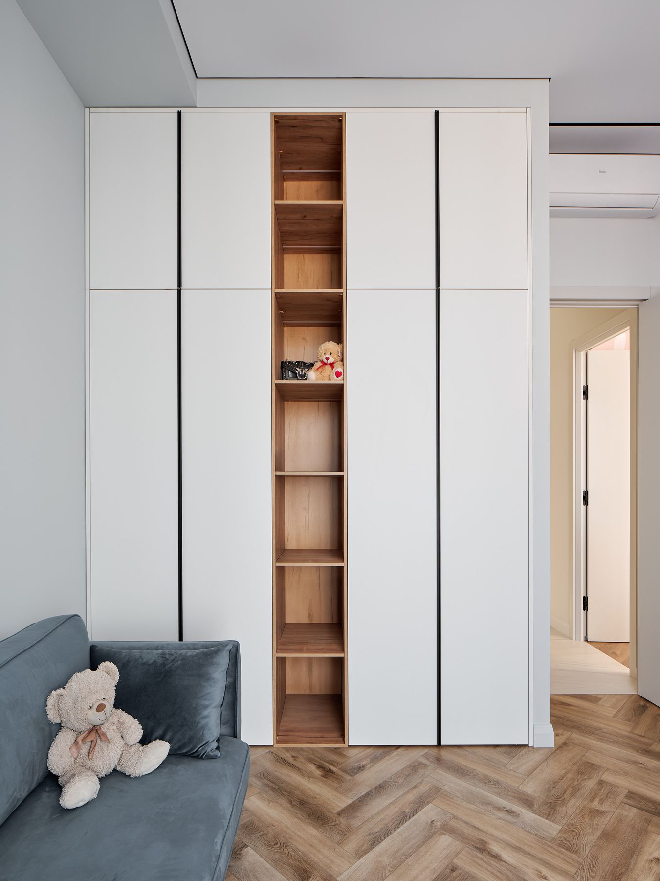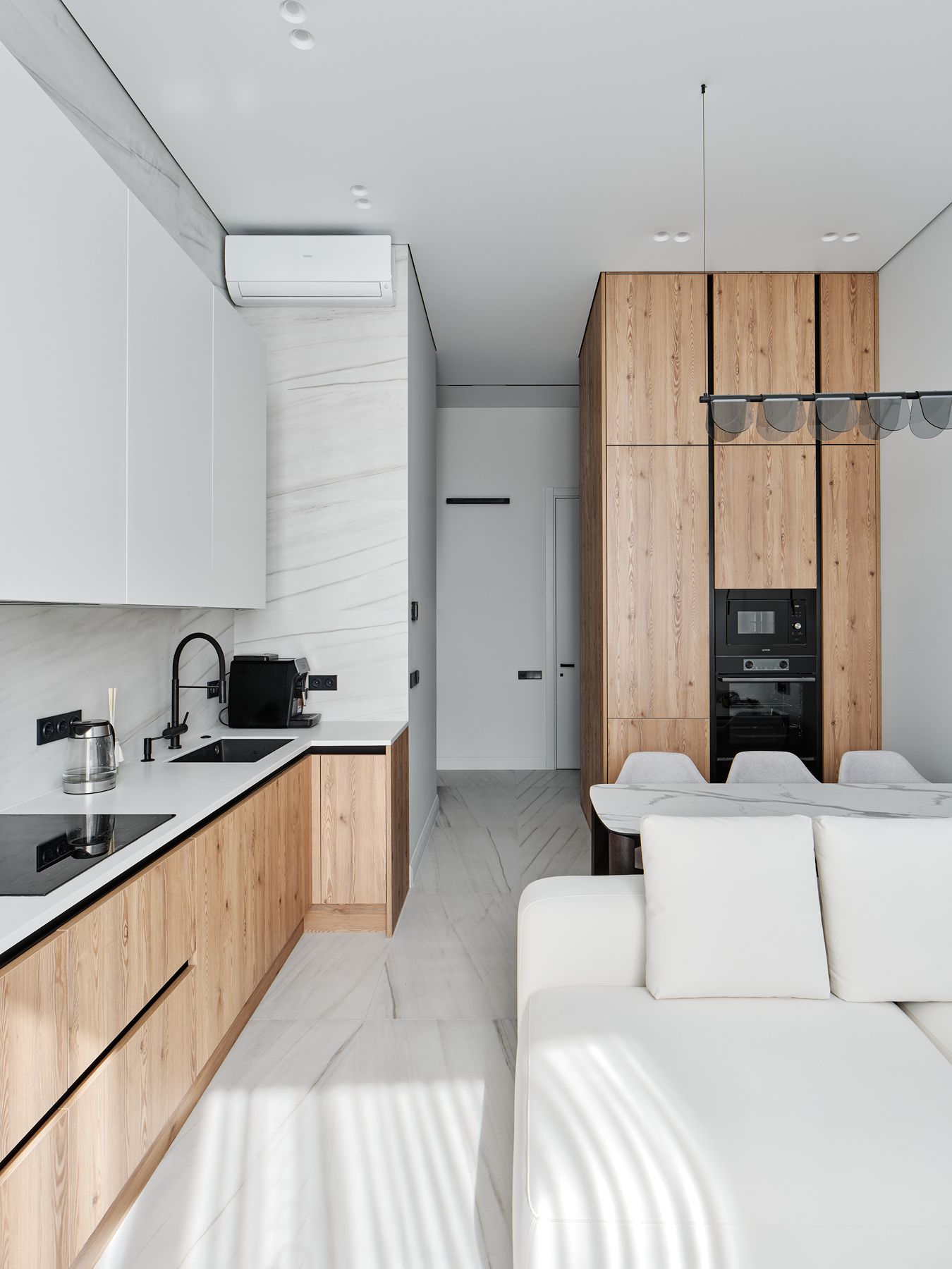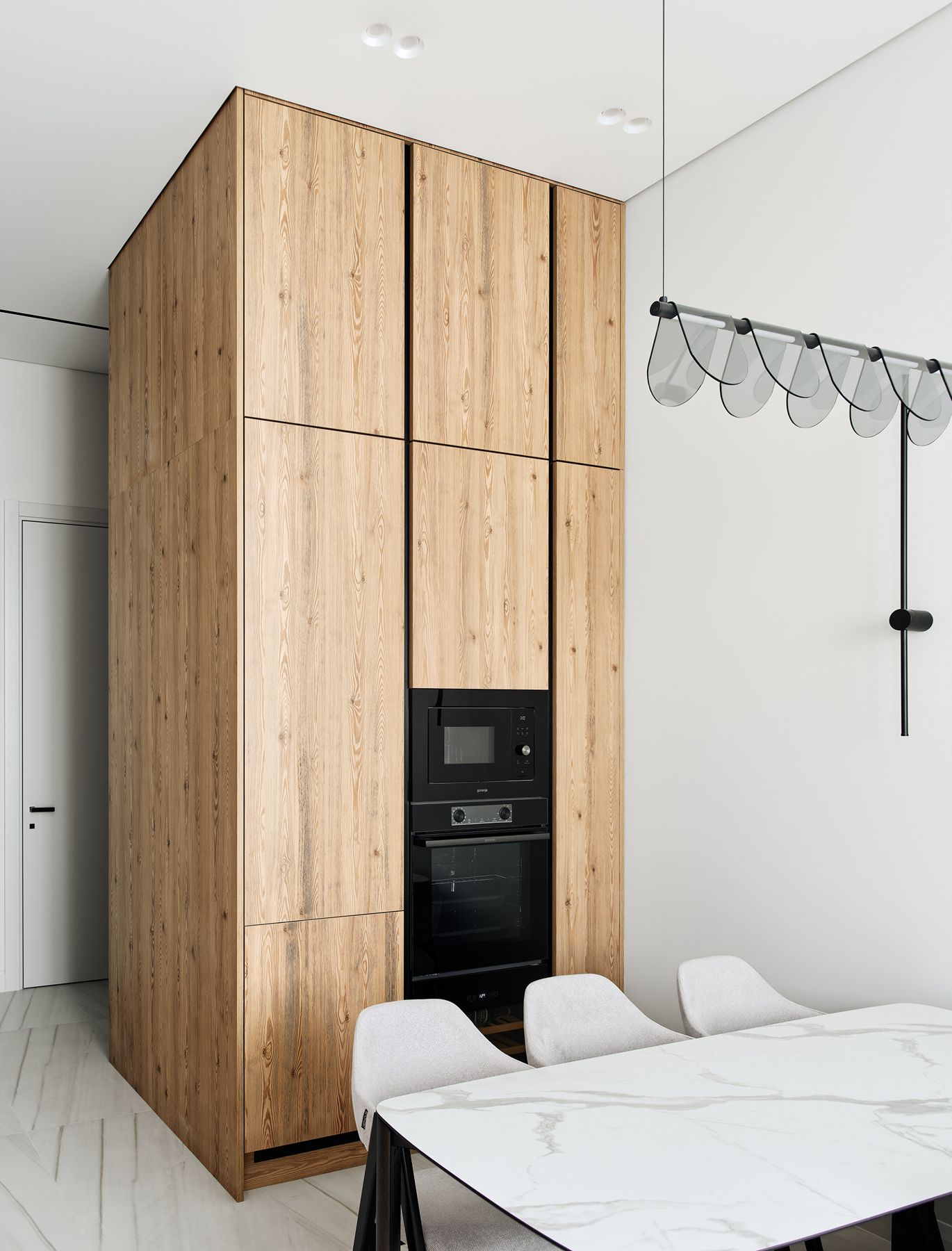 Основная сложность проекта заключалась в особенностях планировки: кухня-гостиная имела вытянутую форму, а потолки были высокими – целых 3,6 м. Дизайнер предложила оригинальное решение: объединить пеналы с бытовой техникой и шкаф в гардеробной. Такой приём исправил геометрию пространства и разделил зоны кухни и гостиной. Рабочую зону кухни разместили вдоль противоположной стены.