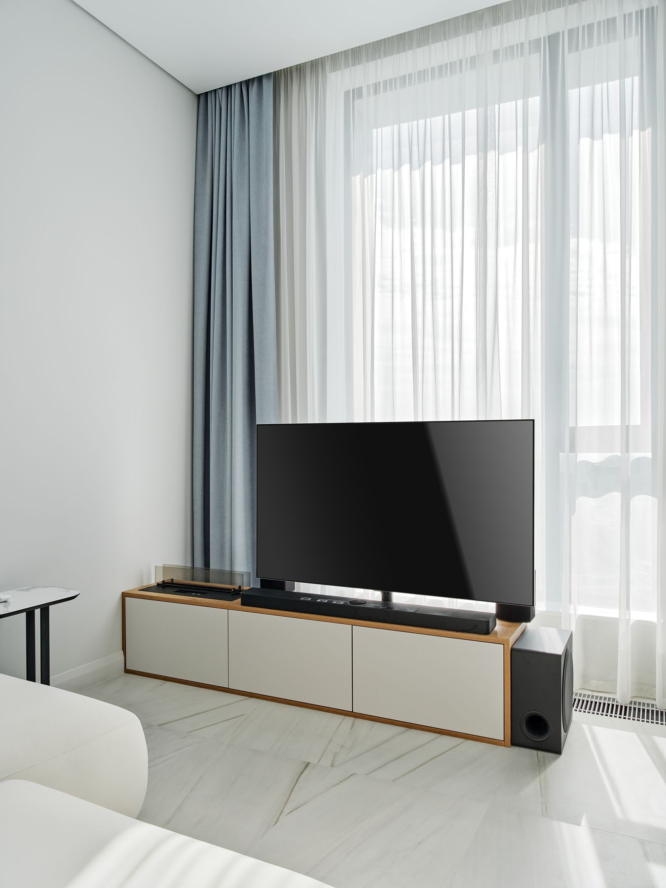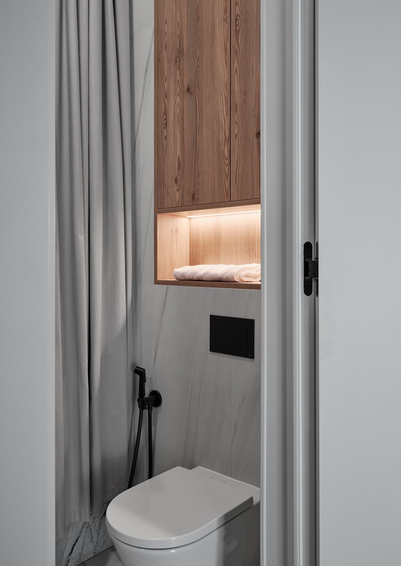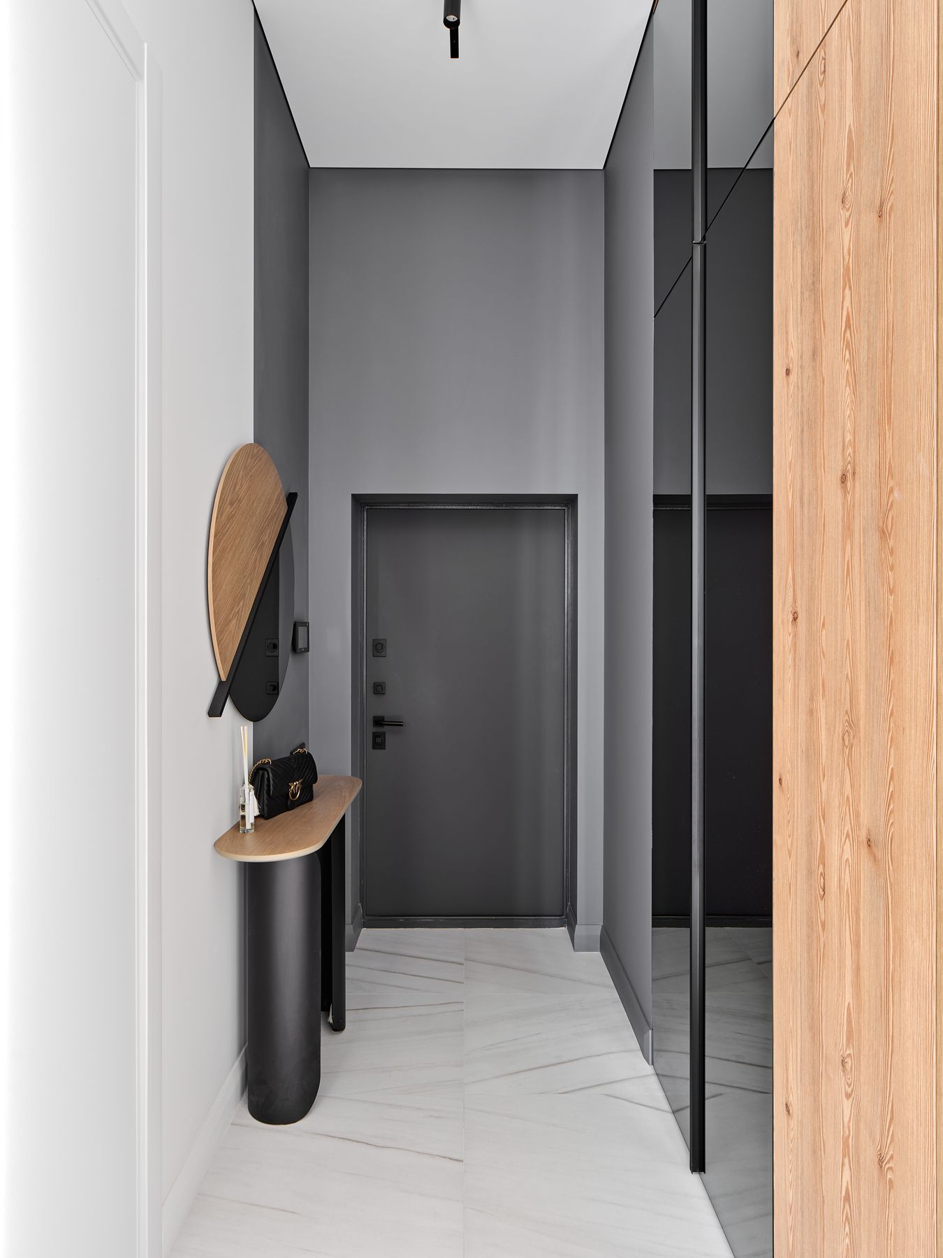 Основная сложность проекта заключалась в особенностях планировки: кухня-гостиная имела вытянутую форму, а потолки были высокими – целых 3,6 м. Дизайнер предложила оригинальное решение: объединить пеналы с бытовой техникой и шкаф в гардеробной. Такой приём исправил геометрию пространства и разделил зоны кухни и гостиной. Рабочую зону кухни разместили вдоль противоположной стены.