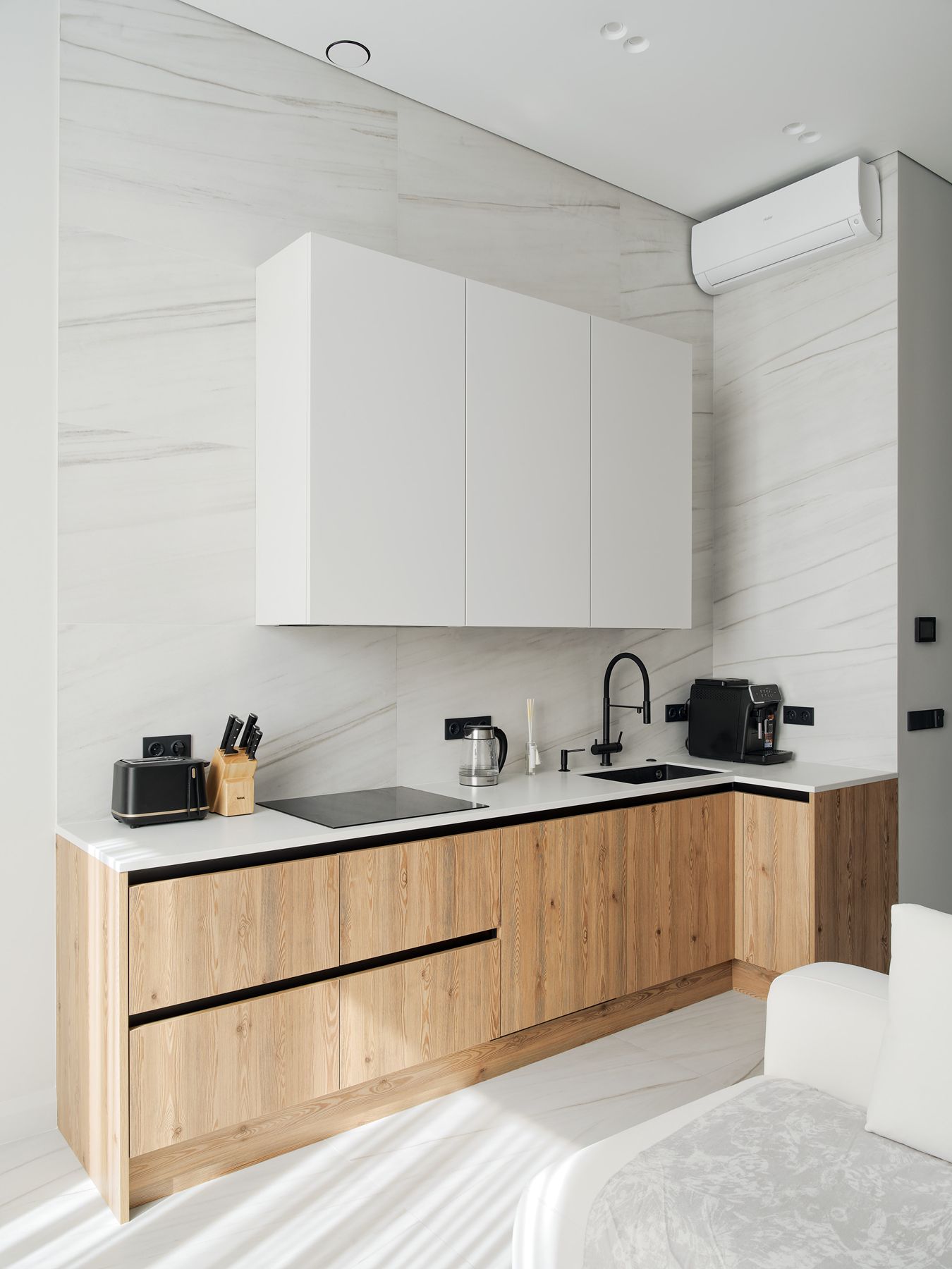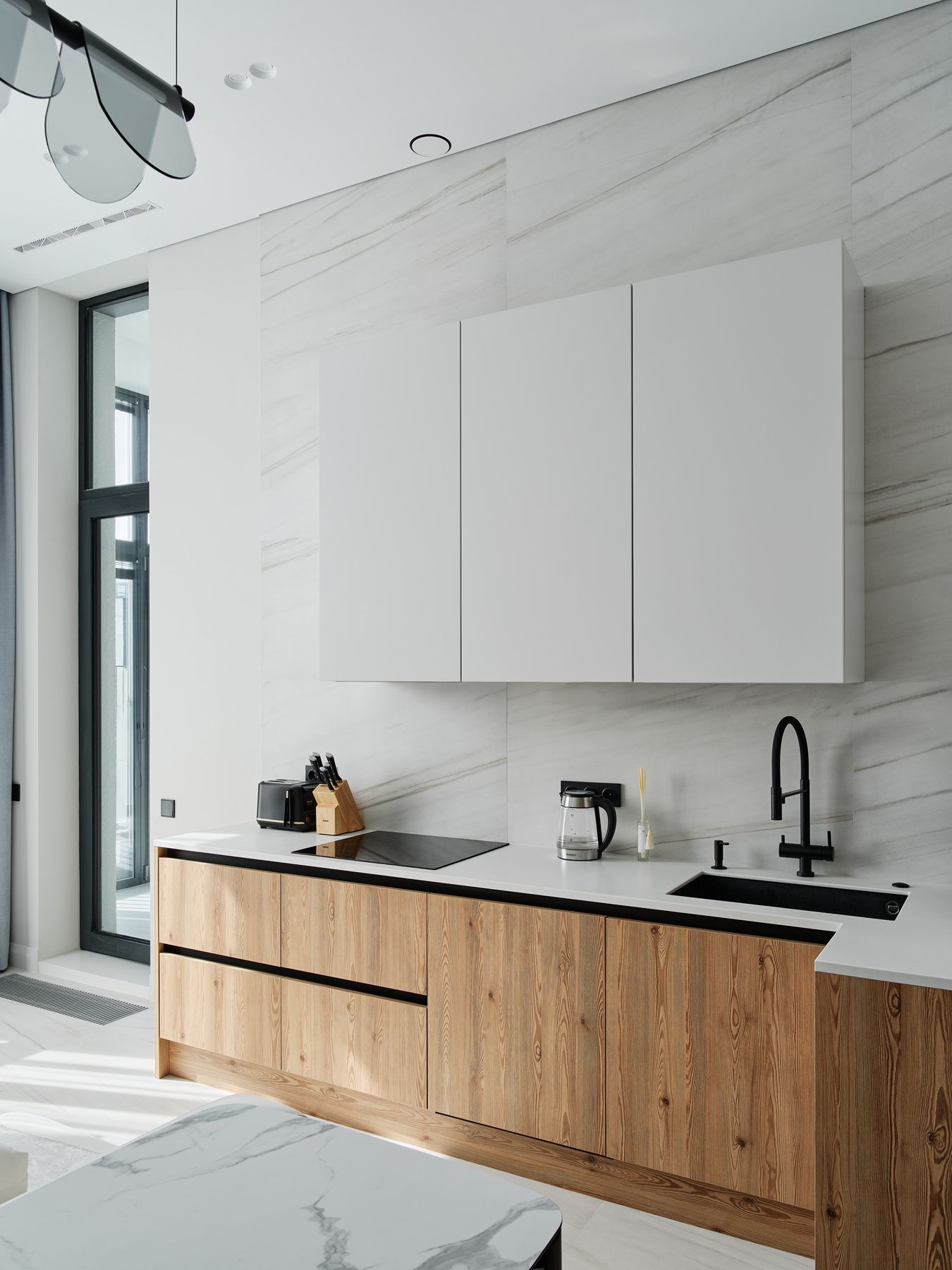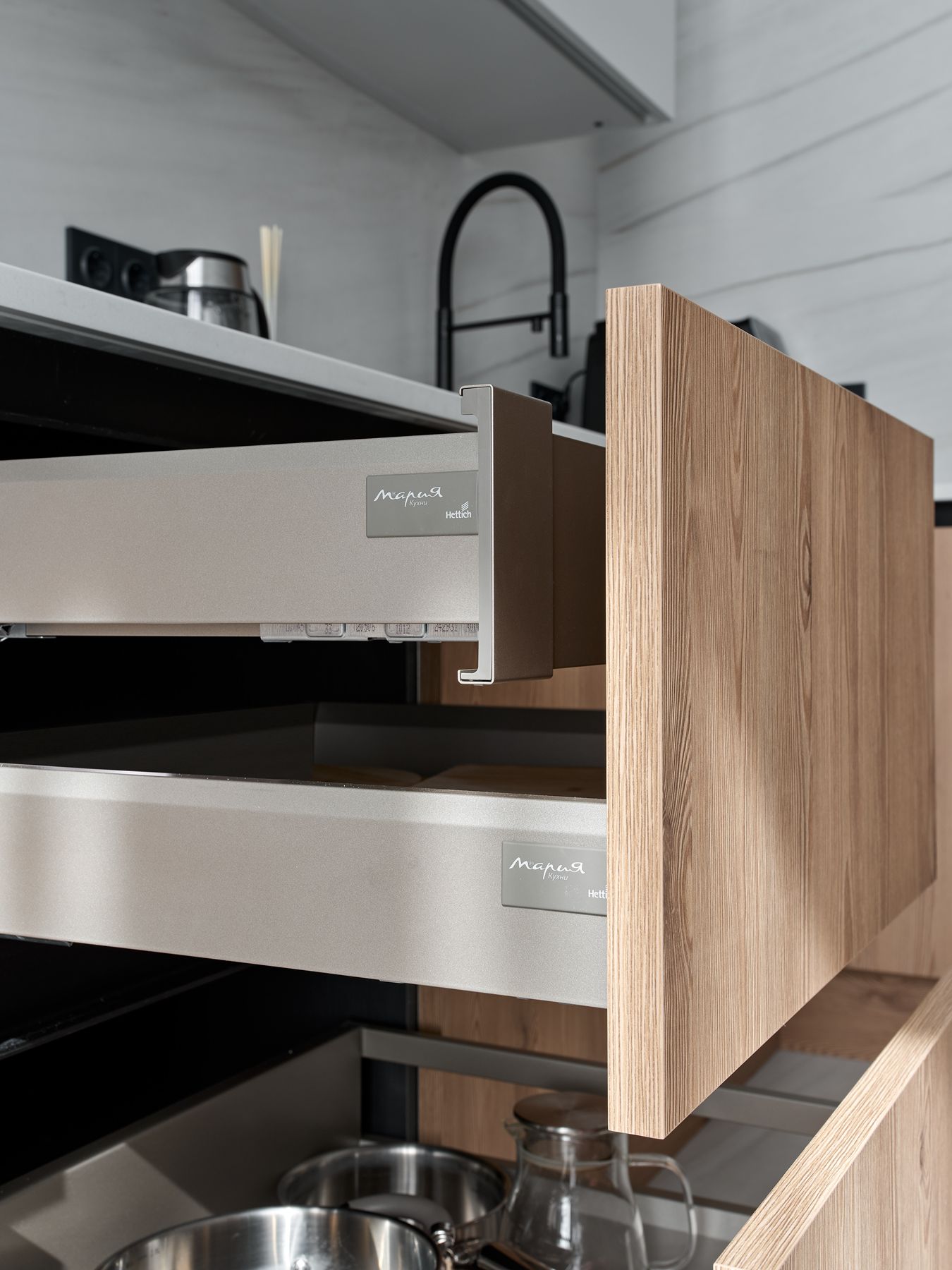 Для оформления кухни выбраны модели Jazz светло-серого цвета и Mix 22 в тёплом древесном оттенке. Это сочетание идеально подошло для создания атмосферы гармонии и отдыха.