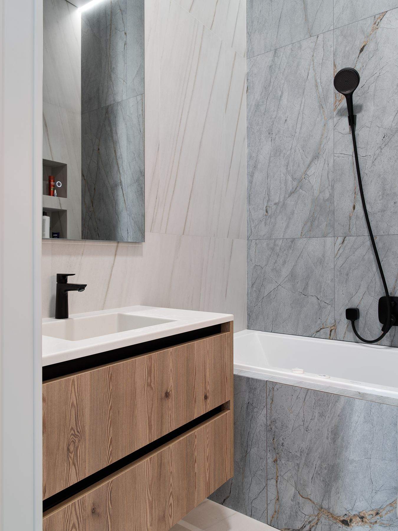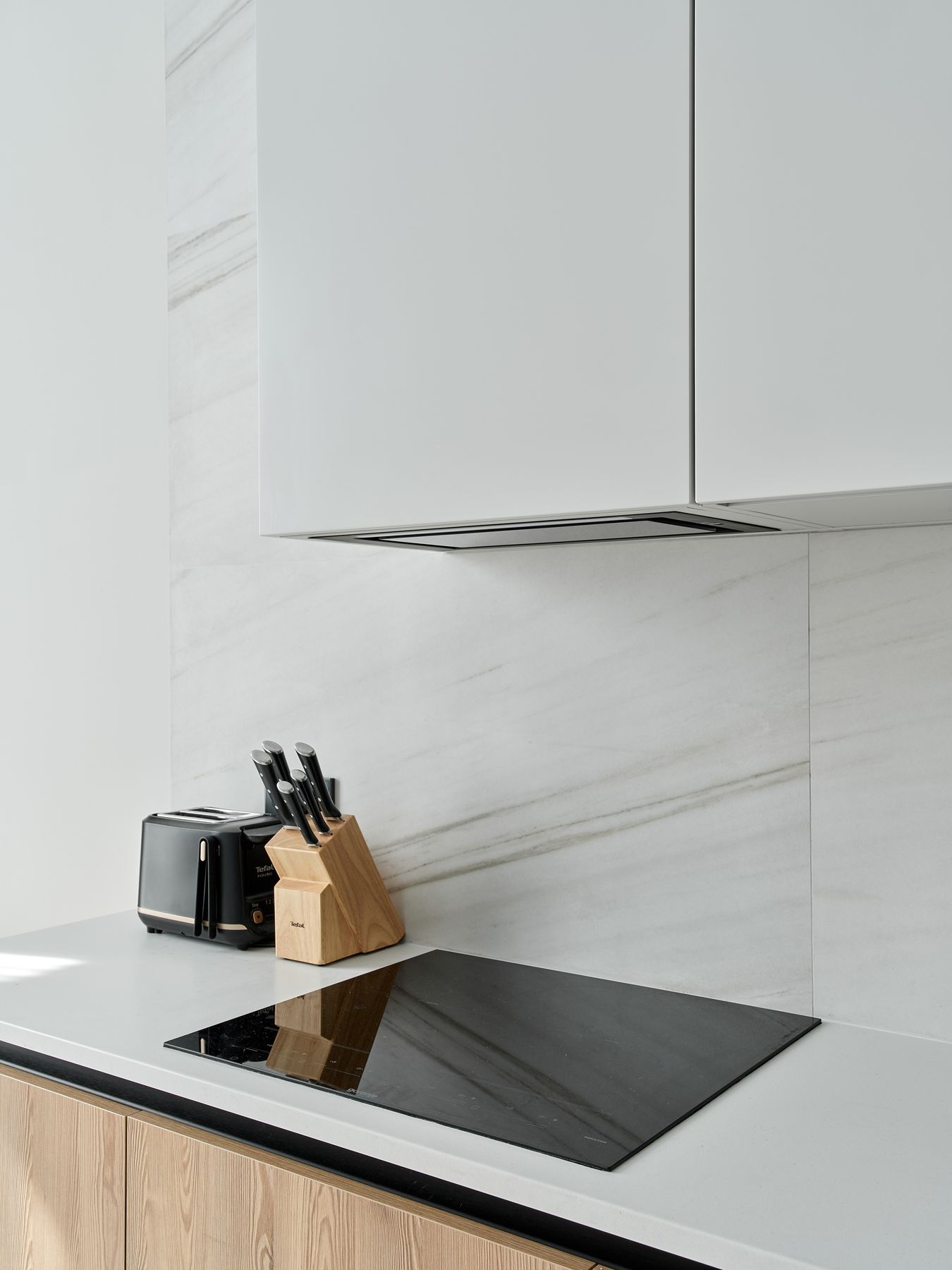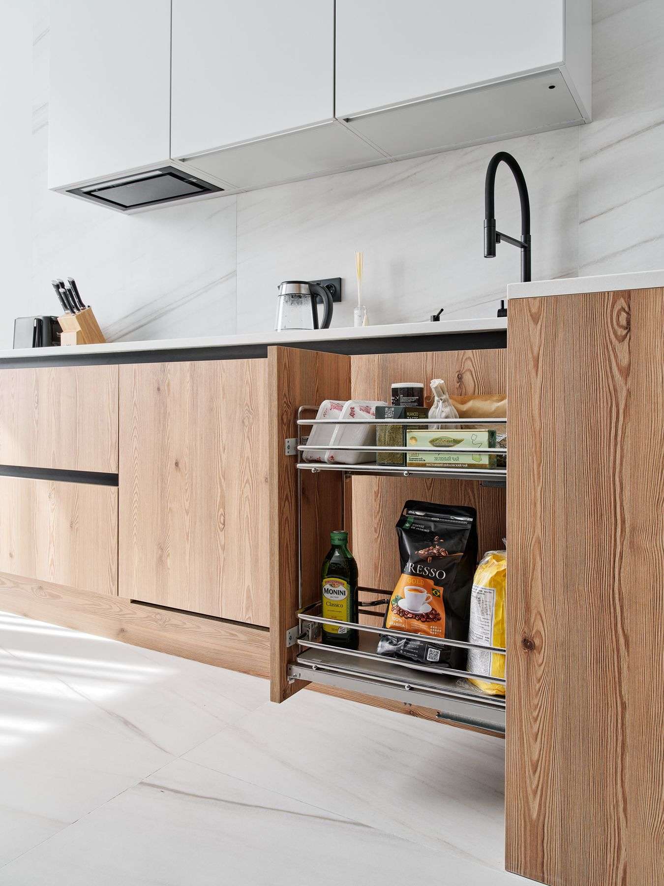 Для оформления кухни выбраны модели Jazz светло-серого цвета и Mix 22 в тёплом древесном оттенке. Это сочетание идеально подошло для создания атмосферы гармонии и отдыха.