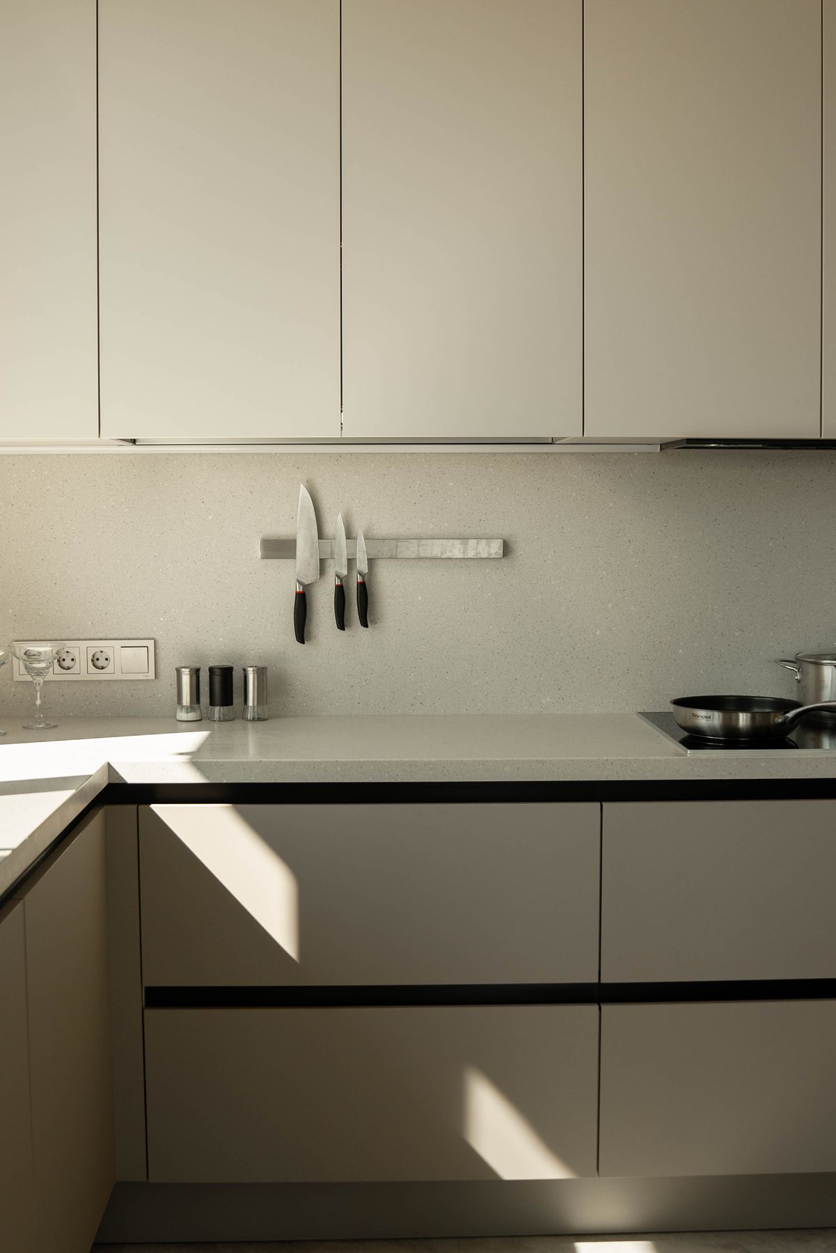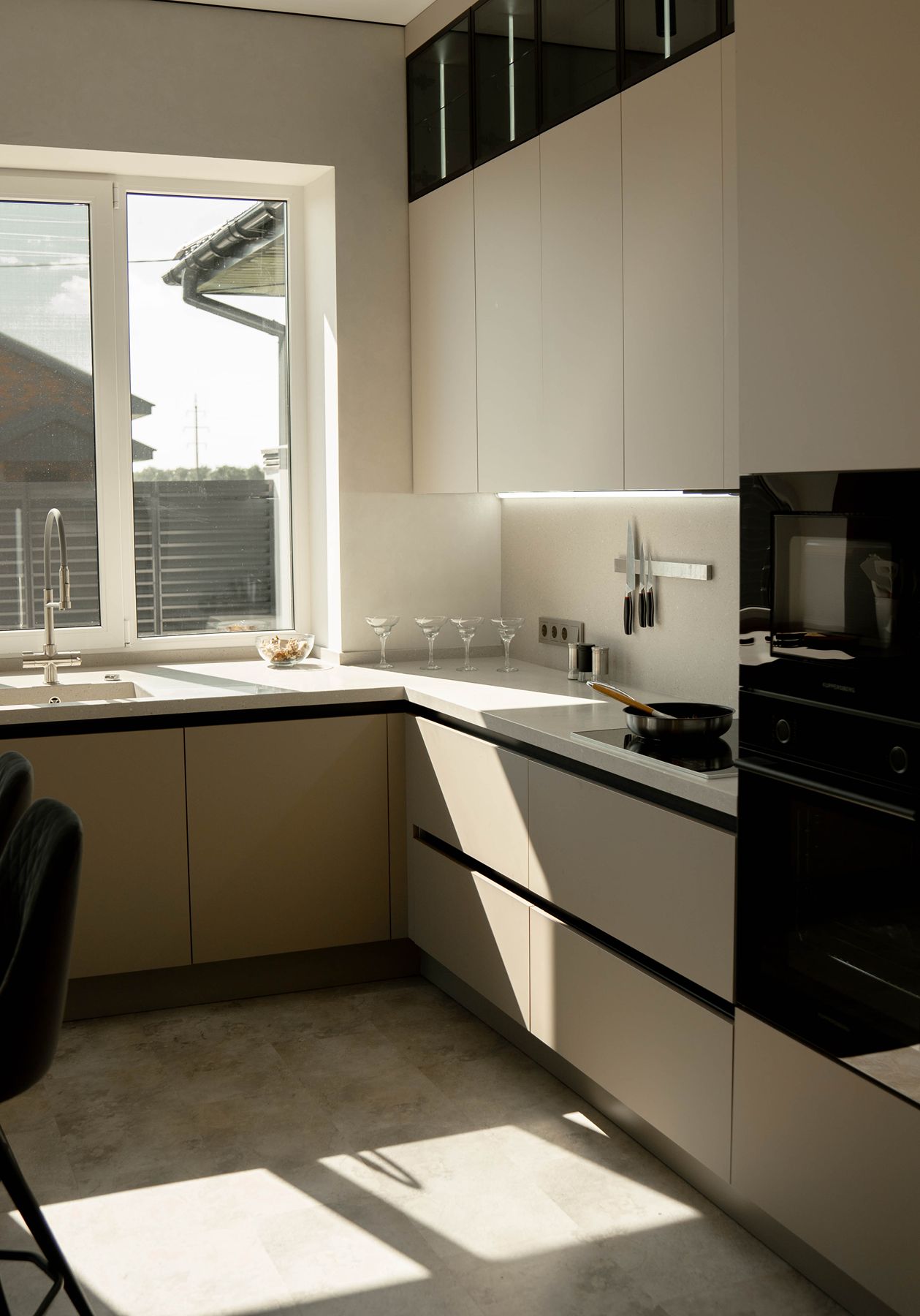 В качестве гарнитура выбрана модель Vector Touch. Ее фасады обладают приятной на ощупь текстурой и устойчивостью к загрязнениям. Кухня объединена с гостиной, поэтому для достижения единого визуального восприятия было решено выбрать светлую цветовую гамму. Антресоли с тонированным стеклом и подсветкой создают необходимые контрасты.