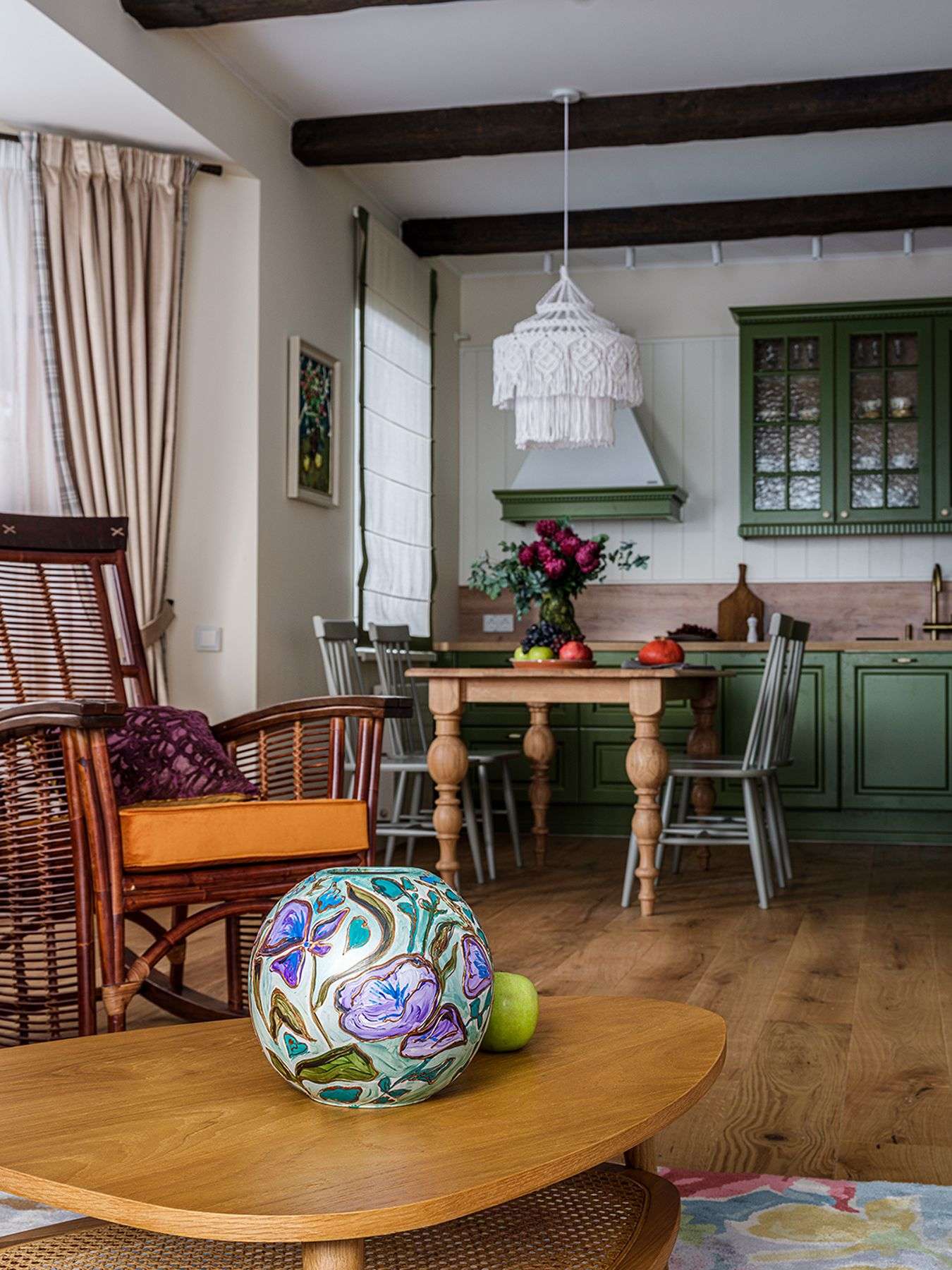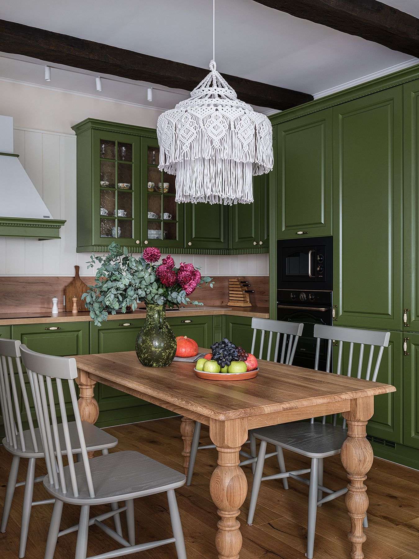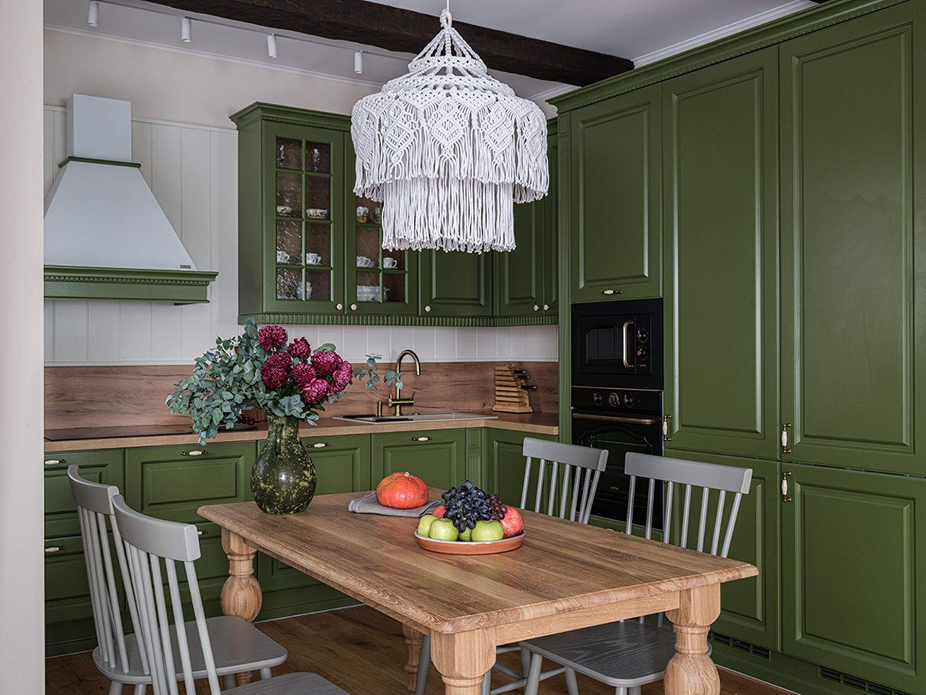 Кухня преобразилась благодаря модели Nicolle в неоклассическом стиле. Фасады покрыты эмалью глубокого зеленого цвета. Столешница и стеновые панели изготовлены из ДСП в теплом древесном оттенке, подчеркивающем уютную атмосферу загородного дома.