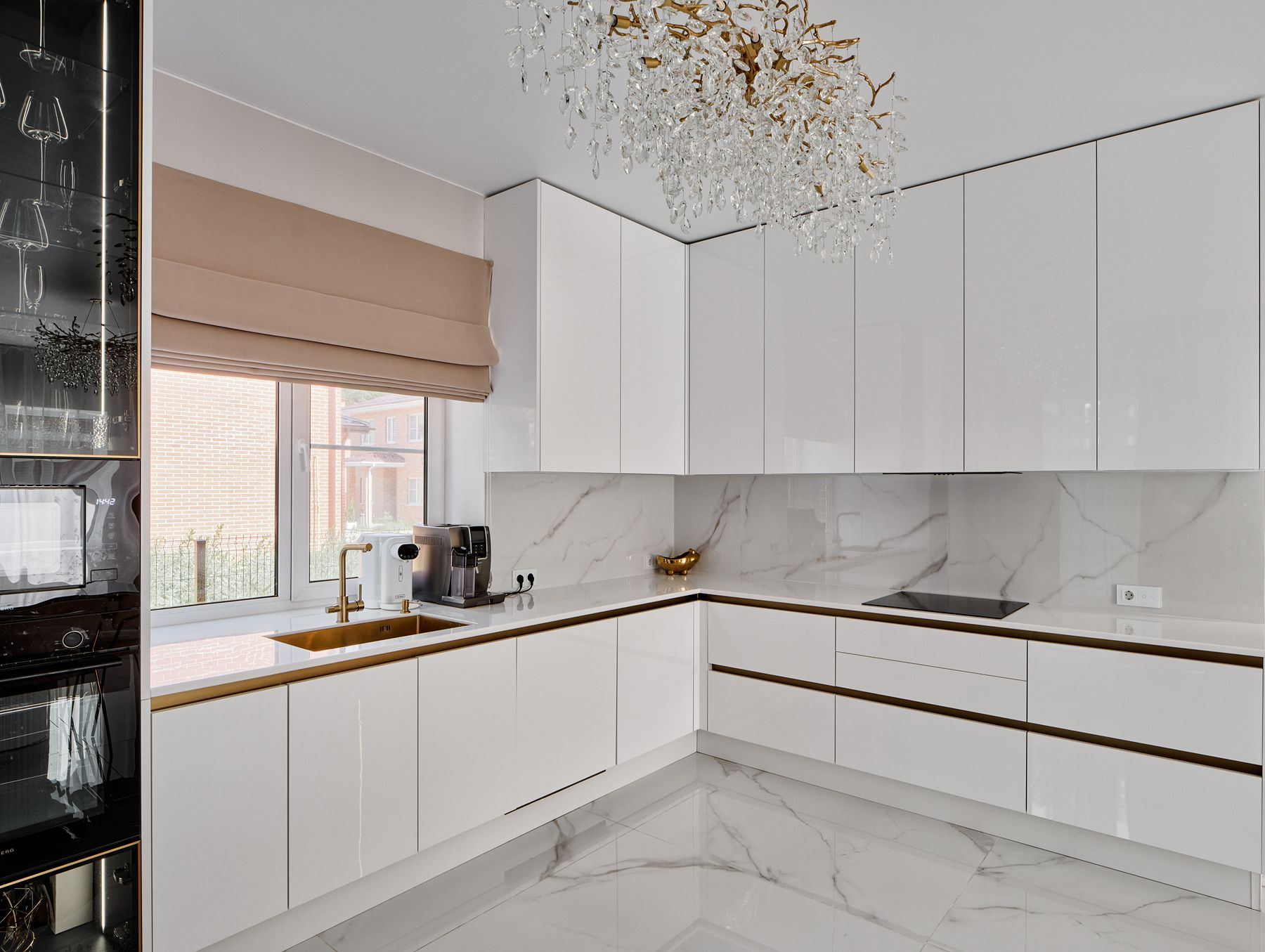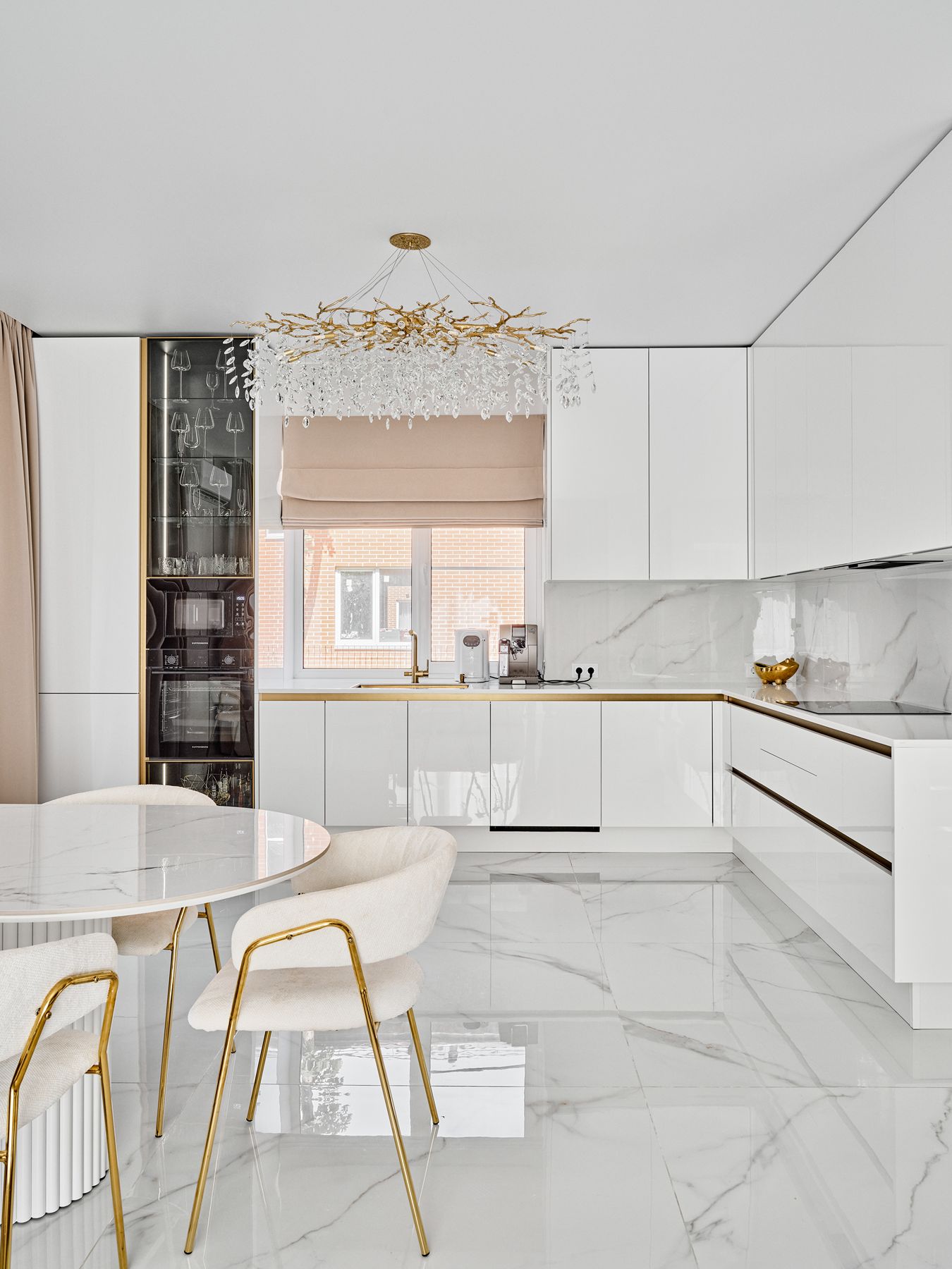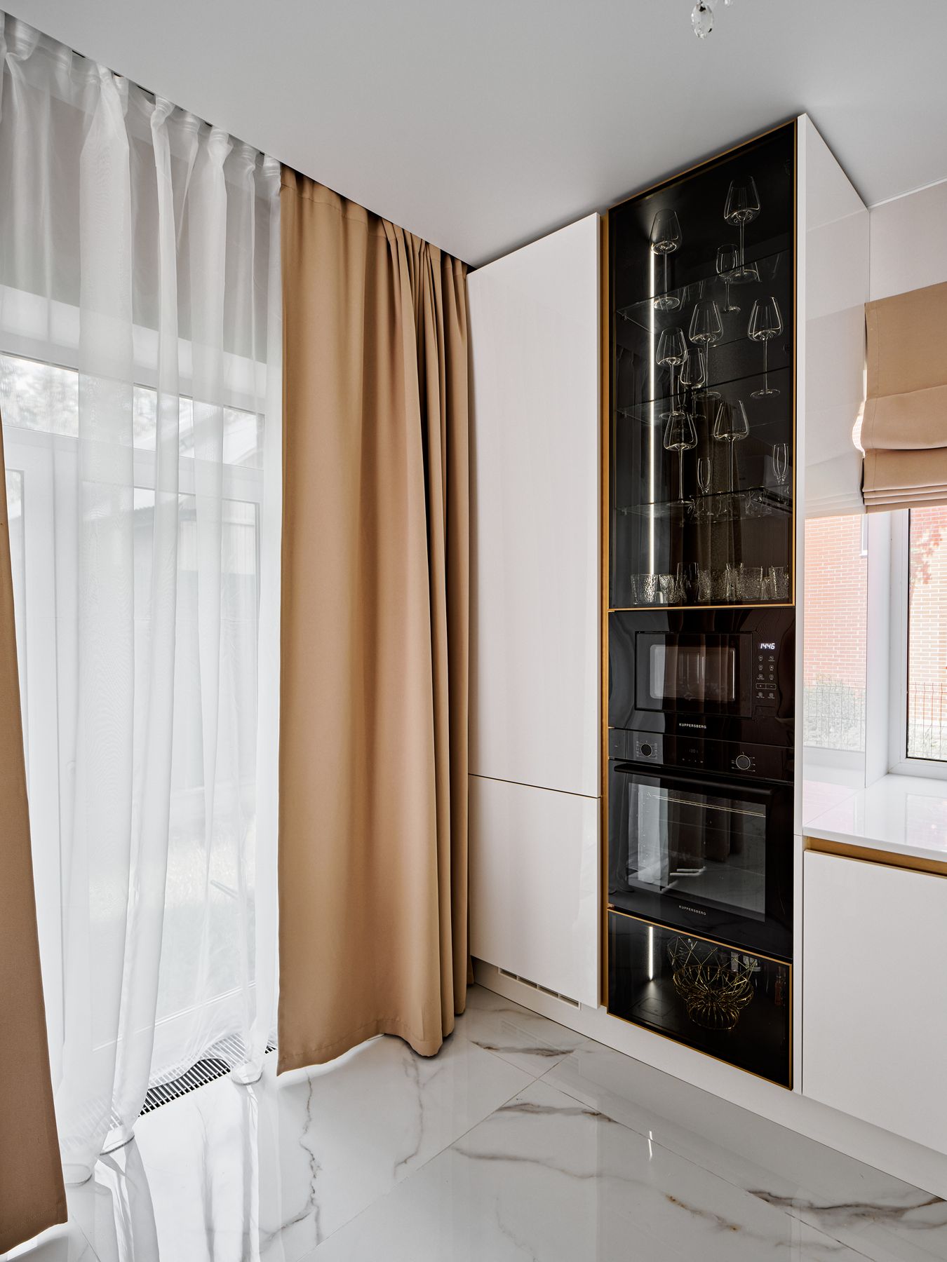Угловая компоновка кухни с высокими шкафами до потолка создает максимальное количество мест для хранения посуды и кухонных принадлежностей. Особое внимание привлекает эффектный шкаф-витрина с внутренней подсветкой. Фасады со стеклом, обрамленные профилем золотистого оттенка, выразительно контрастируют с белоснежным глянцем гарнитура.