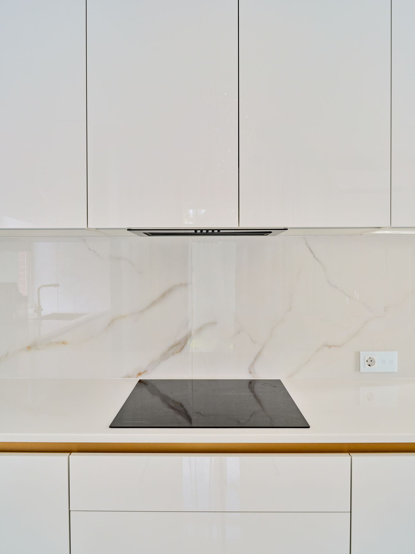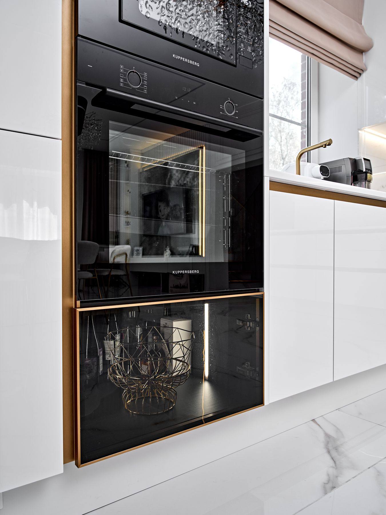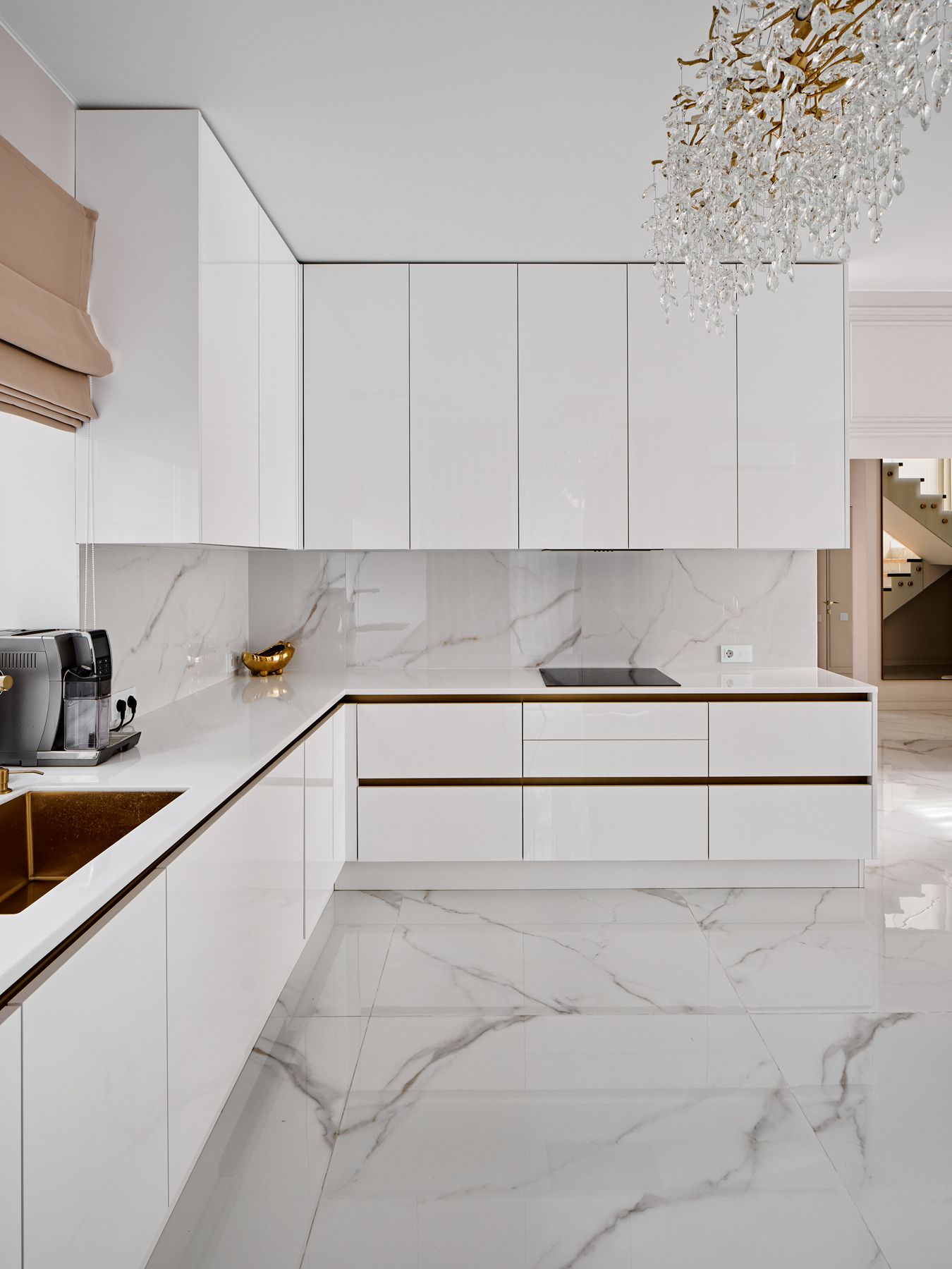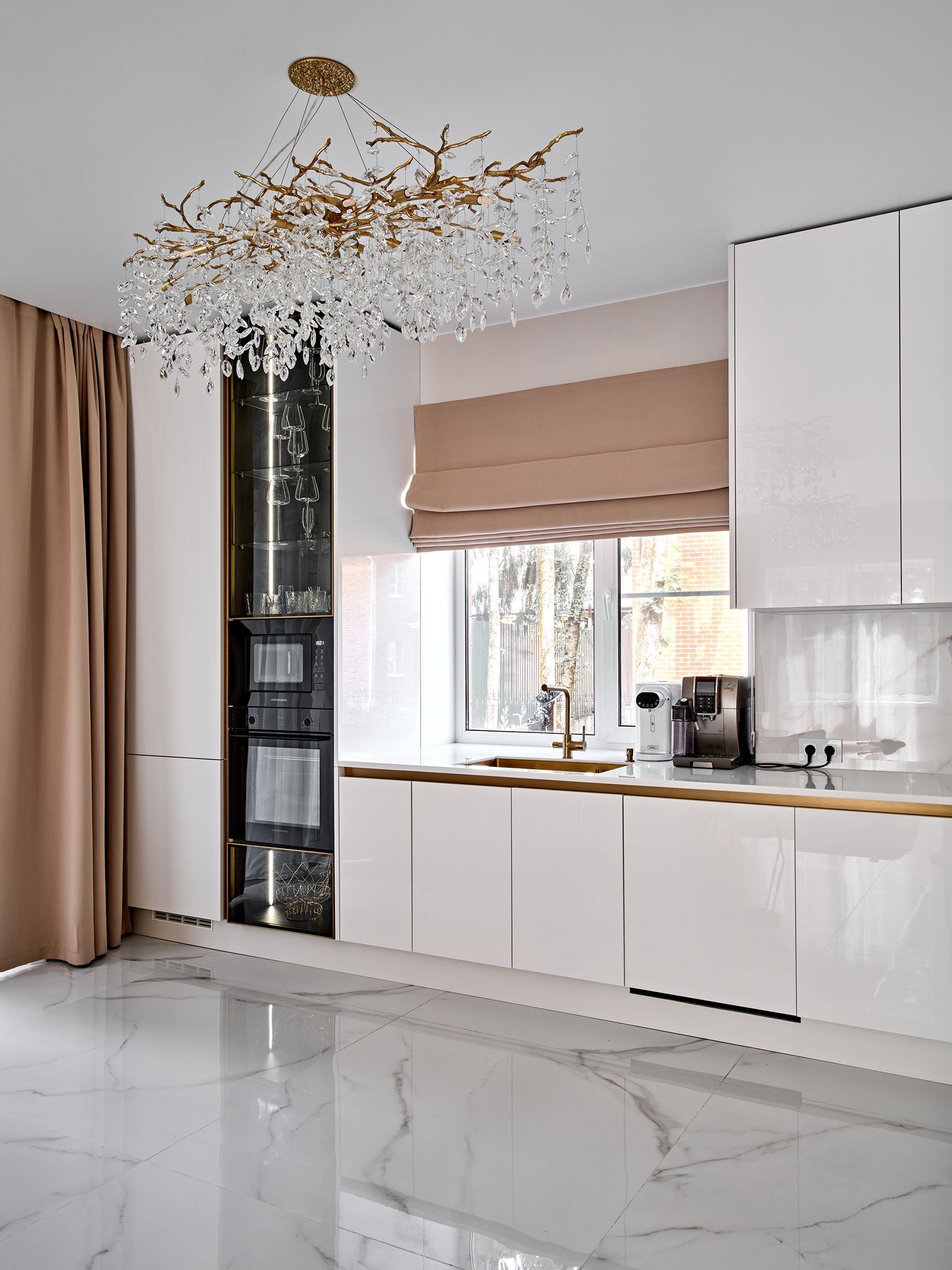 Угловая компоновка кухни с высокими шкафами до потолка создает максимальное количество мест для хранения посуды и кухонных принадлежностей. Особое внимание привлекает эффектный шкаф-витрина с внутренней подсветкой. Фасады со стеклом, обрамленные профилем золотистого оттенка, выразительно контрастируют с белоснежным глянцем гарнитура.