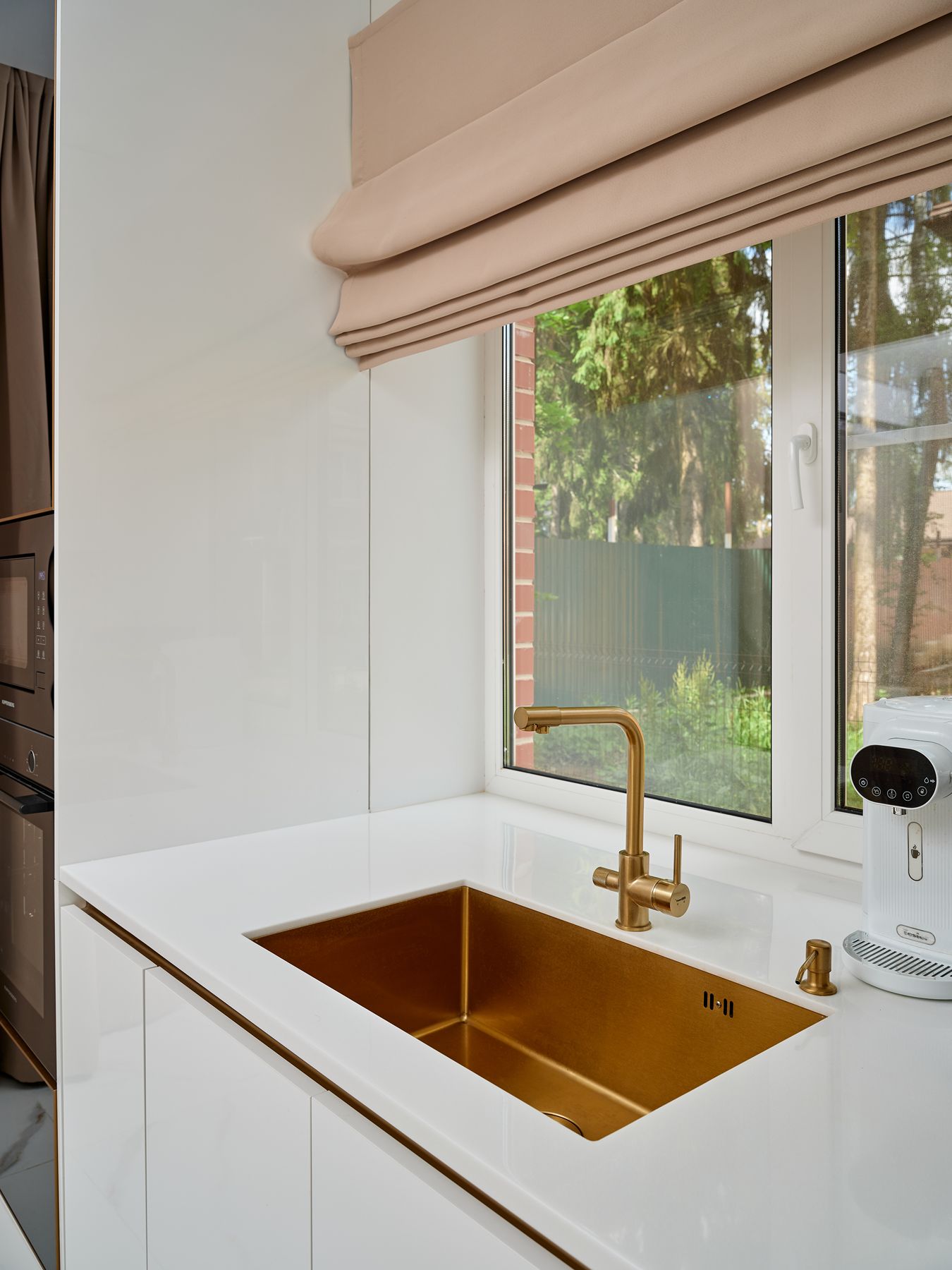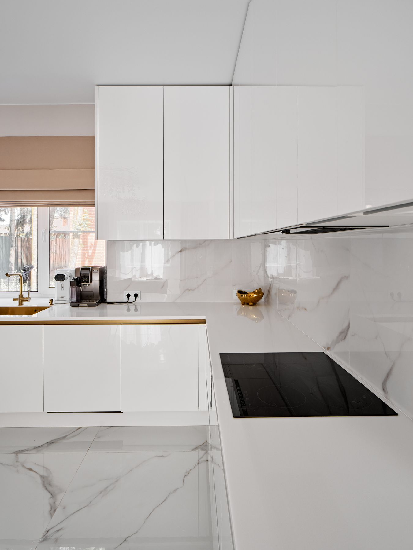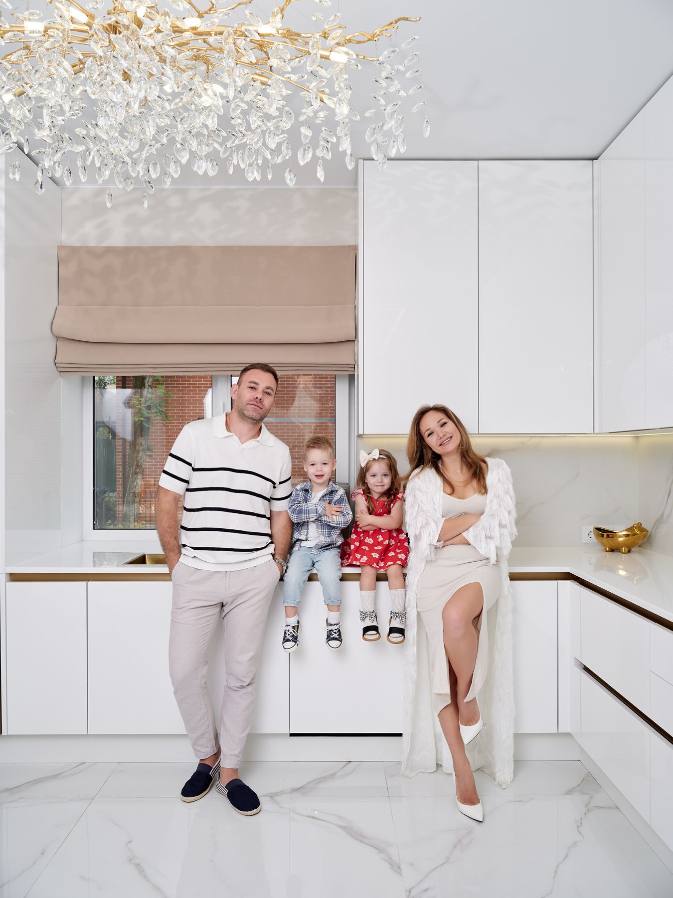 Изначально супруги мечтали о кухне цвета «кашемир», однако вскоре поняли, что идеальным решением станет белоснежный глянец. Этот цвет гармонично вписался в общий интерьер дома, где преобладают светлые тона, подчеркнутые роскошными элементами золотого и чёрного цветов. Выбор пал на модель Mix 22 цвета «белый премиум».
