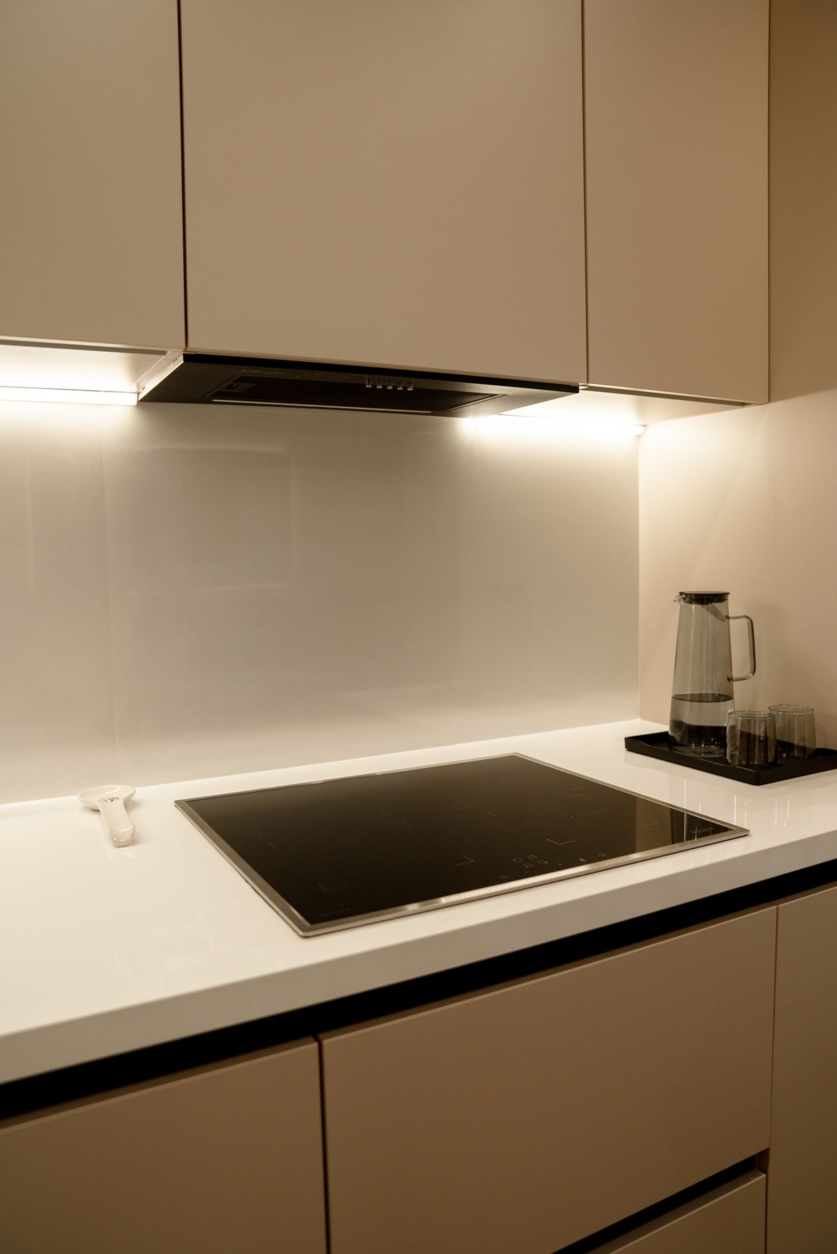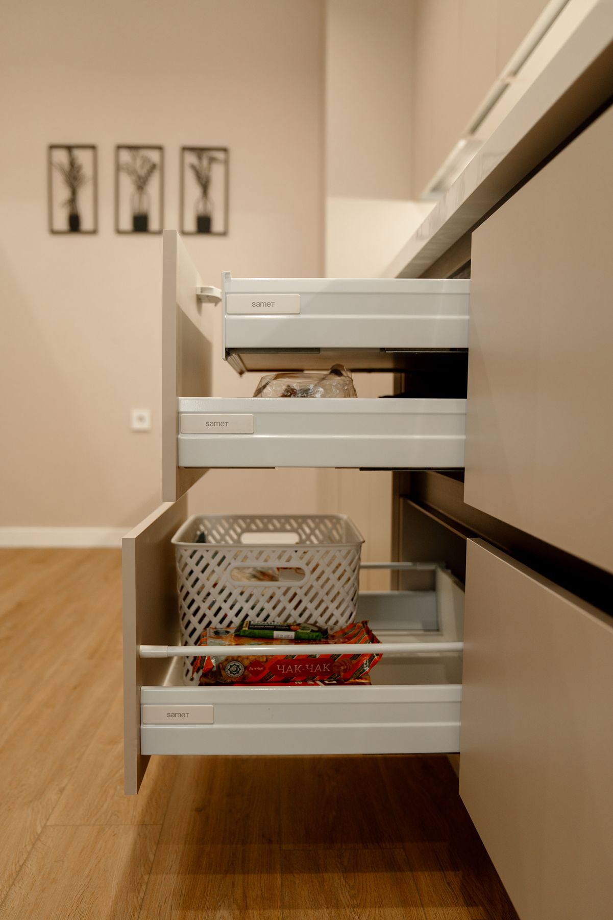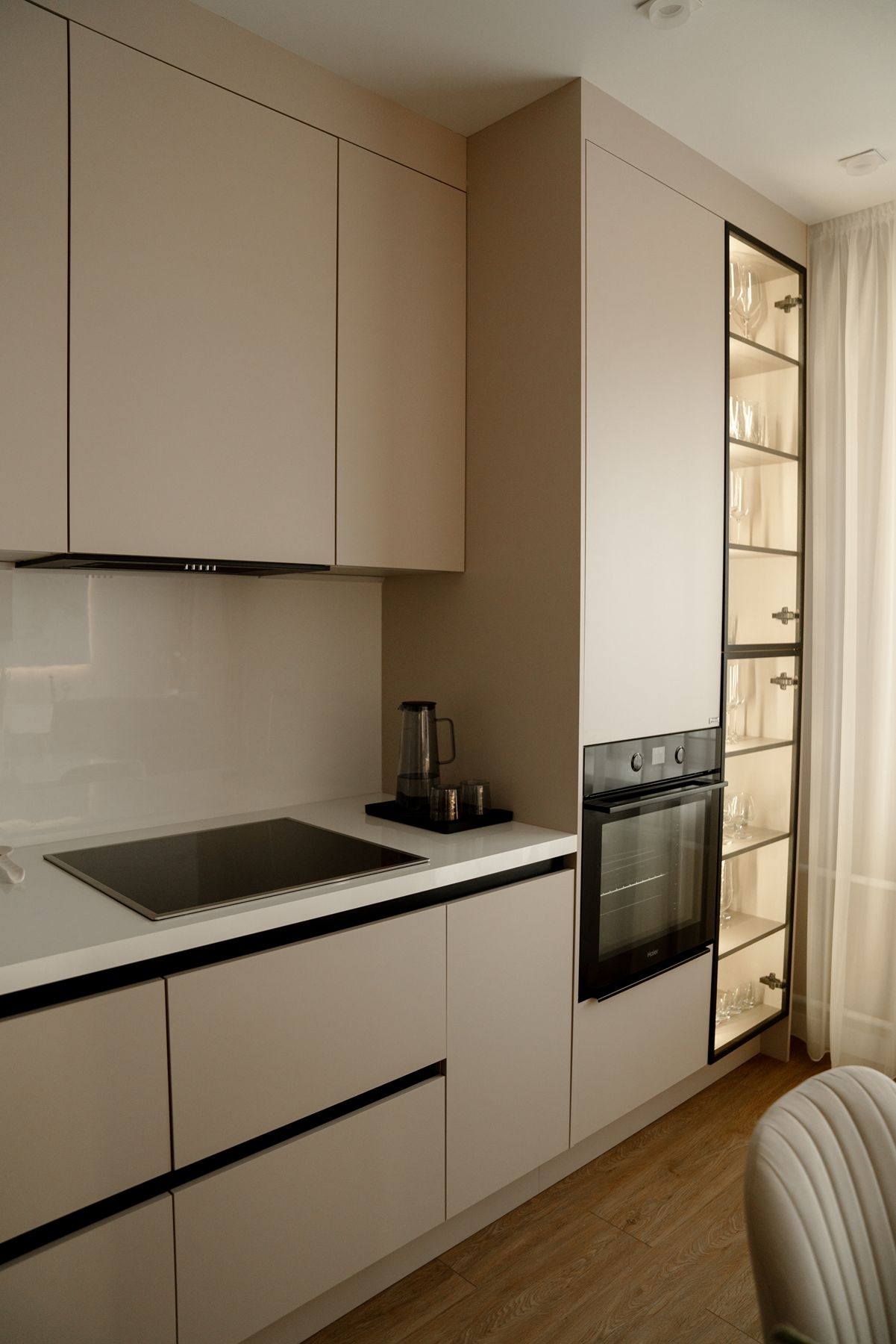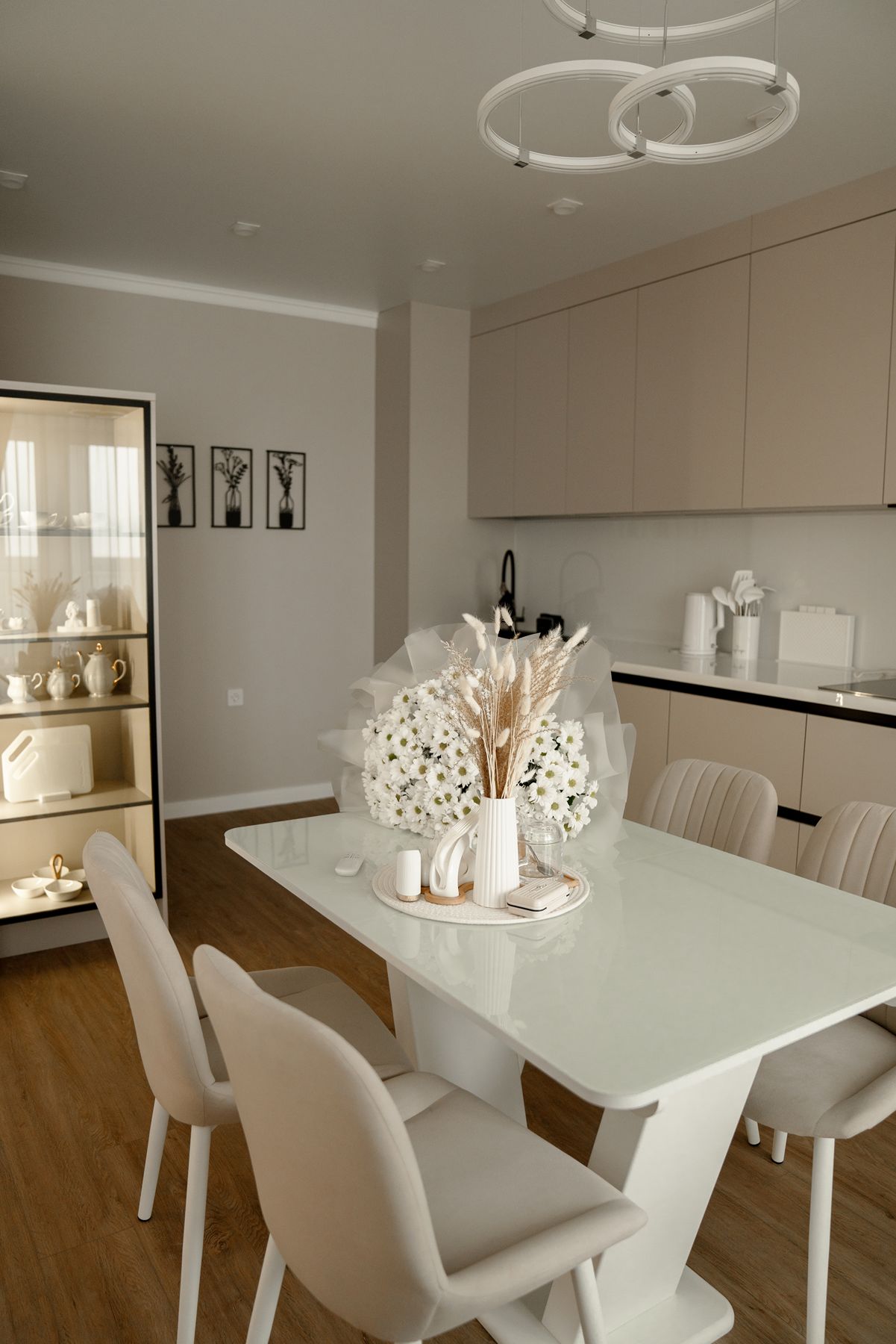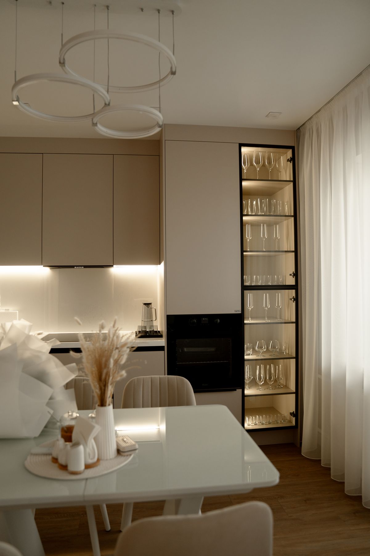 Цвет «кашемир» выбрали осознанно, поскольку он прекрасно сочетается с общим интерьером помещения, дополняя оттенок стен, мягкой мебели и штор. Глянцевая столешница белого цвета освежает пространство, делает его воздушным и нежным.