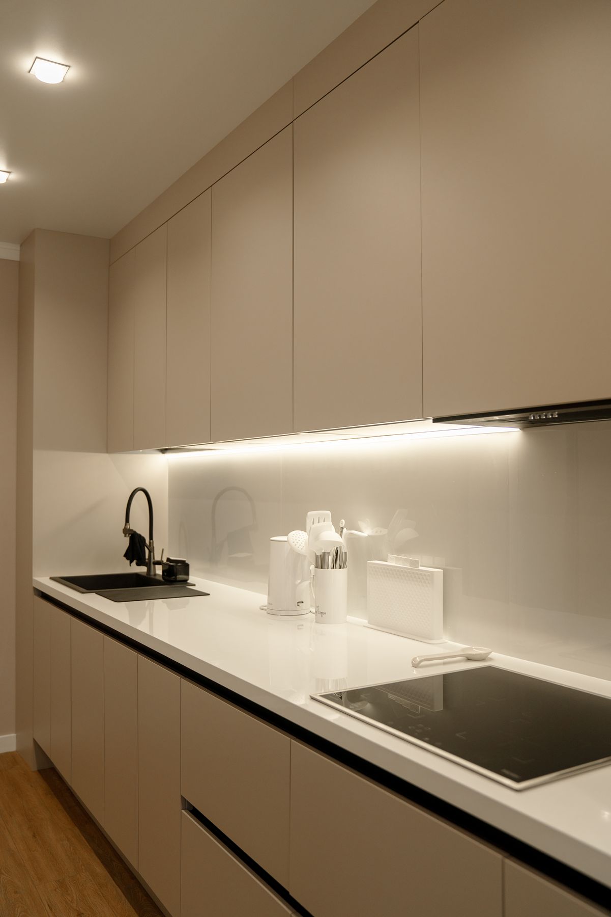 О проектеОписаниеКлиентка обратилась в студию «Мария» с четким представлением о своей будущей кухне: она должна быть лаконичной, в нежной цветовой гамме и с белоснежной столешницей. Дизайнер предложил ей минималистичную модель Tokyo, пользующуюся особой популярностью среди покупателей.