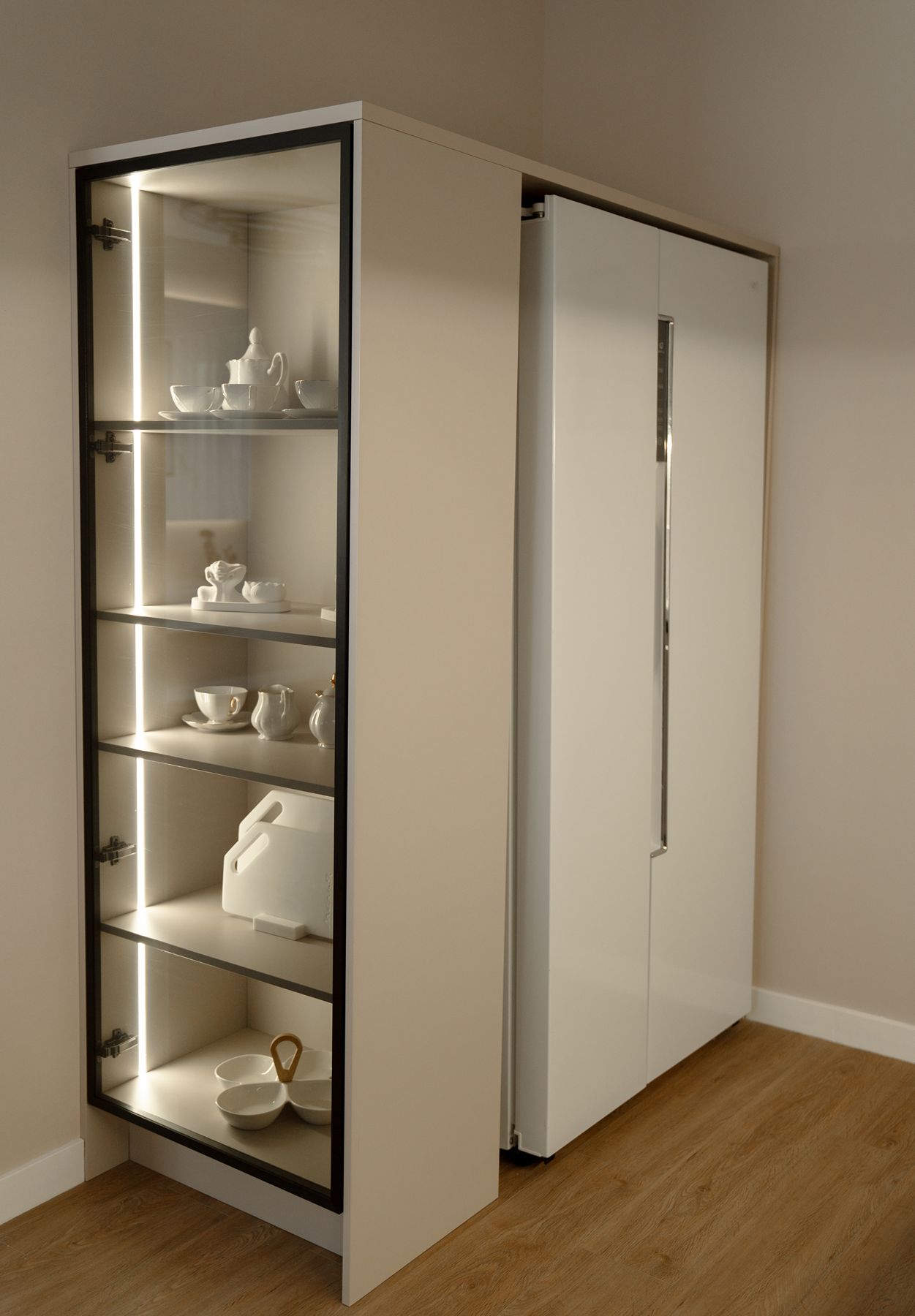 Первоначально заказчики хотели сделать планировку кухни угловой, однако профессиональный взгляд дизайнера подсказал другое решение, которое пришлось семье по душе. Для удобства хозяйки, обожающей готовить, была выбрана линейная планировка с увеличенной до 70 см глубиной столешницы. Вместительный холодильник разместили напротив основного ряда, по соседству с высоким шкафом-витриной с подсветкой.