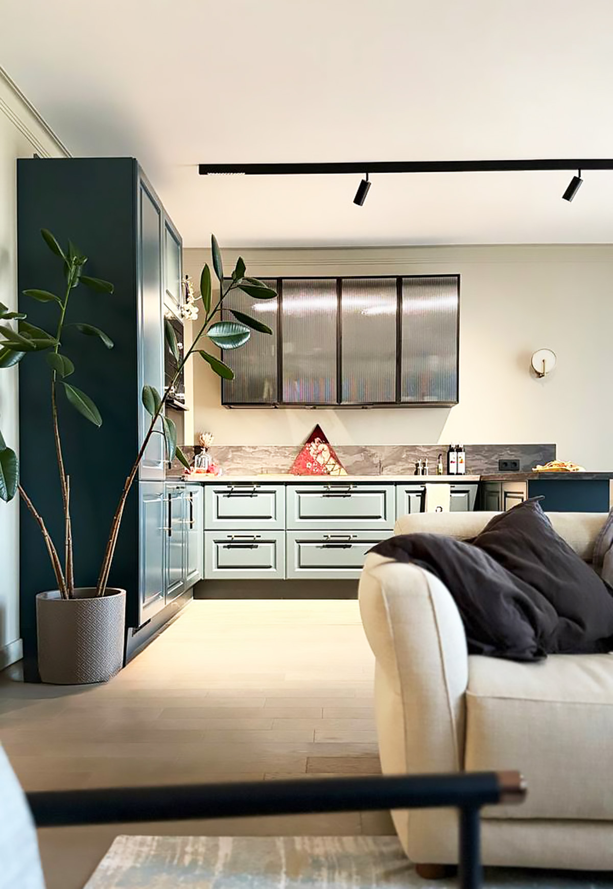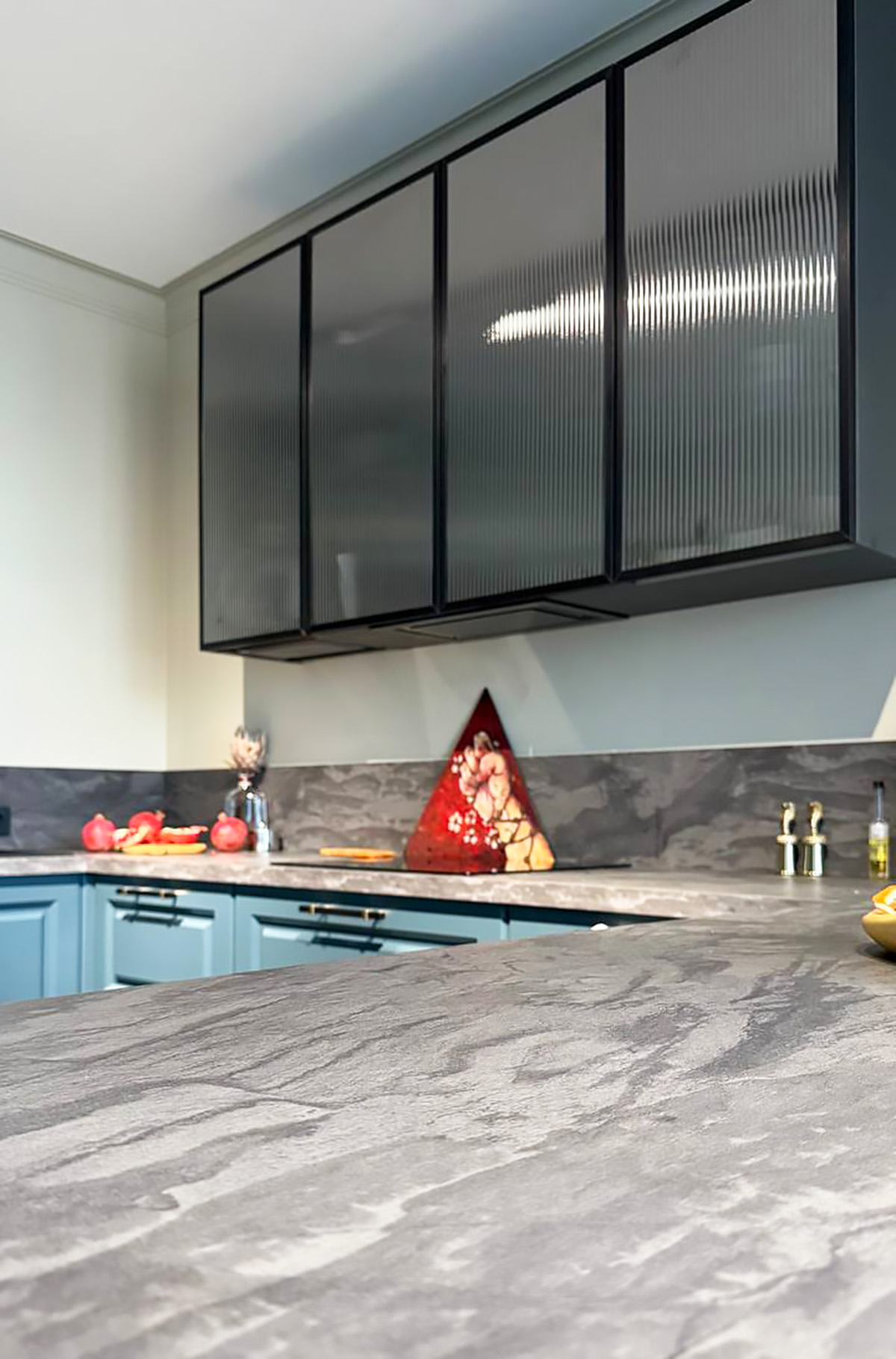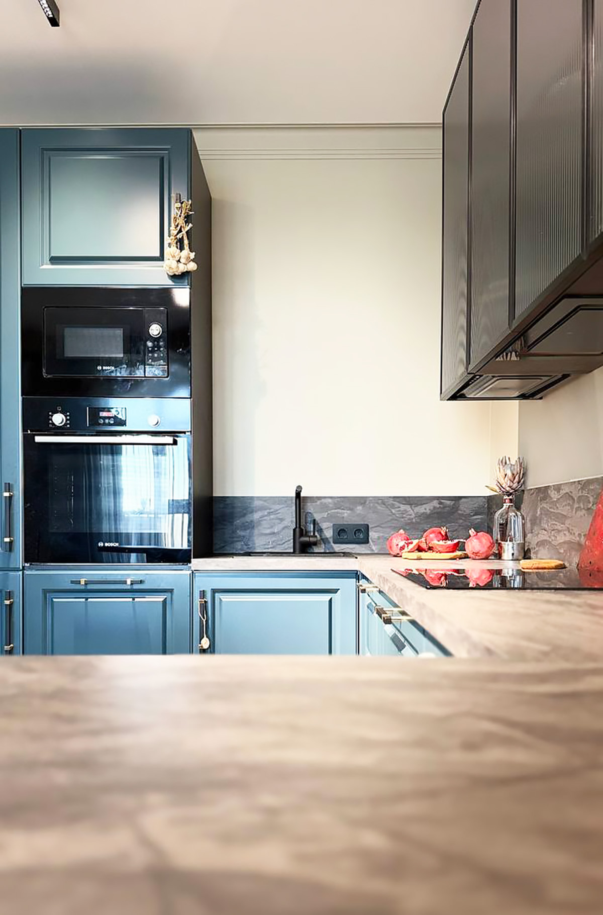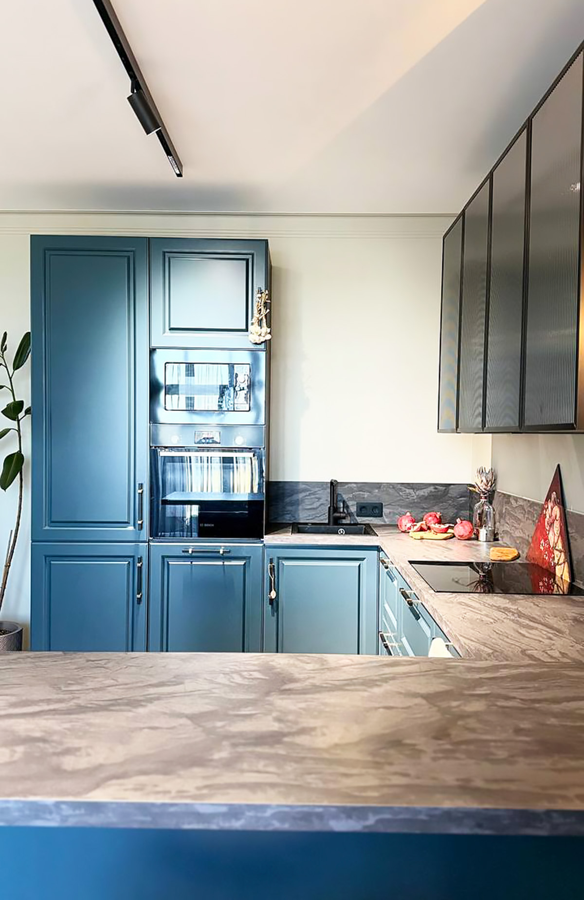 Стеклянные вставки на фоне синих фасадов делают кухню визуально привлекательной. Мягкий матовый отблеск эмали подчеркивает качество и изысканность деталей. Благодаря сочетанию холодных оттенков синего и теплых текстур помещение становится максимально уютным.