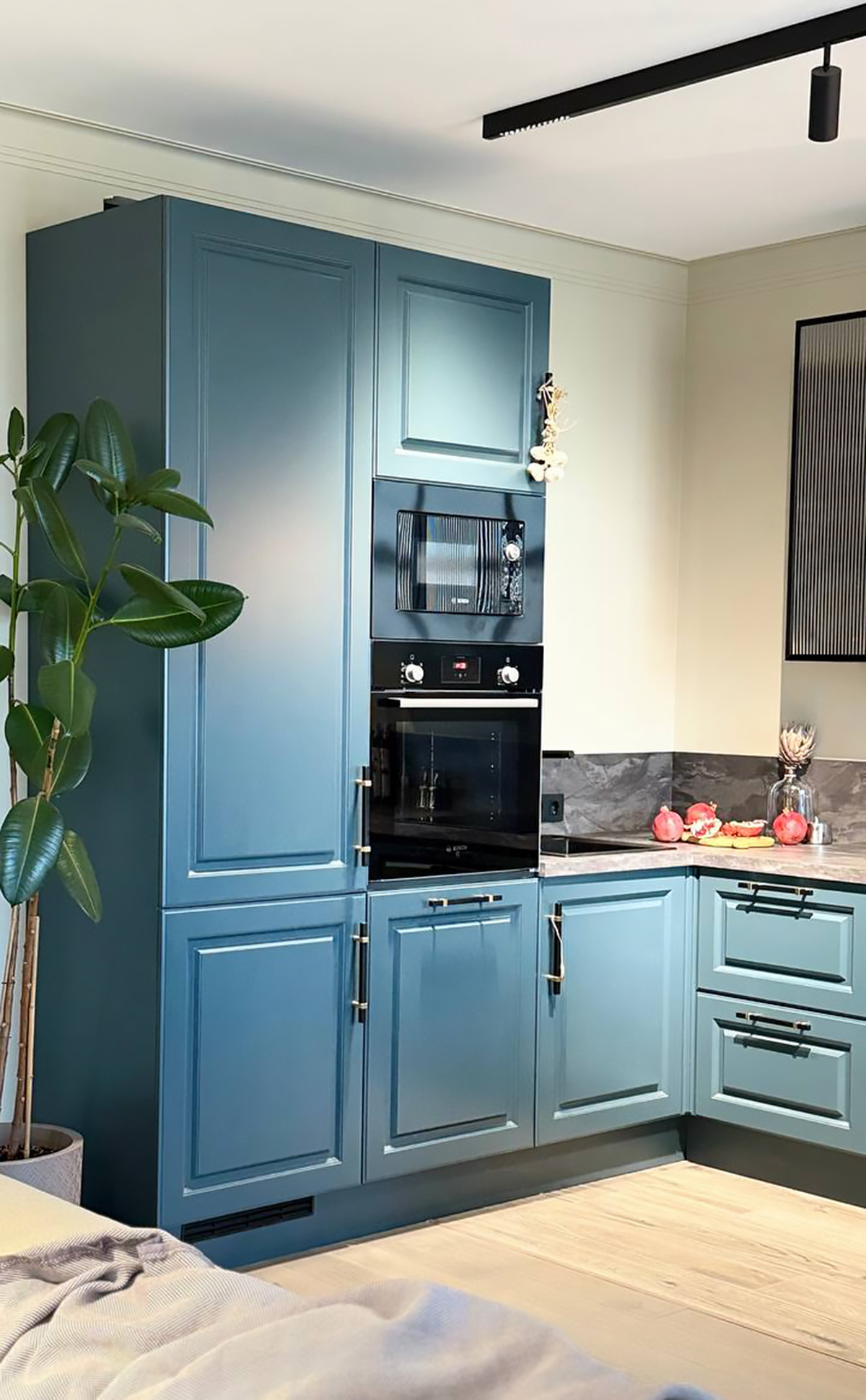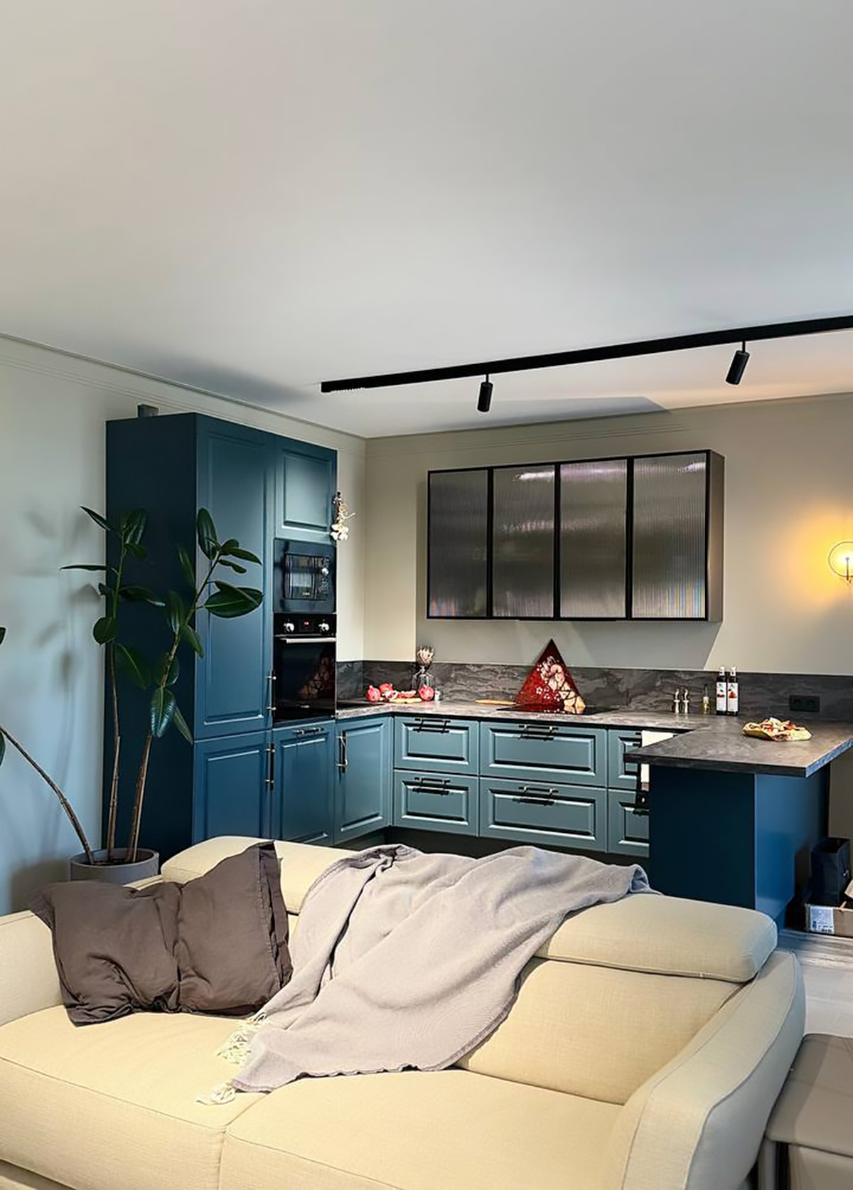 О проектеОписаниеКухня Nicolle выполнена в эмали синего оттенка, что придаёт интерьеру уникальность. Это решение отлично вписывается в современный дизайн, сочетающий разные стили. Контрастность материалов и фактур создаёт стильное пространство.
