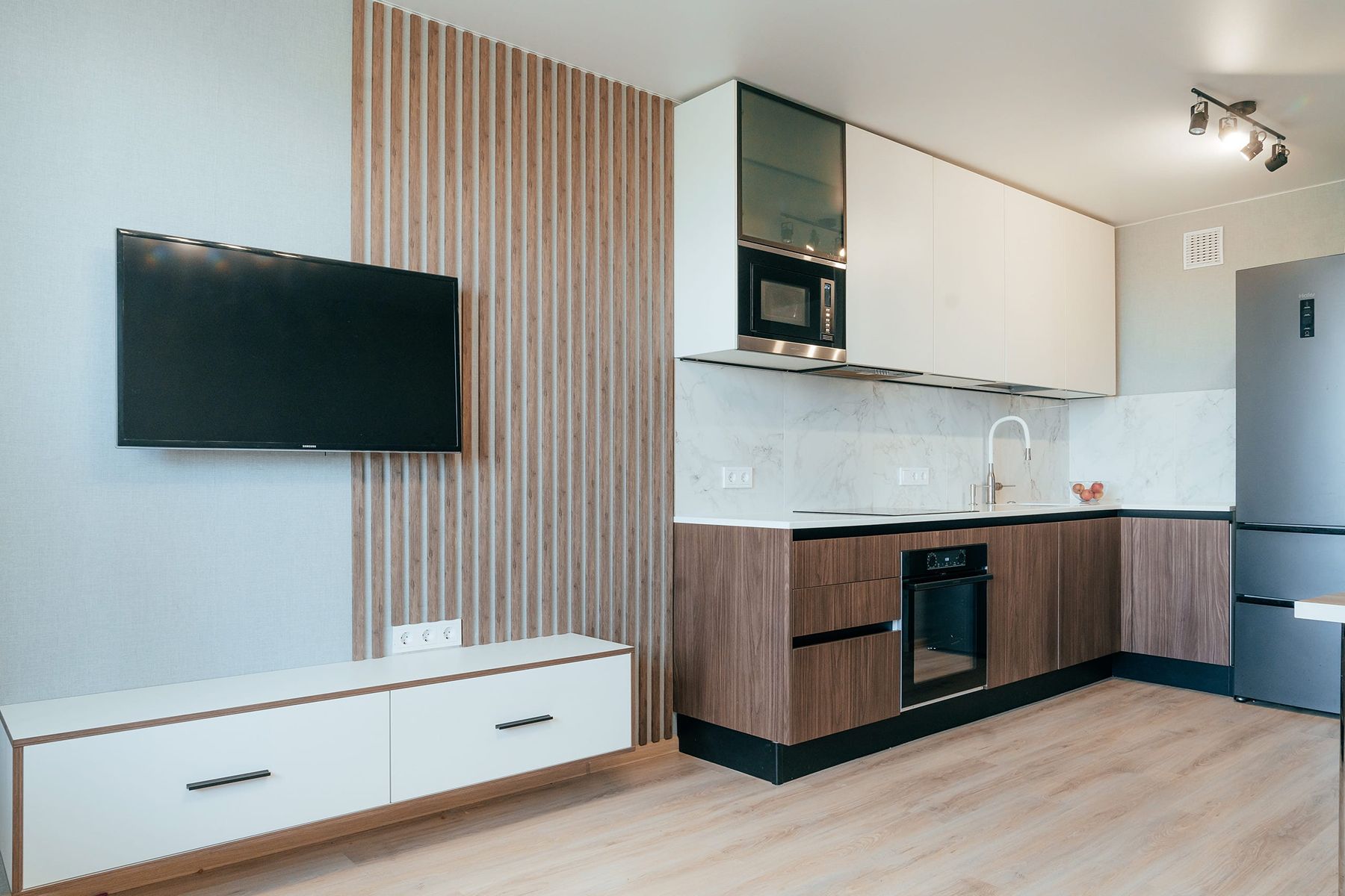 ТВ-зона объединена с гарнитуром с помощью декоративных реек.