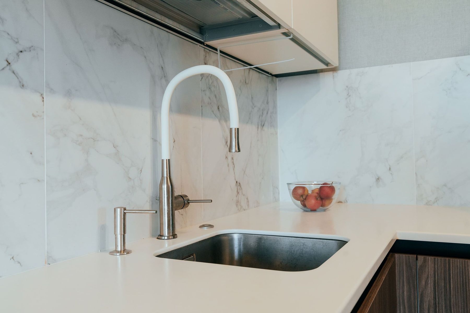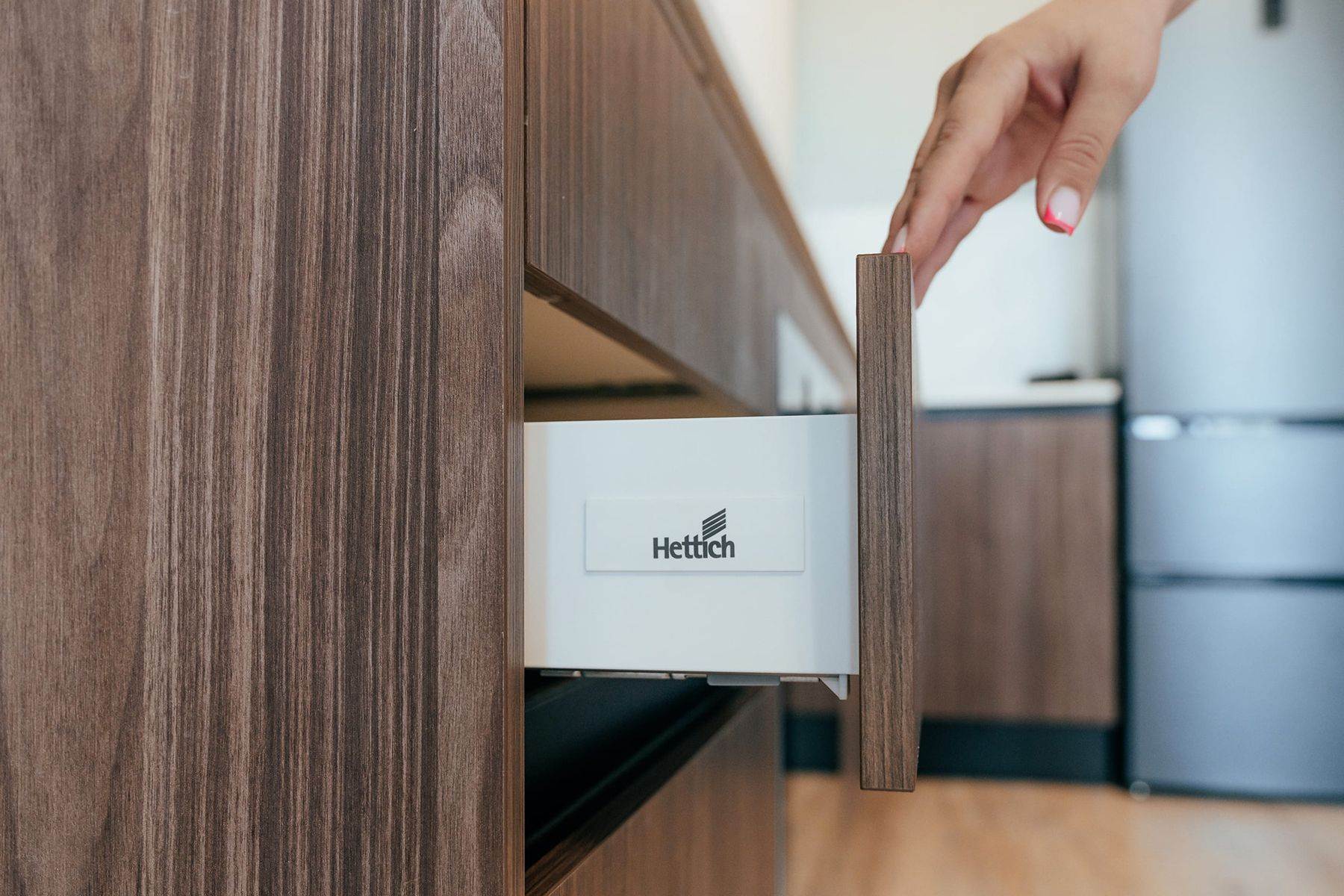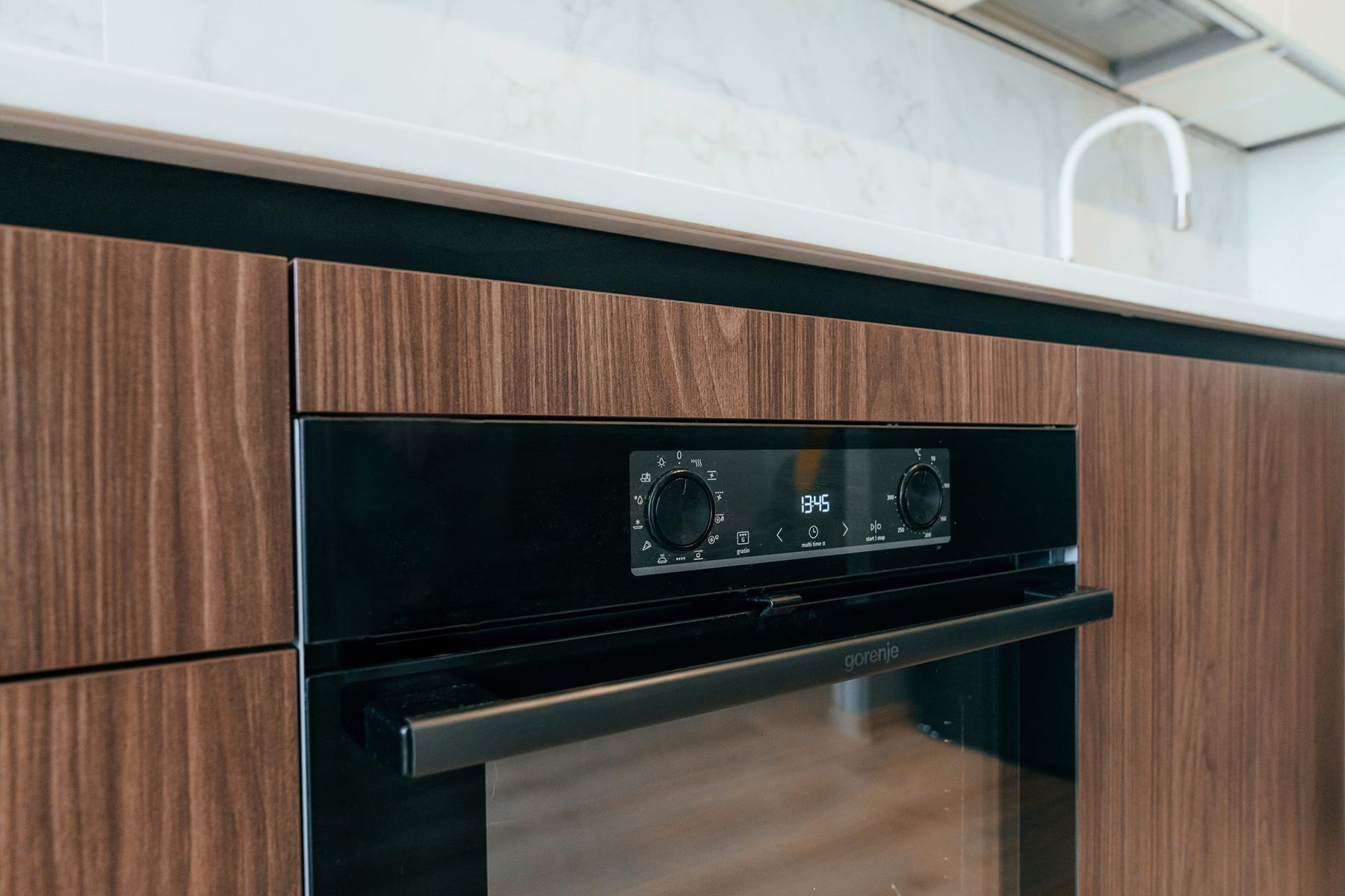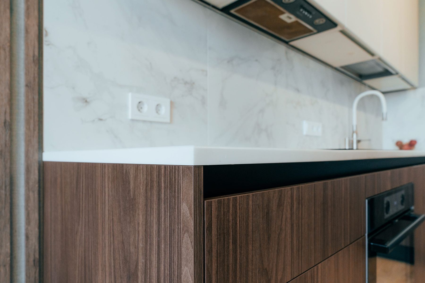 Верхние секции выполнены в светлых тонах, чтобы не перегружать пространство. Нижние секции сделаны в древесных оттенках, что добавило помещению уюта. Столешница изготовлена из искусственного камня.