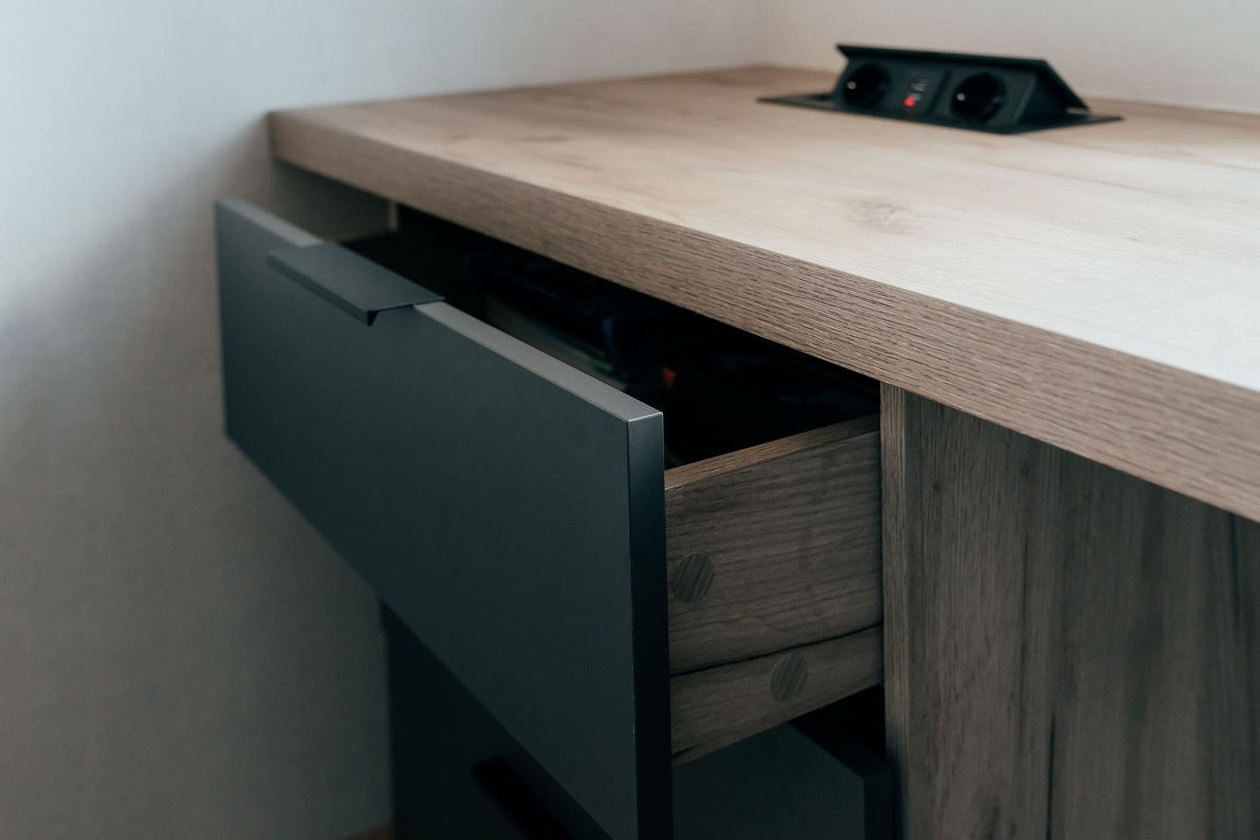 Конечно, есть в детской и большой стол, где можно делать уроки, играть, заниматься творчеством. Для возможности зарядки телефона или ноутбука встроили в столешницу розетку.