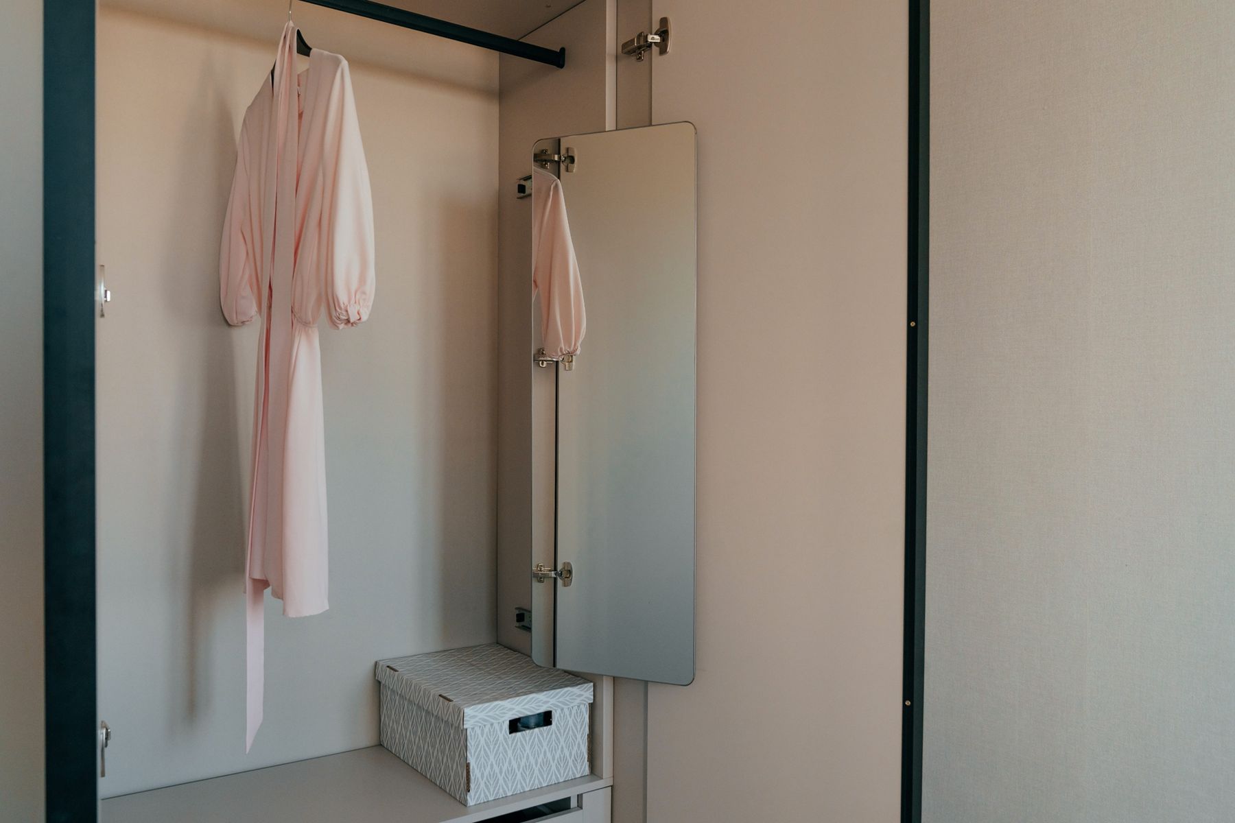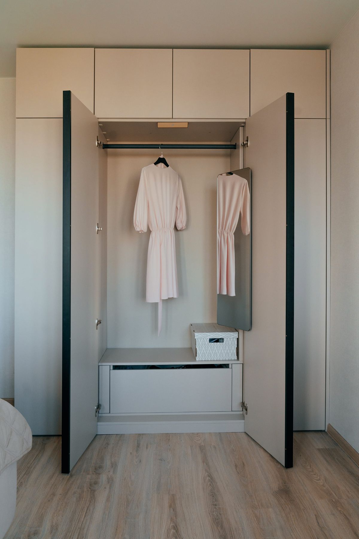 Основной упор сделан на полки для хранения одежды. Центральная часть – штанга под вешалки. В шкафу спрятано выдвижное зеркало. Снизу есть ящик для постельных принадлежностей.