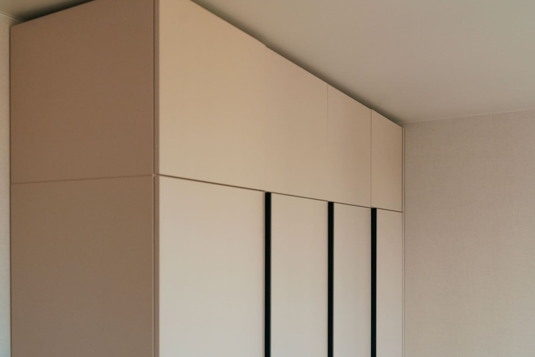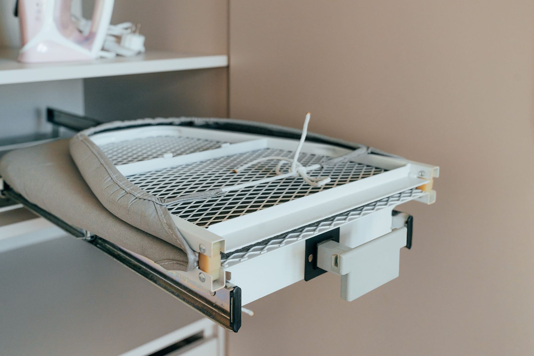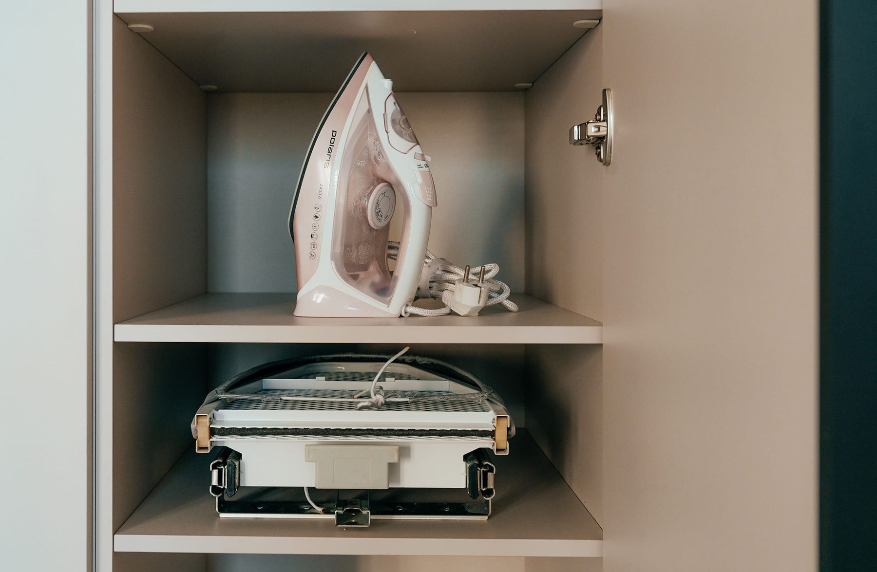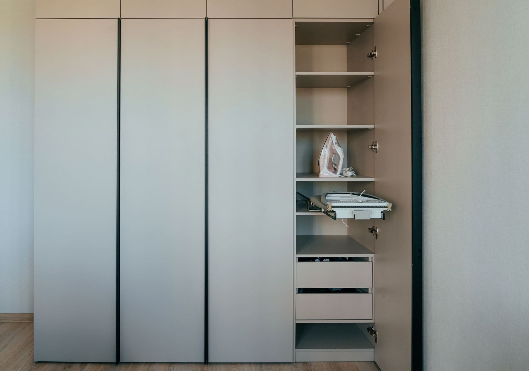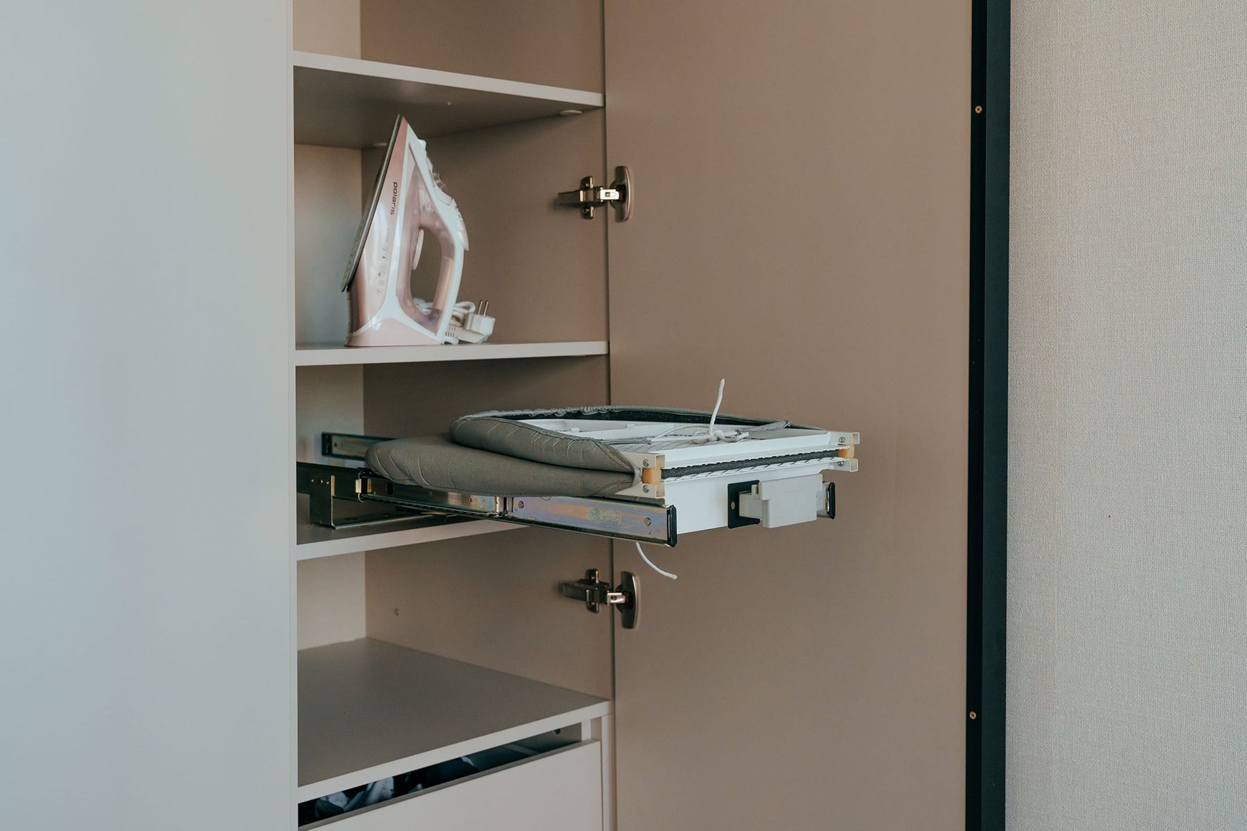 Также внутри спрятали выдвижную гладильную доску с утюгом. Добавили торцевые ручки во всю высоту для удобства открывания.