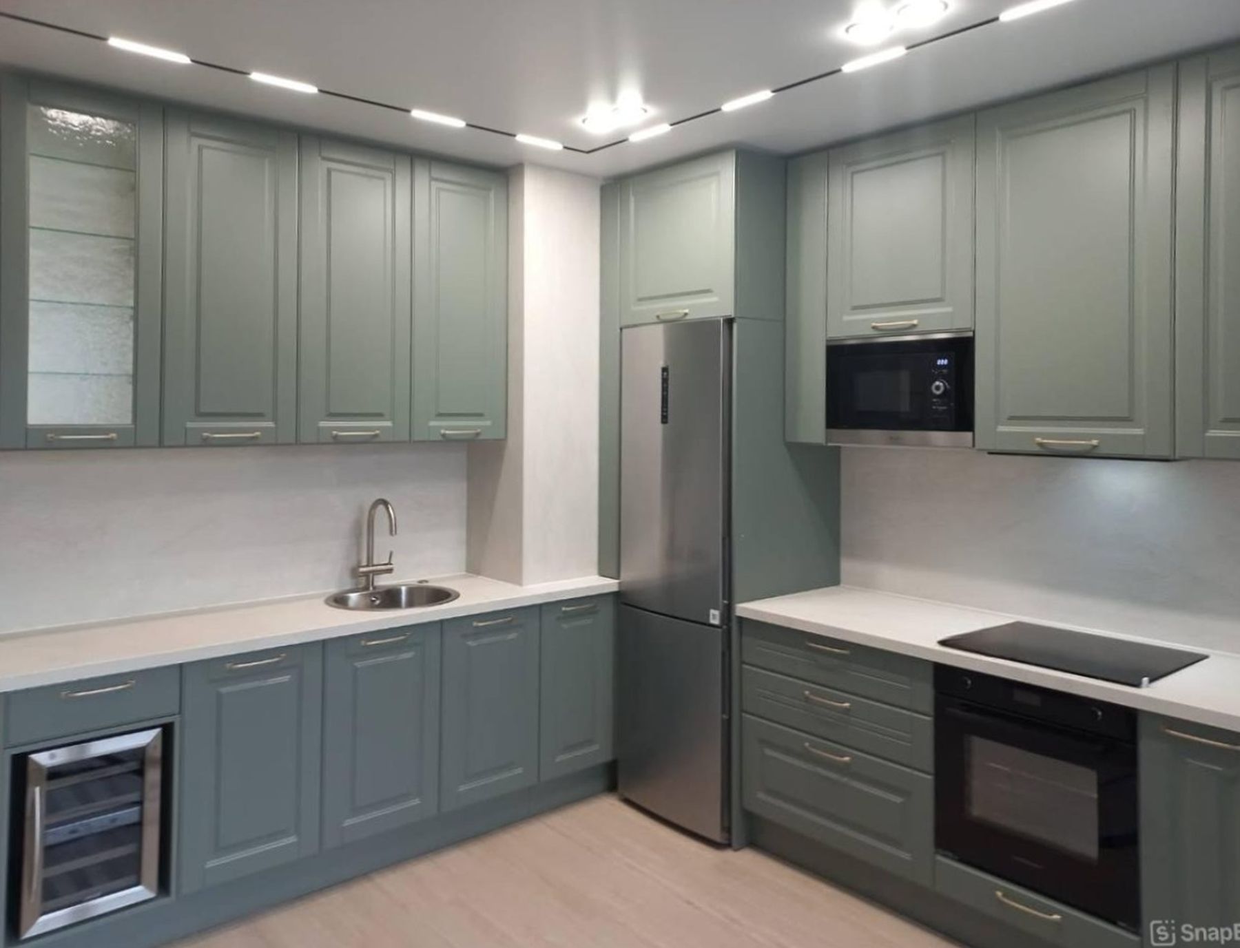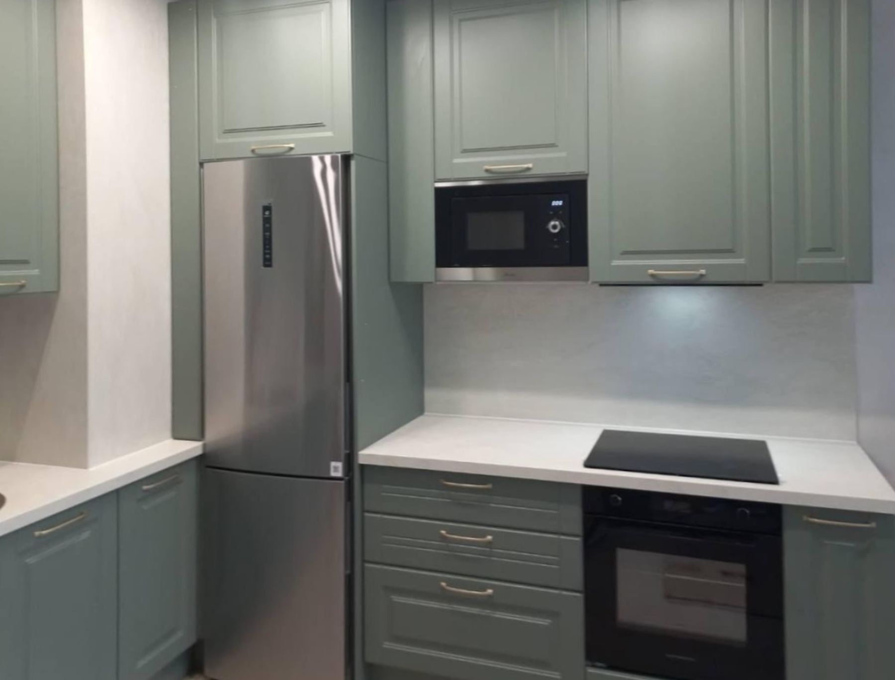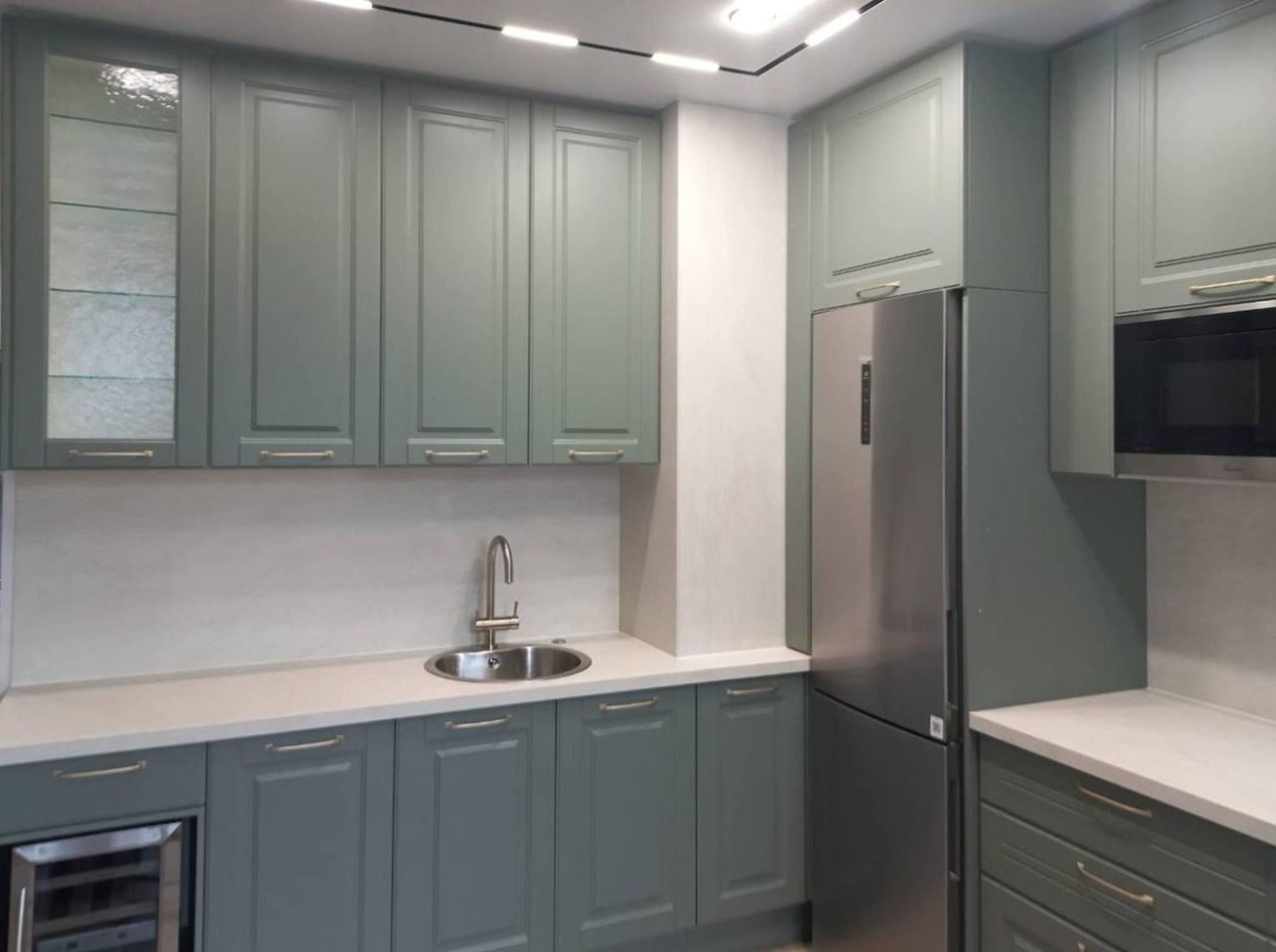 О проектеОписаниеГлавной задачей проекта было спрятать технику и вентиляционный короб. В качестве цветовой гаммы выбран серо-зеленый оттенок фасадов и белая столешница со стеновой панелью. Технику спрятали в короба и встроили в кухню.
