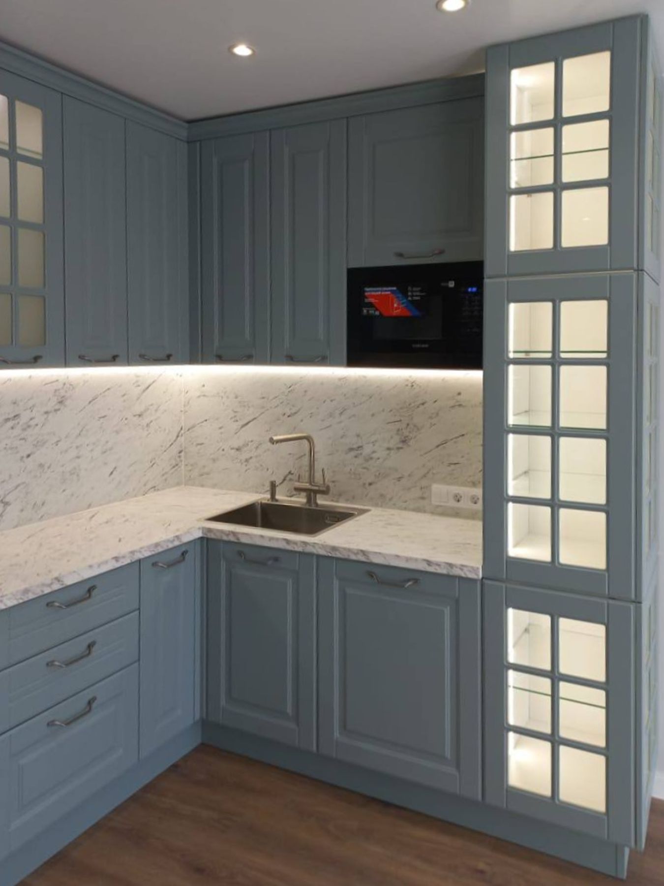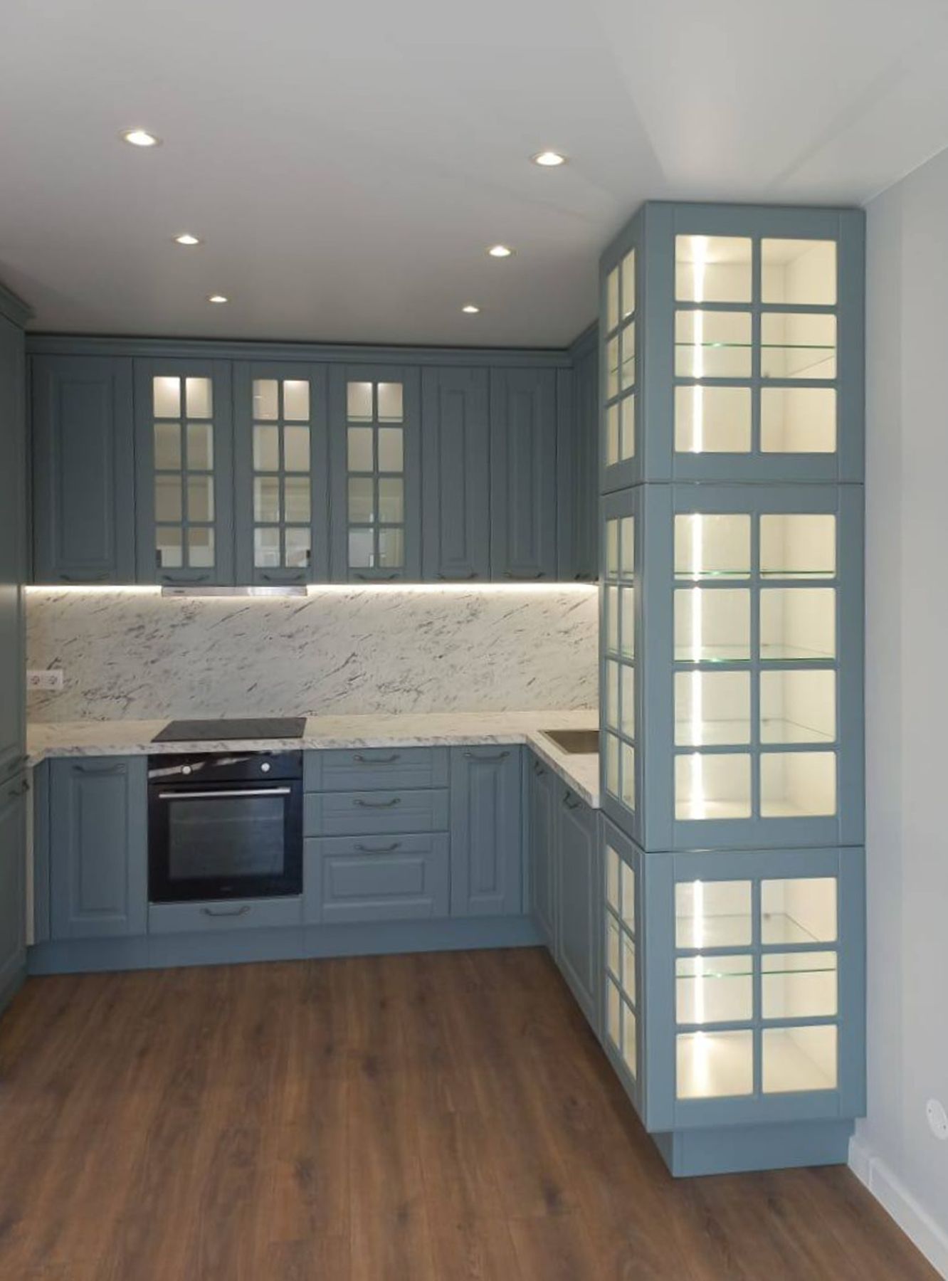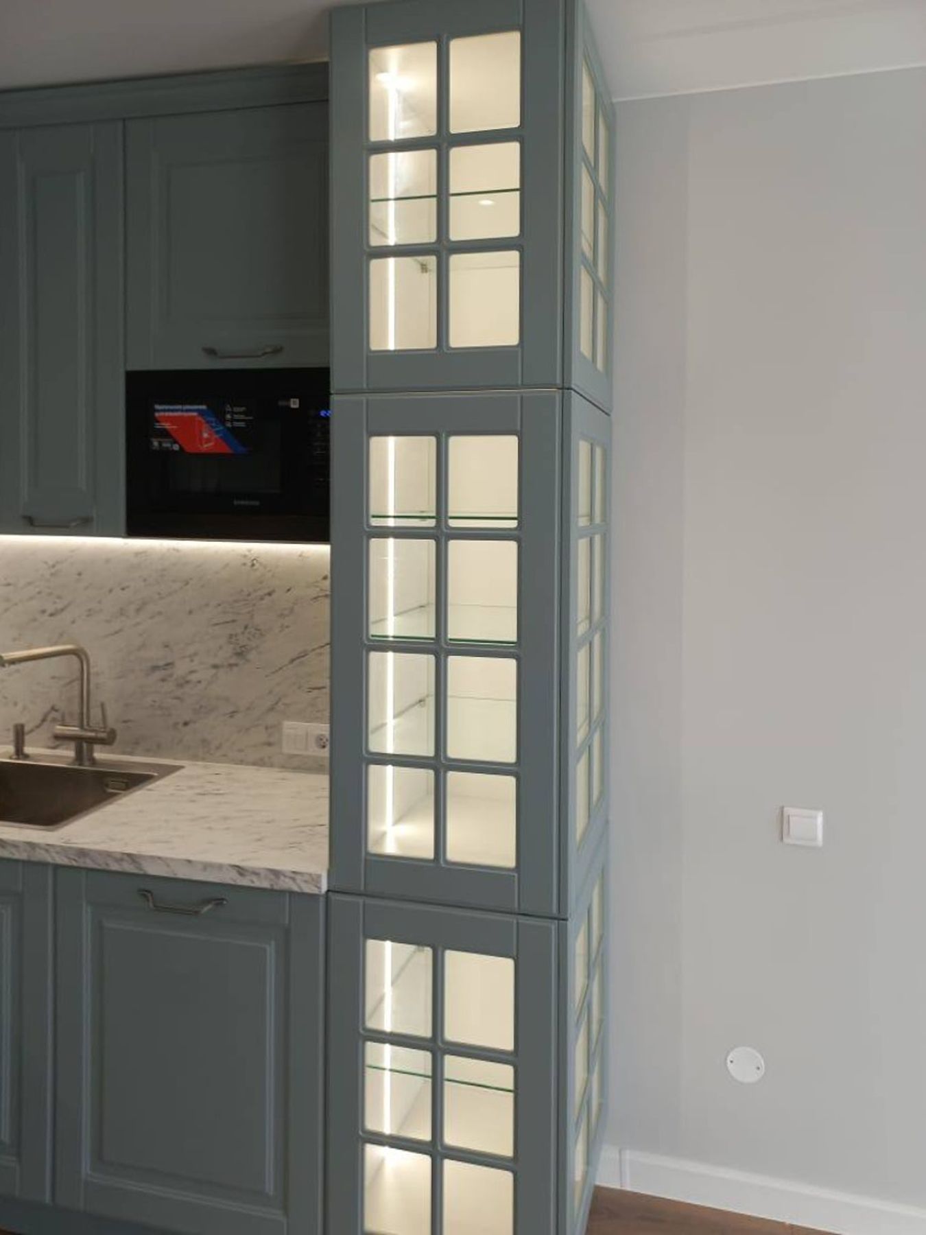 О проектеОписаниеОсновной задачей было спроектировать П-образный гарнитур и сделать акцент на витражах. Кухня оснащена большой рабочей зоной, подсветкой стеклянных полок. Цвет фасадов подобран в соответствии с цветовой гаммой остальной мебели.