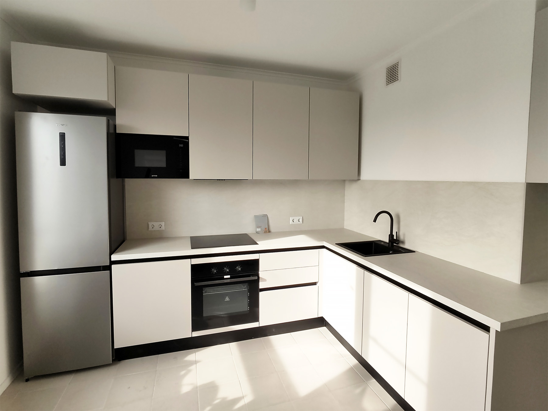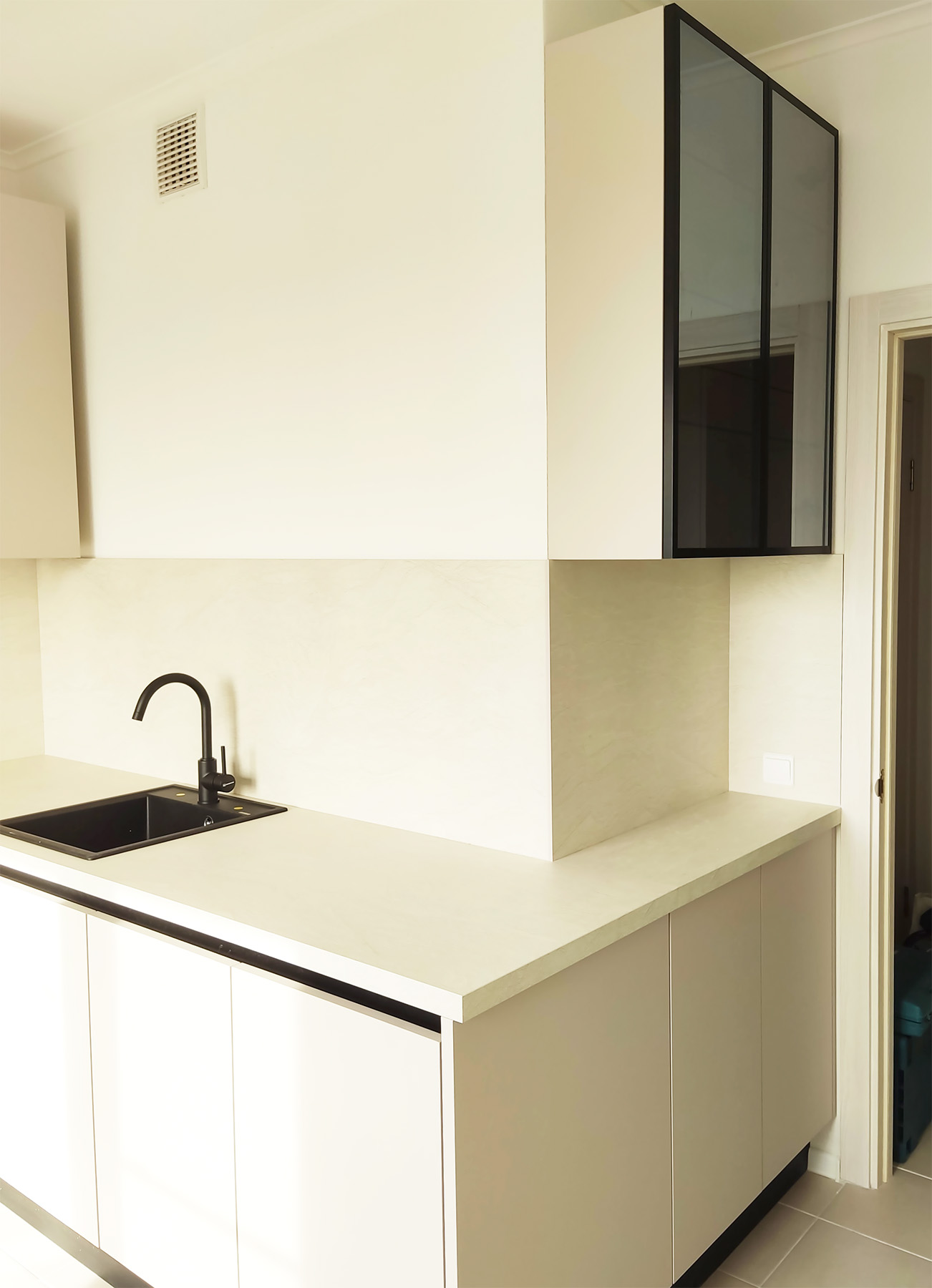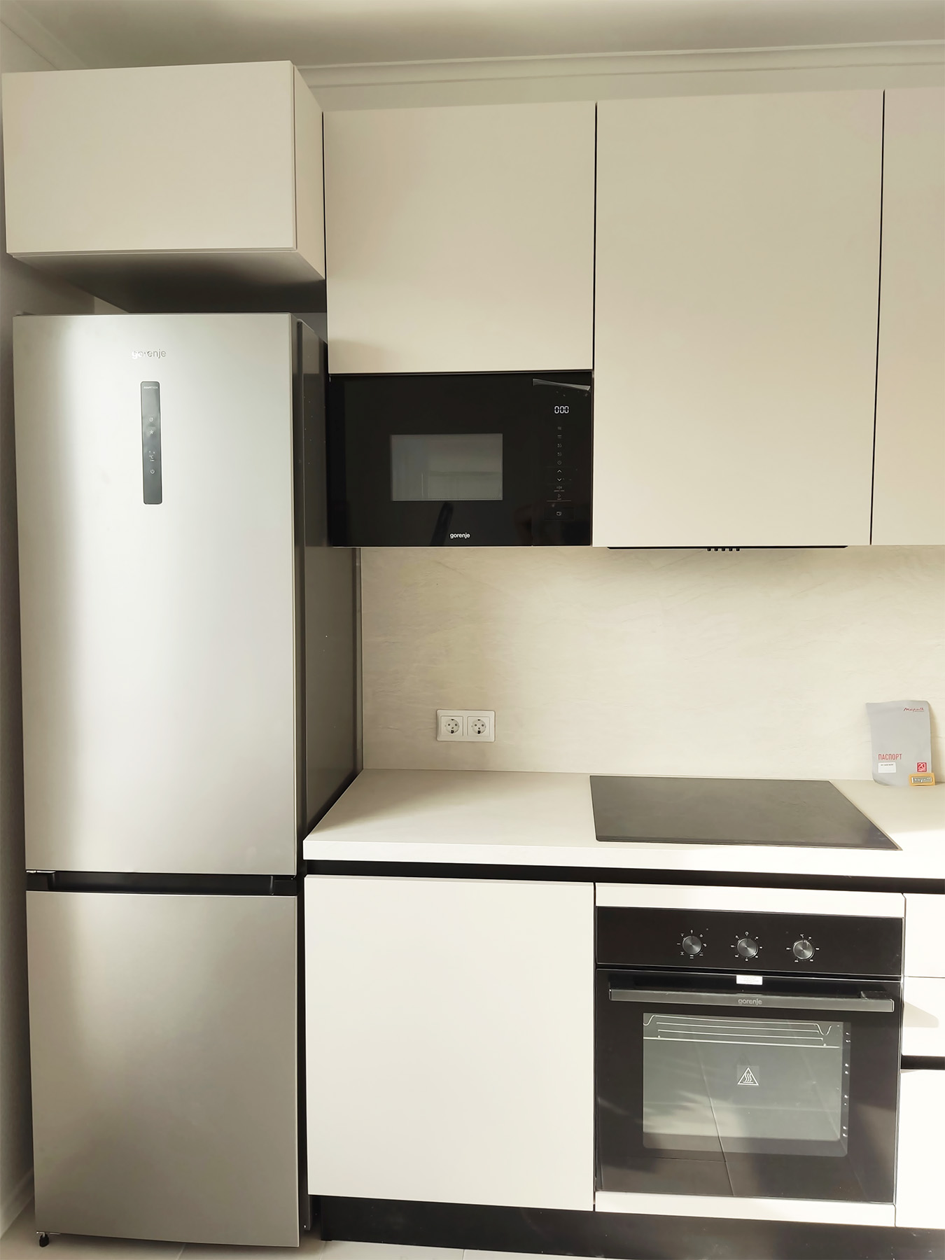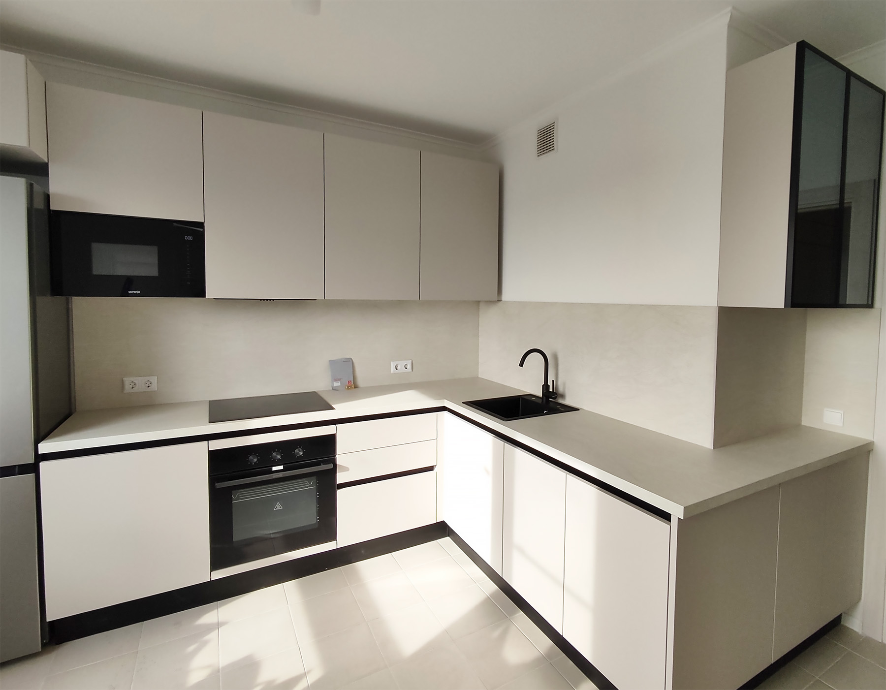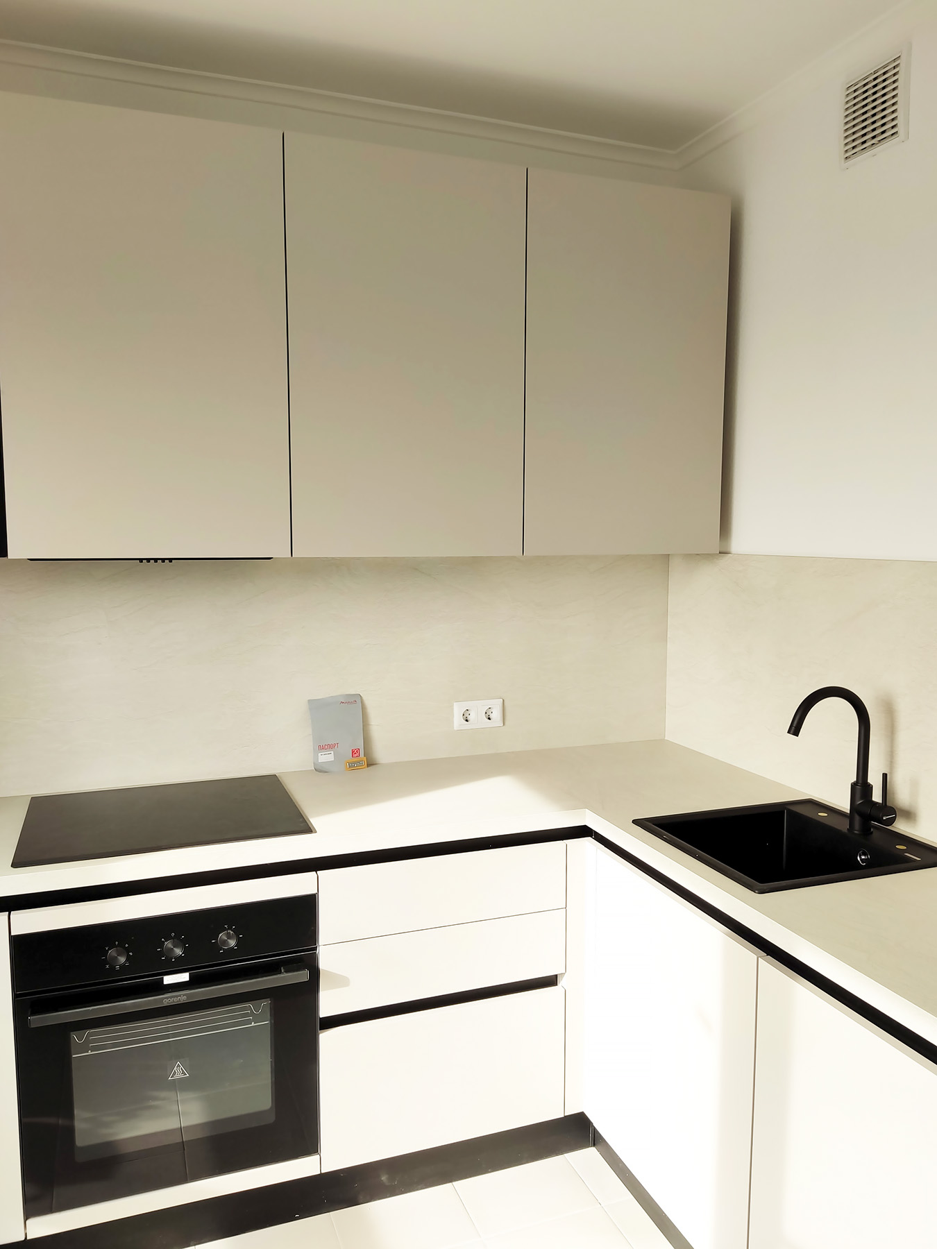 О проектеОписаниеЭта кухня не кричит — она шепчет. Один цвет. Два акцента. Максимум света. Фасады кашемир, чёрные детали, мягкий оттенок стен — всё работает на спокойствие и уют.