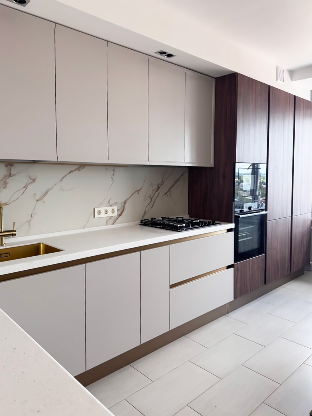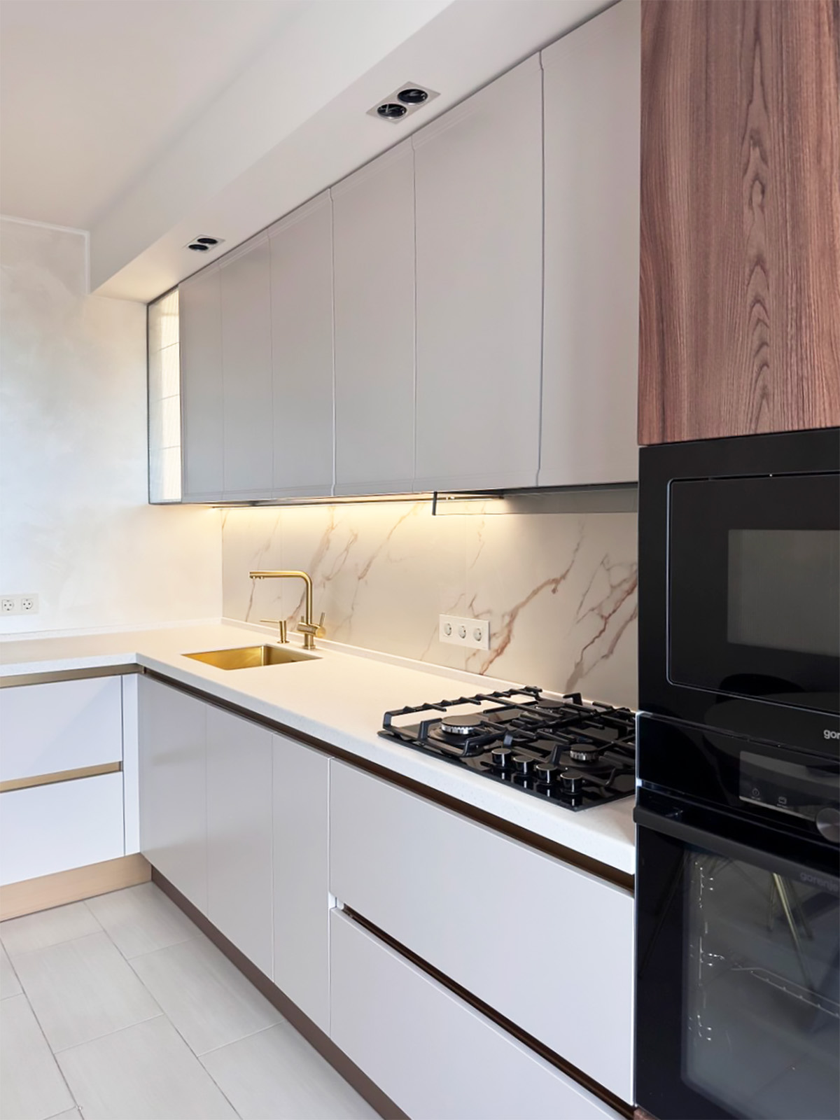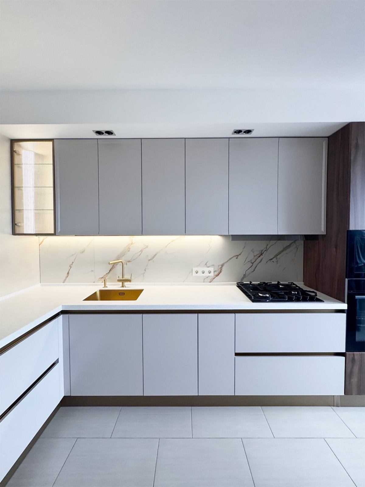 В интерьере использованы спокойные тона, что создает уютную и гармоничную атмосферу. Акценты в цвете «матовое золото» и теплые натуральные оттенки дерева придают кухне элегантный и стильный вид. Подсветка идеально подчеркивает дизайн и создает приятное освещение.