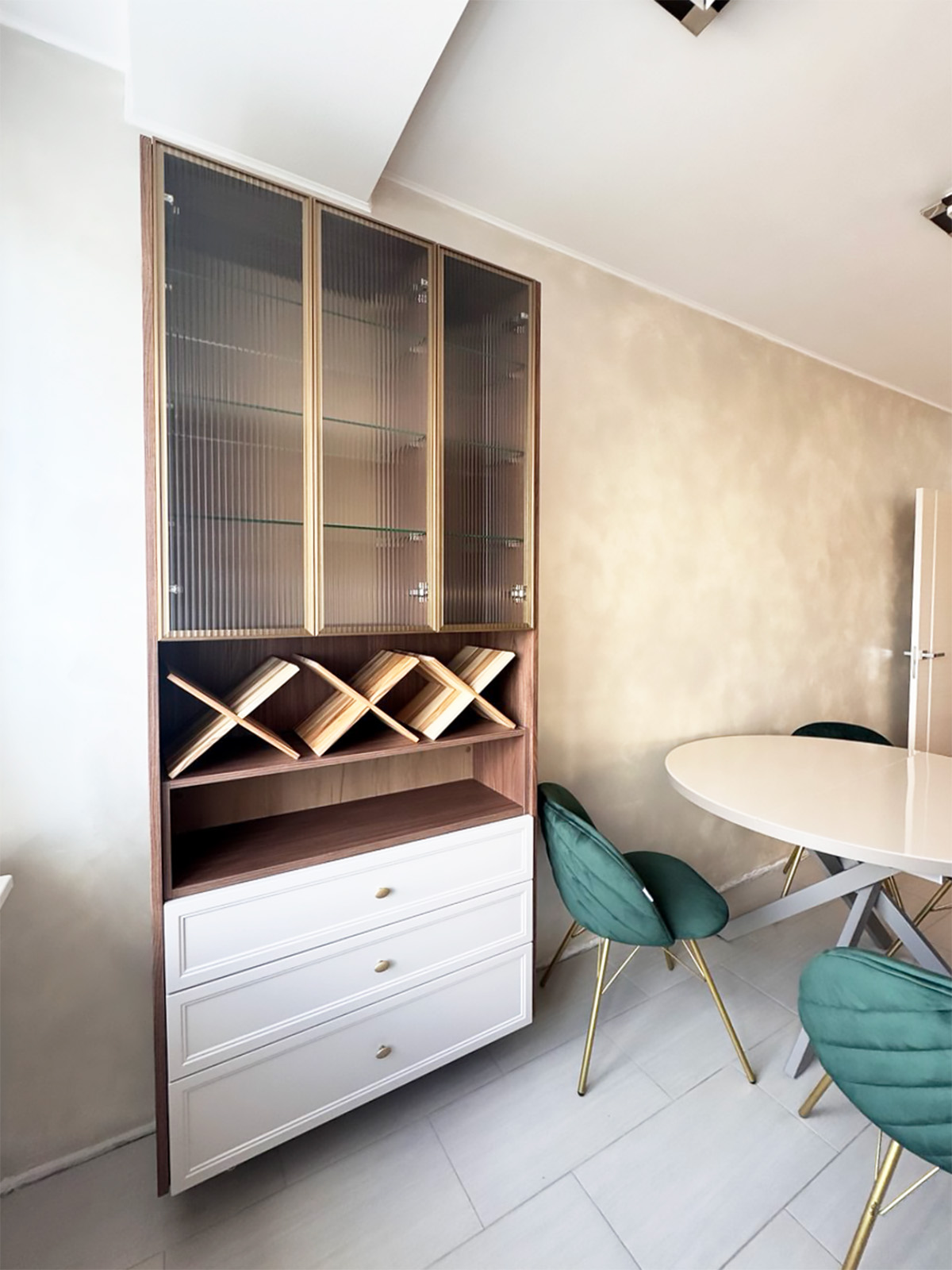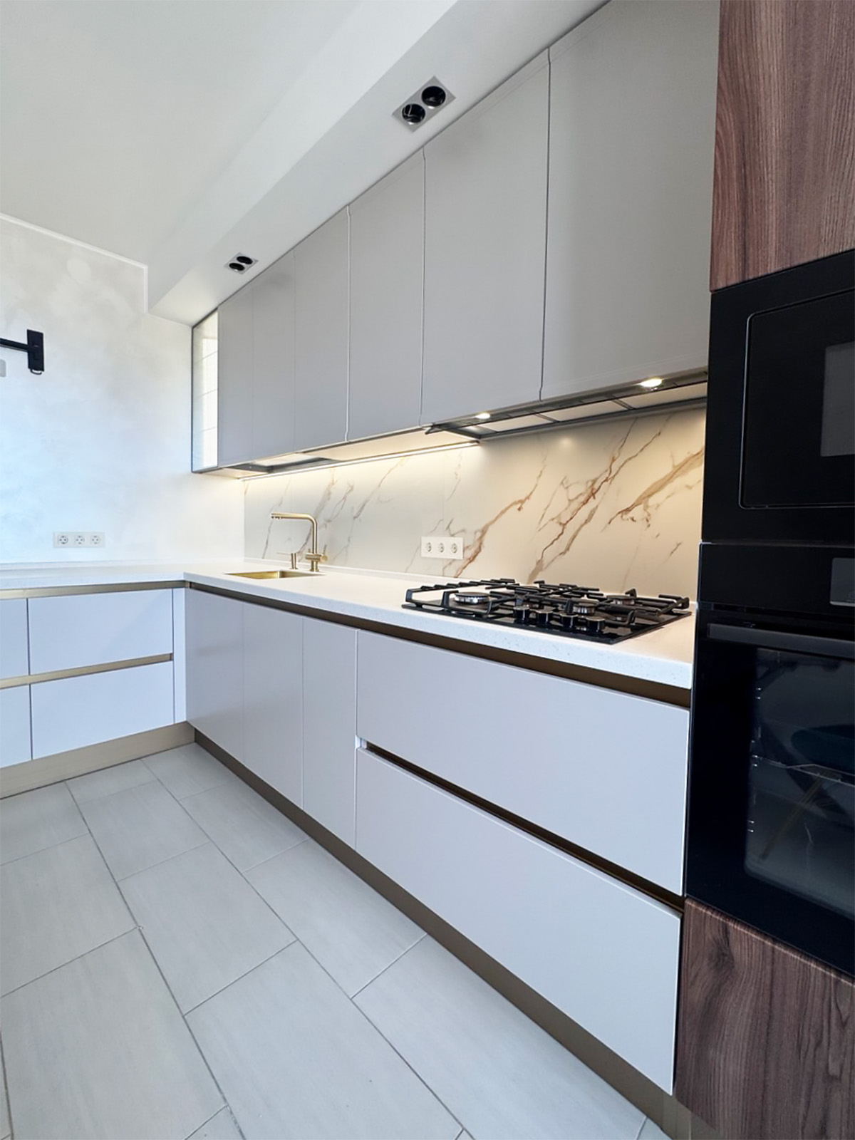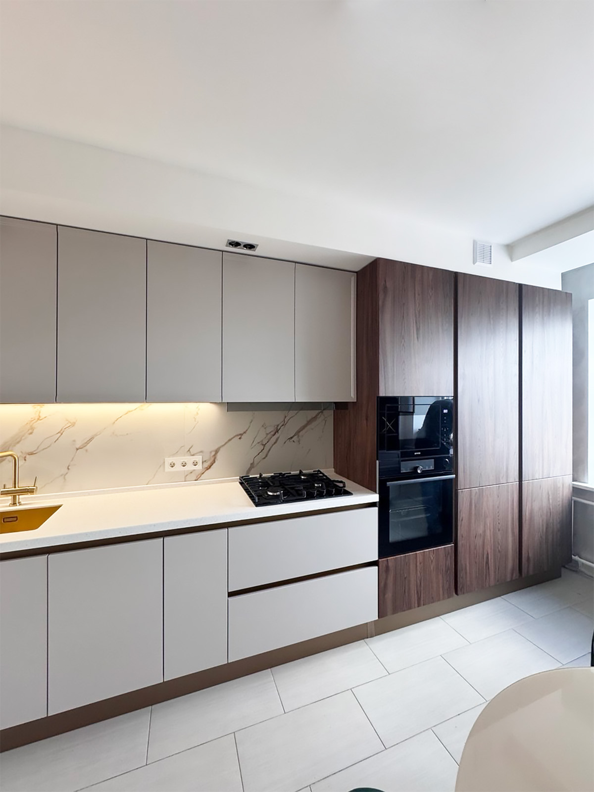 В интерьере использованы спокойные тона, что создает уютную и гармоничную атмосферу. Акценты в цвете «матовое золото» и теплые натуральные оттенки дерева придают кухне элегантный и стильный вид. Подсветка идеально подчеркивает дизайн и создает приятное освещение.
