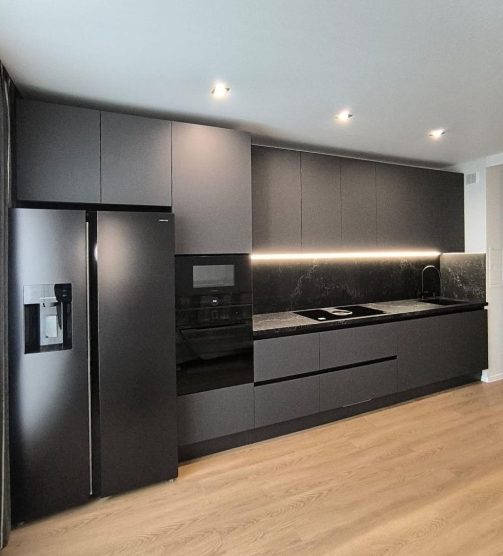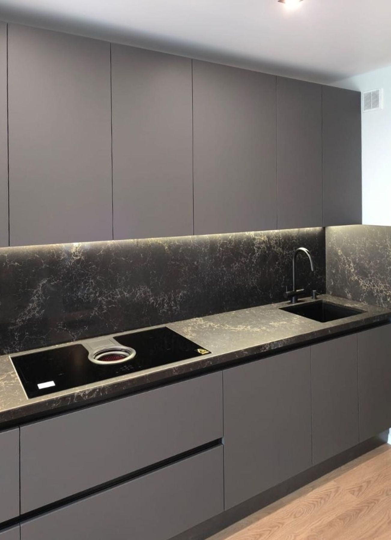 О проектеОписаниеЭта кухня впечатляет своим лаконичным дизайном и фасадами цвета "Черный графит", которые создают атмосферу строгости и элегантности. Столешница и фартук выполнены из кварца и придают интерьеру глубину. Встроенная техника и интегрированные ручки делают пространство максимально функциональным и удобным.