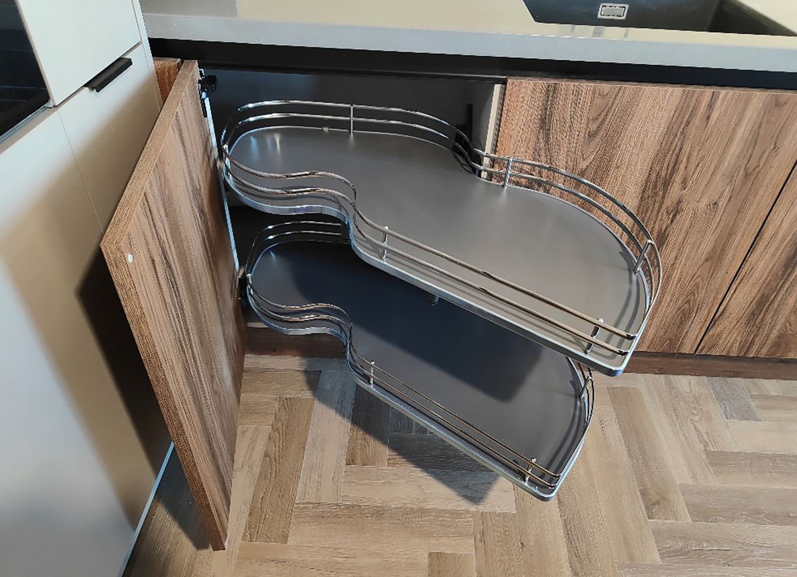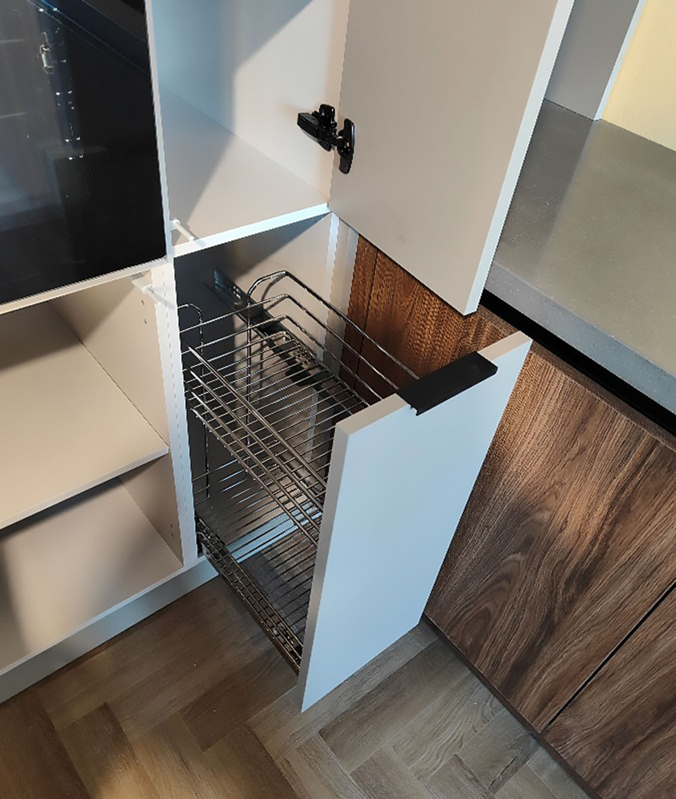 Гладкие фасады легко чистятся. Отсутствие ручек делает кухню максимально гармоничной. Стеклянная витрина позволяет демонстрировать красивую посуду и аксессуары.