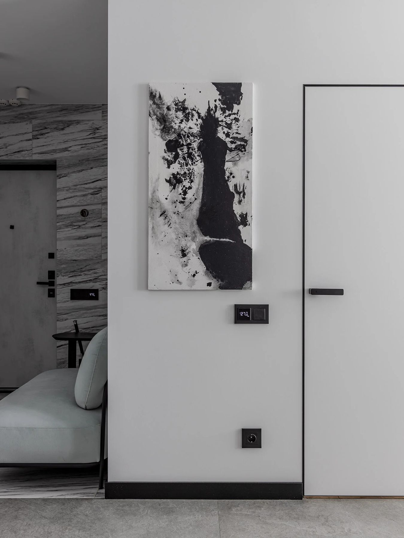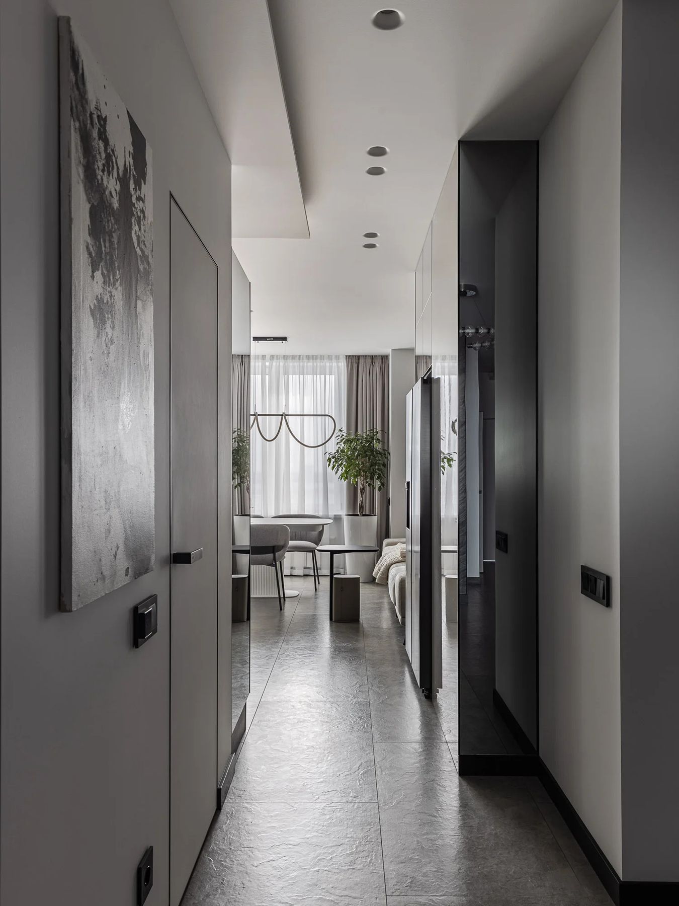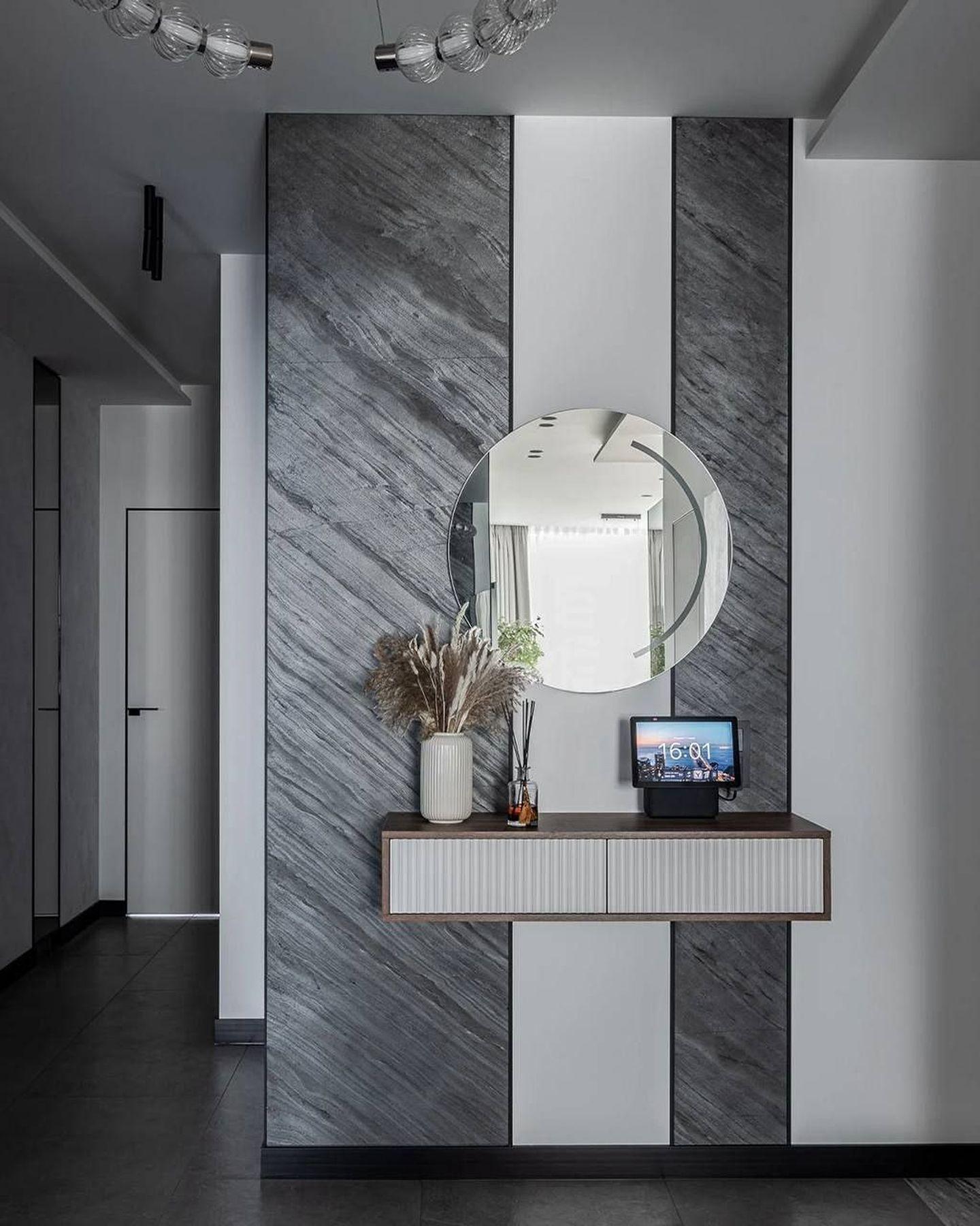 Уже с первого шага заметно, насколько профессионально проработан дизайн этого дома. Центральное место в прихожей занимает стильная консоль Jazz Allure с рифленой поверхностью, задающая атмосферу изысканности.