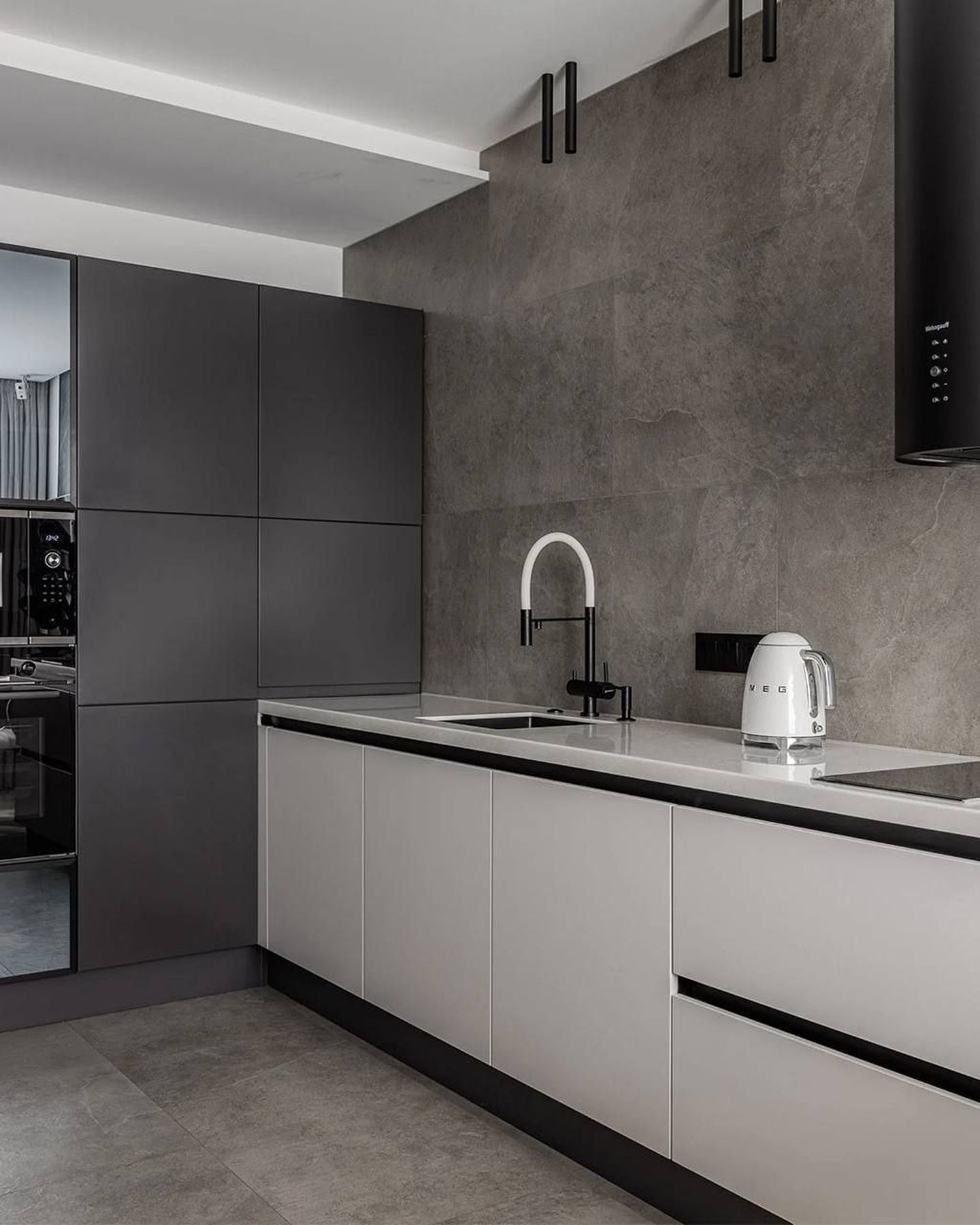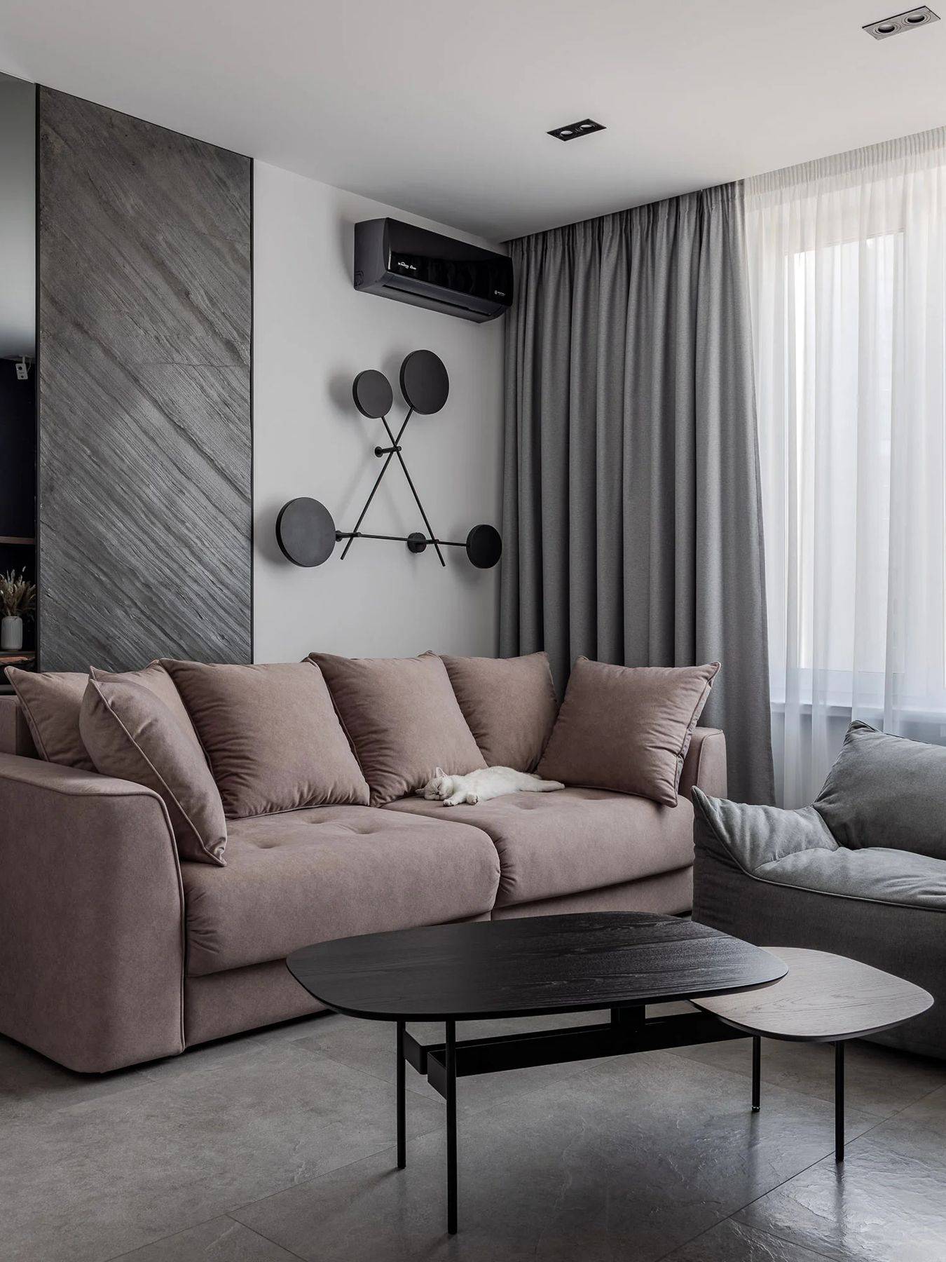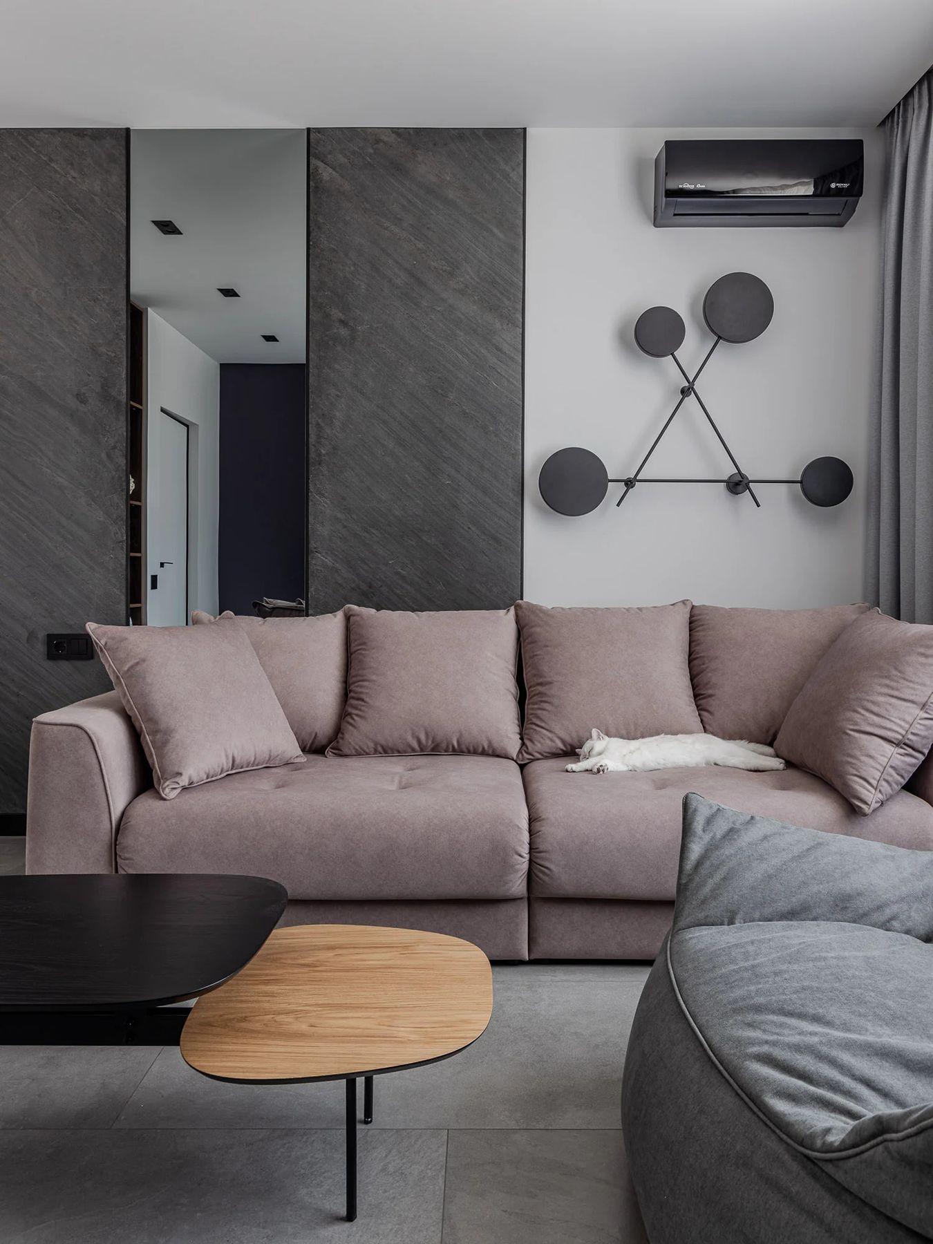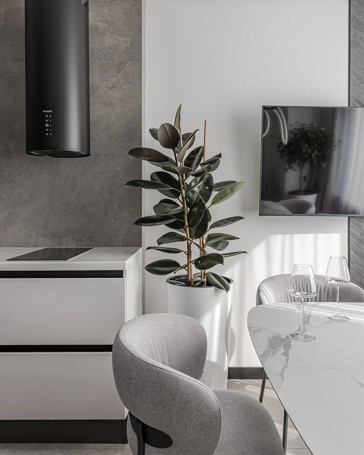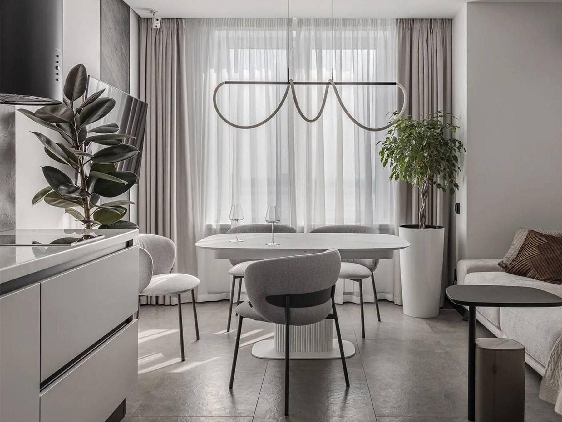 Гостиная, объединенная с кухней, привлекает внимание игрой противоположностей: сочетание гладких поверхностей и блеска стекла, насыщенных тёмных оттенков и воздушных светлых тонов. Композиция кухонного гарнитура модели Jazz Intuit представлена двумя функциональными модулями: рабочая зона выполнена в белом цвете, тогда как пеналы выполнены в благородном сером оттенке. Отсутствие верхних шкафчиков добавляет интерьеру лёгкости. Белая столешница и витрина Novara с темным стеклом придают интерьеру особую выразительность.