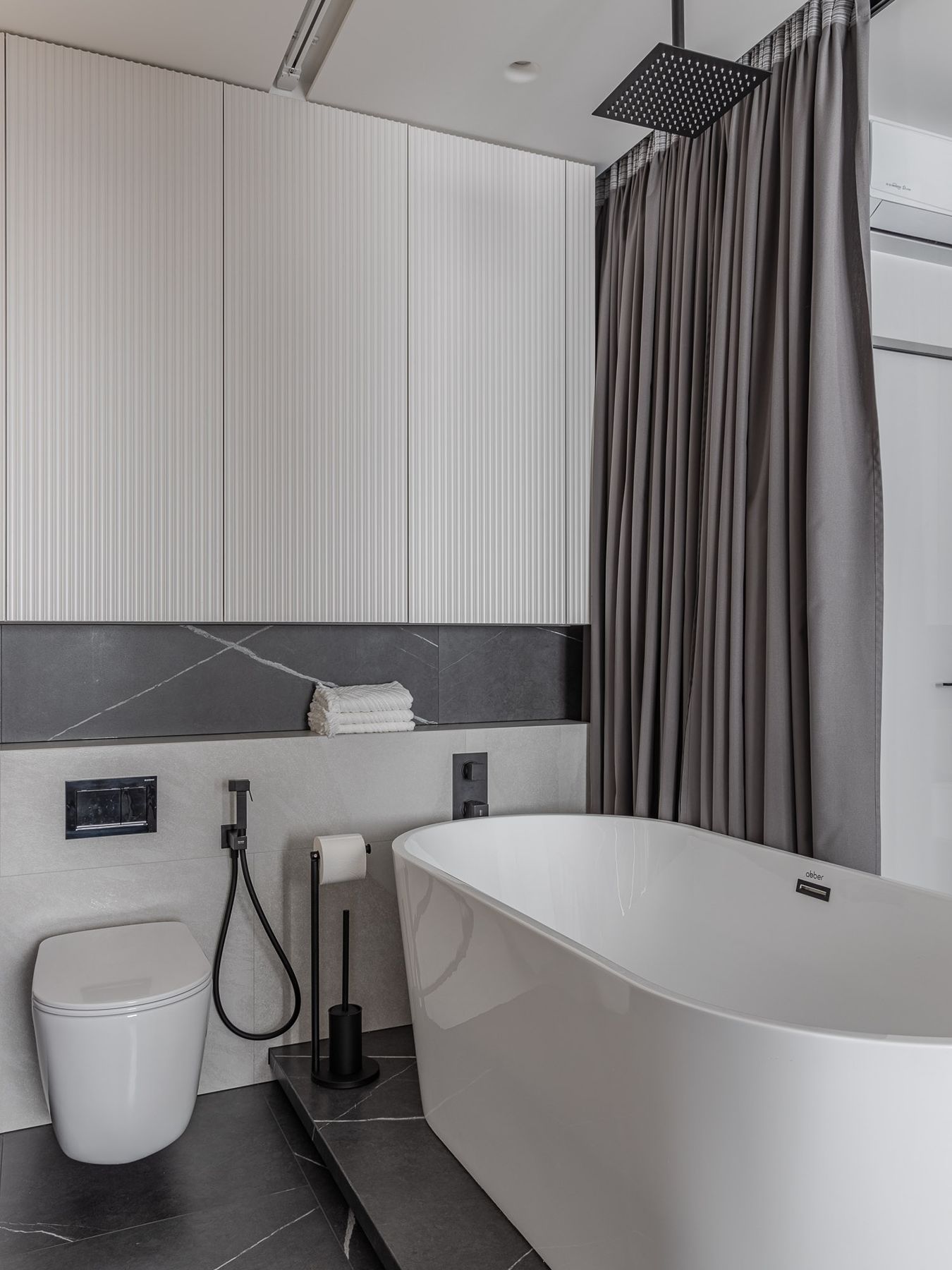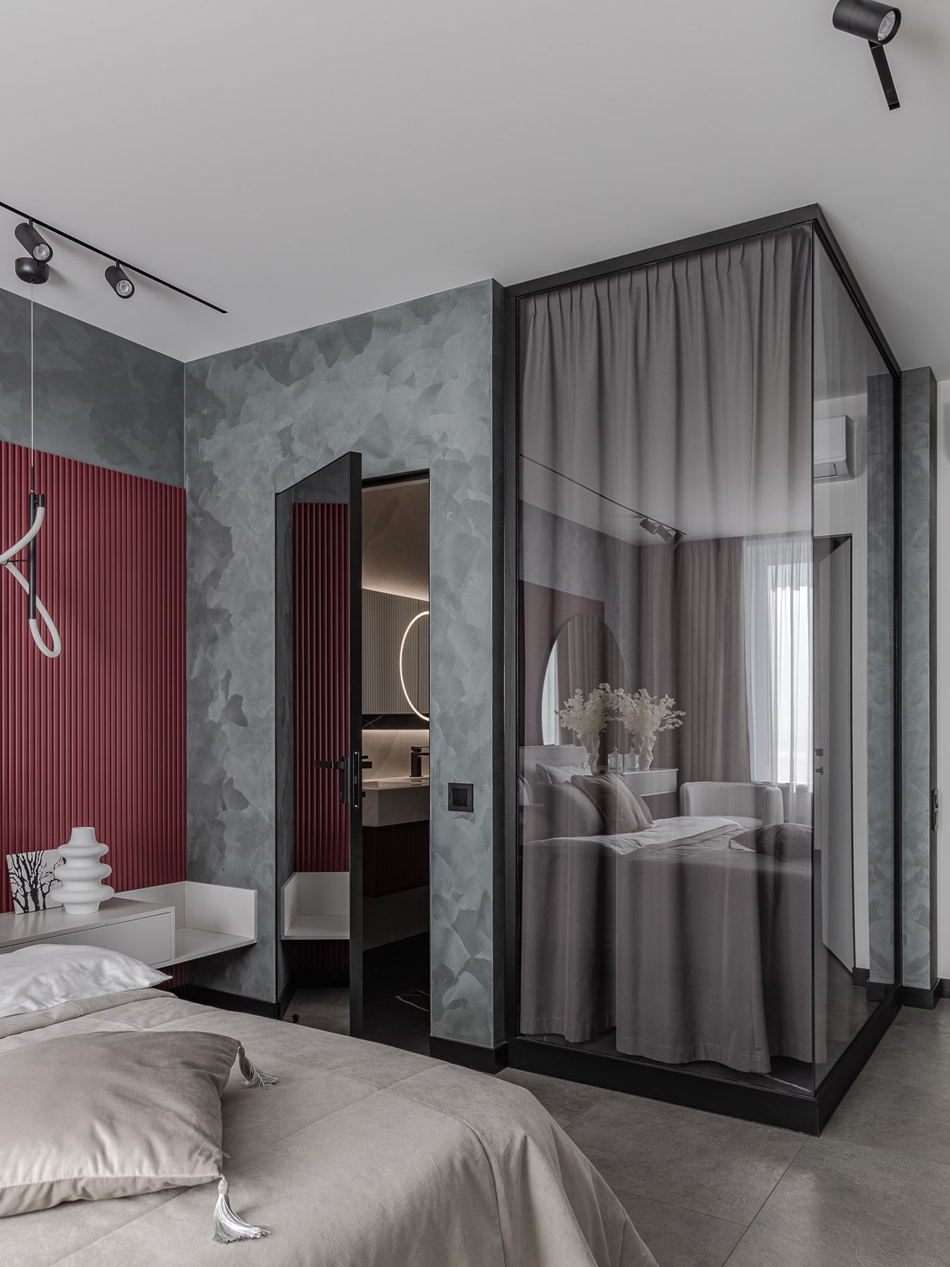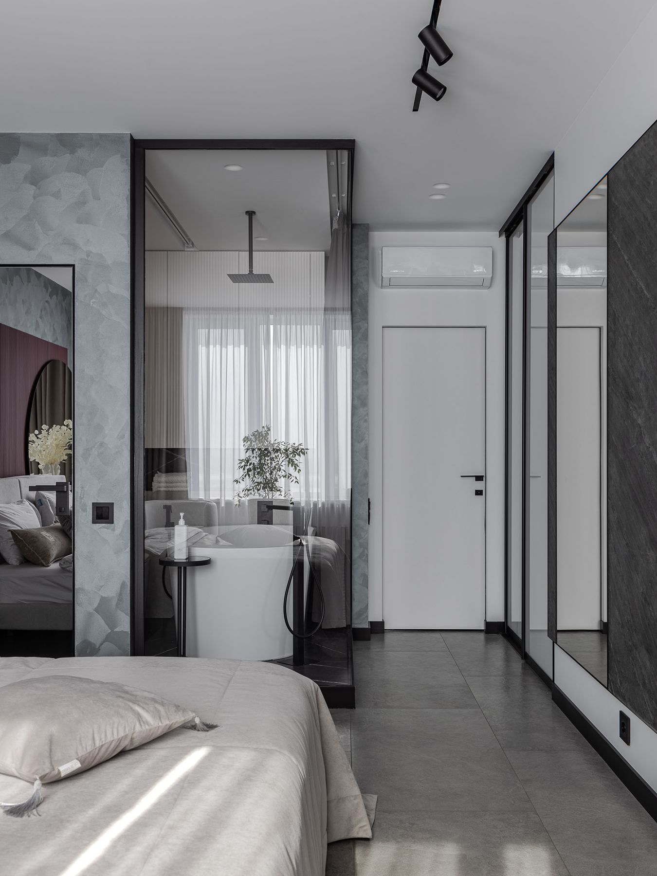 Самым ярким решением этого проекта стало объединение спальной зоны и ванной комнаты стеклянной перегородкой. Этот приём размыл границы между зонами и наполнил помещение естественным светом. Ванна стала центром притяжения внимания, подчеркивая индивидуальность пространства. При этом плотные шторы сохранили приватность при использовании.