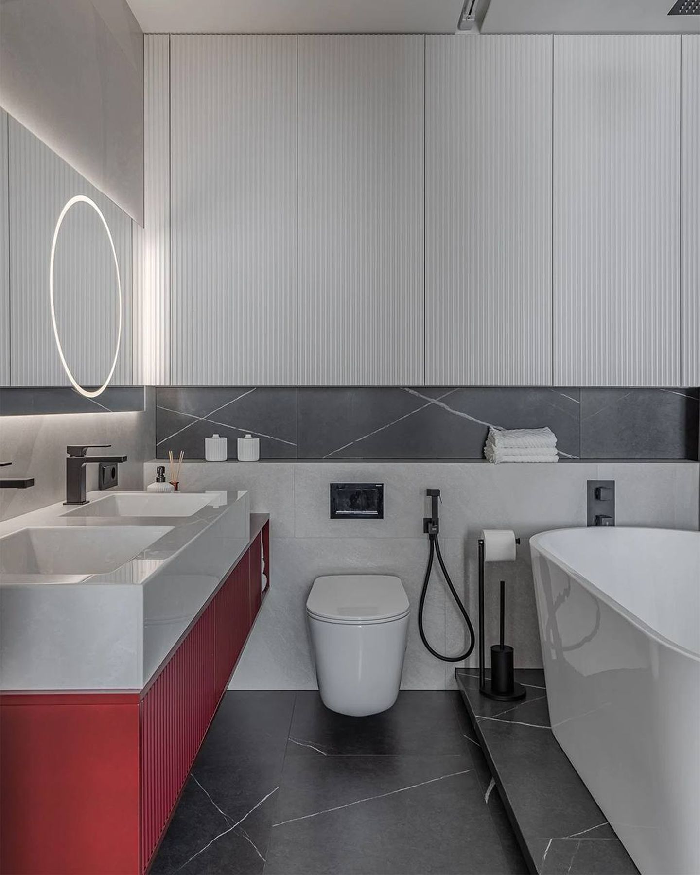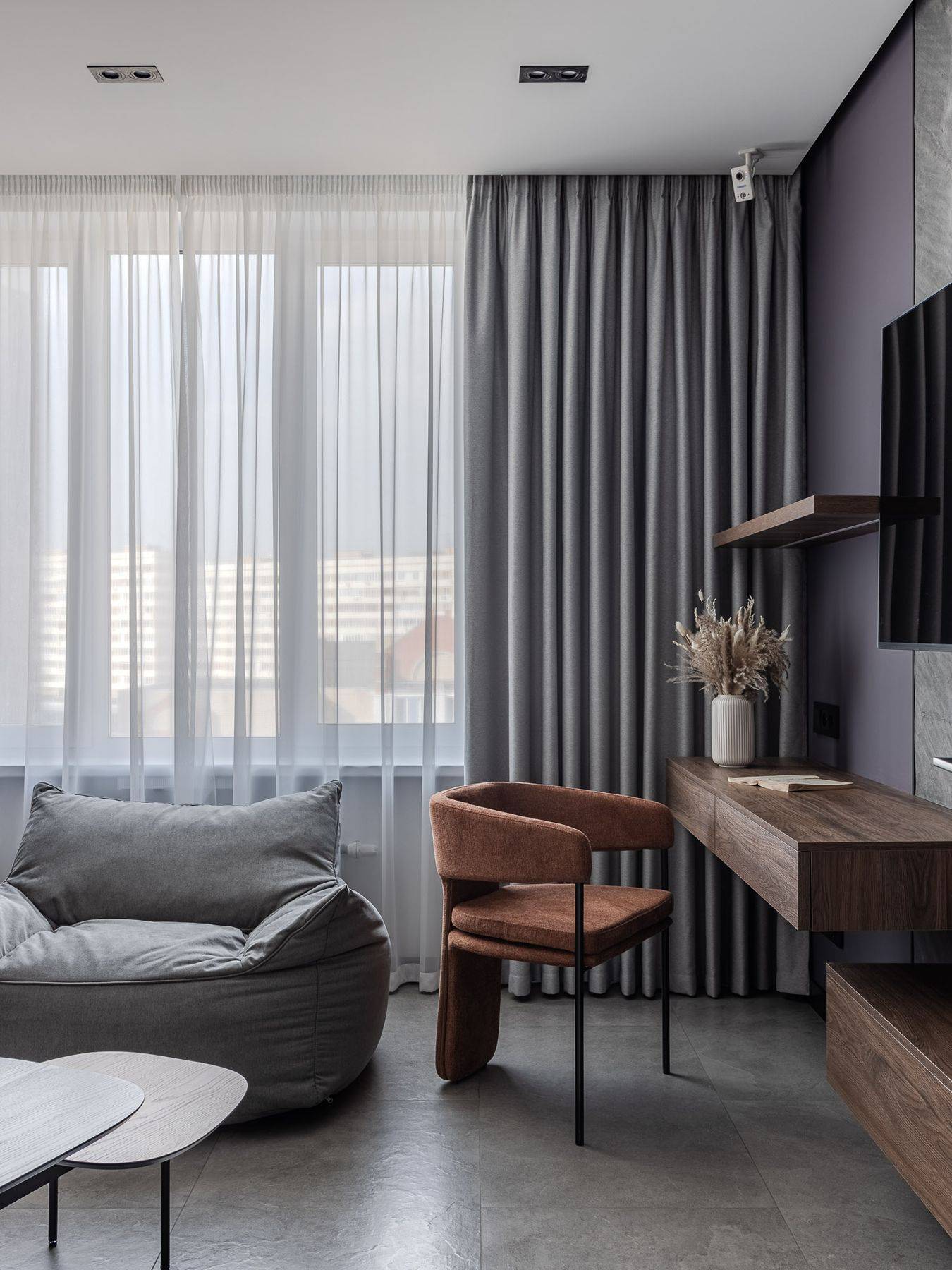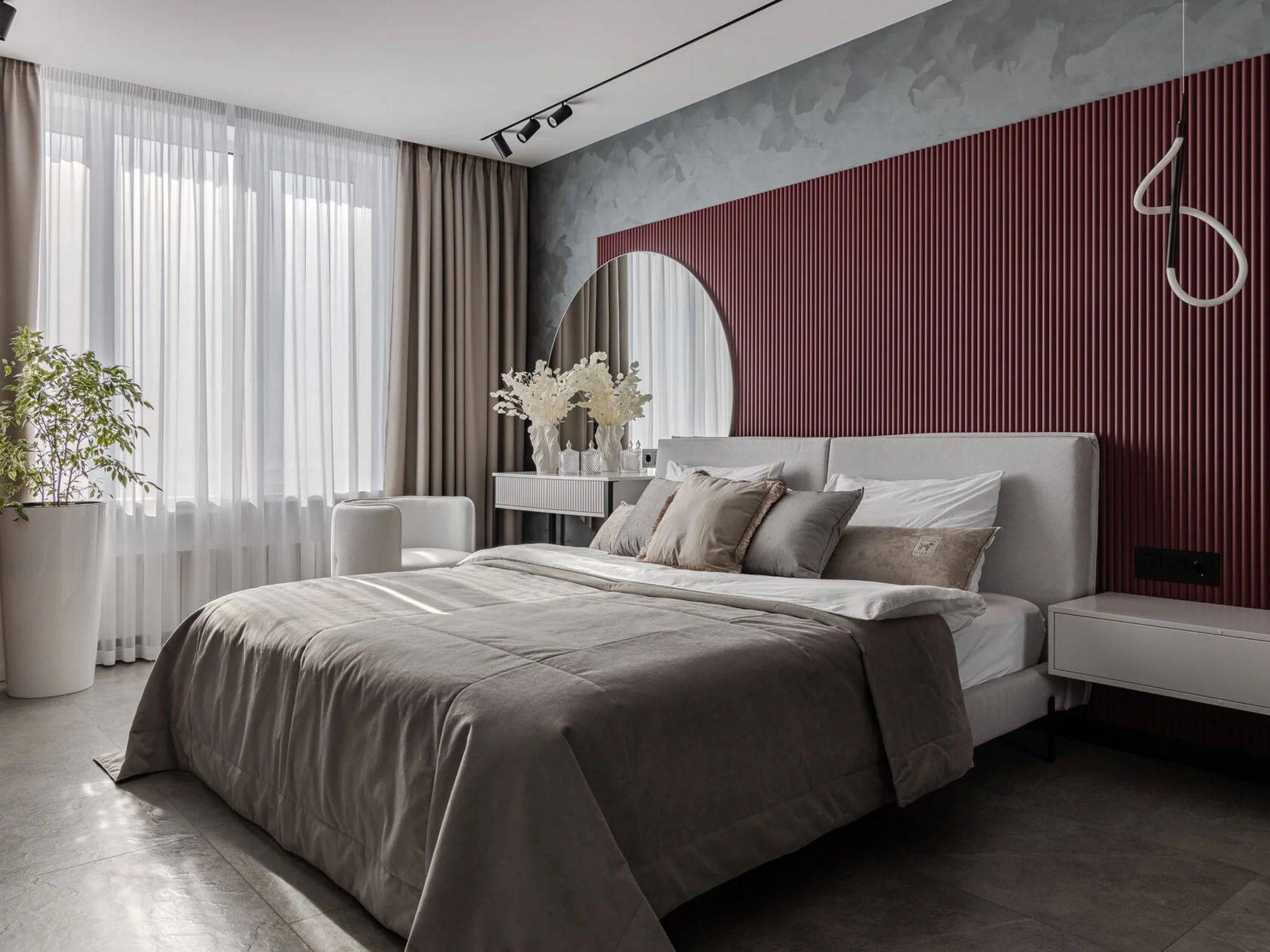 Самым ярким решением этого проекта стало объединение спальной зоны и ванной комнаты стеклянной перегородкой. Этот приём размыл границы между зонами и наполнил помещение естественным светом. Ванна стала центром притяжения внимания, подчеркивая индивидуальность пространства. При этом плотные шторы сохранили приватность при использовании.