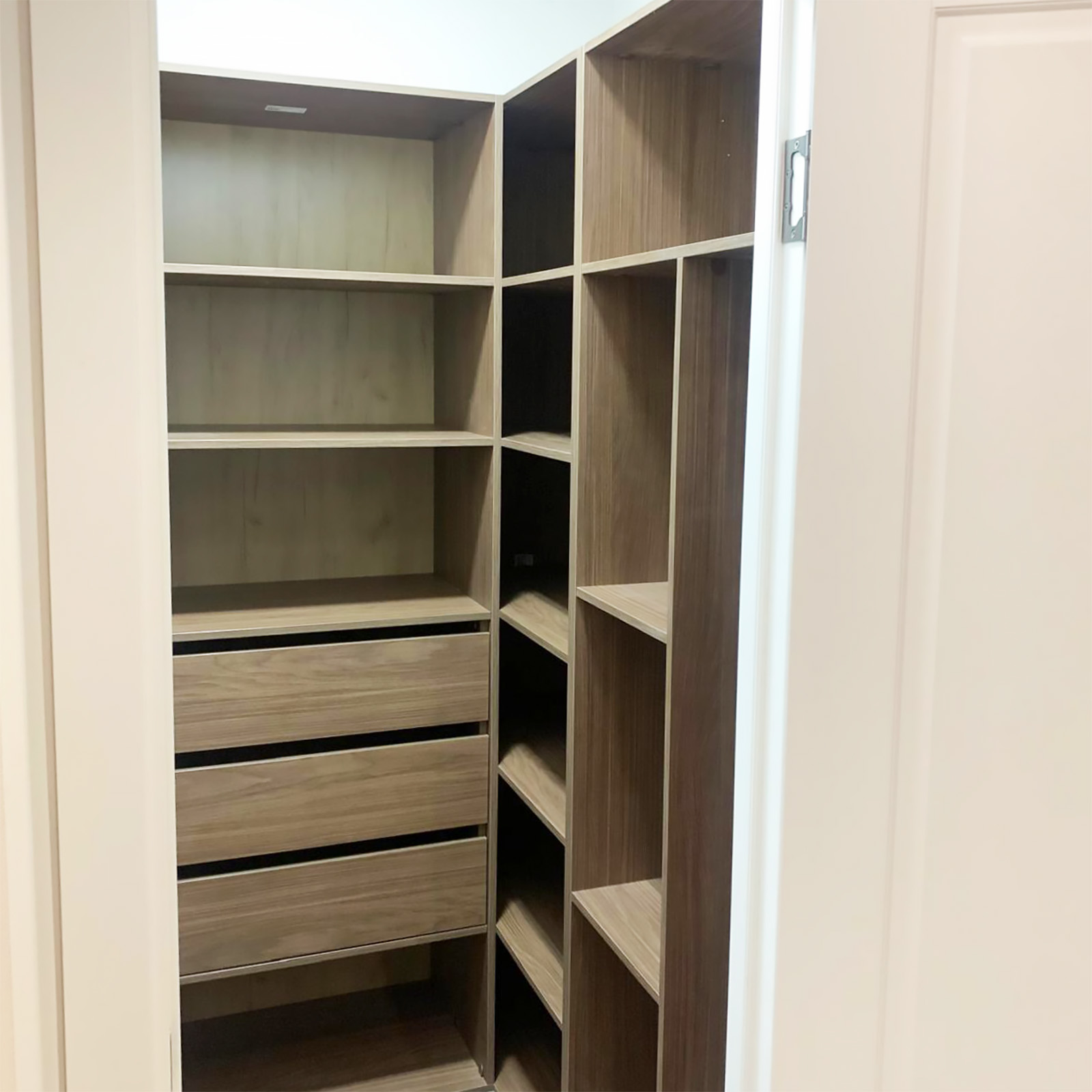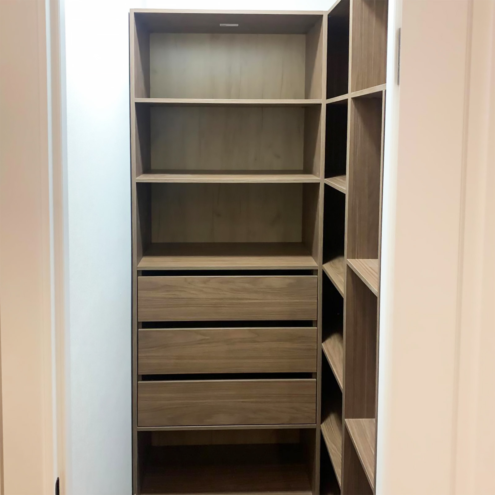 Размер помещения позволили сделать максимально вместительный шкаф и добавить дополнительные места хранения (выдвижные ящики), так же предусмотрено место для сидения.