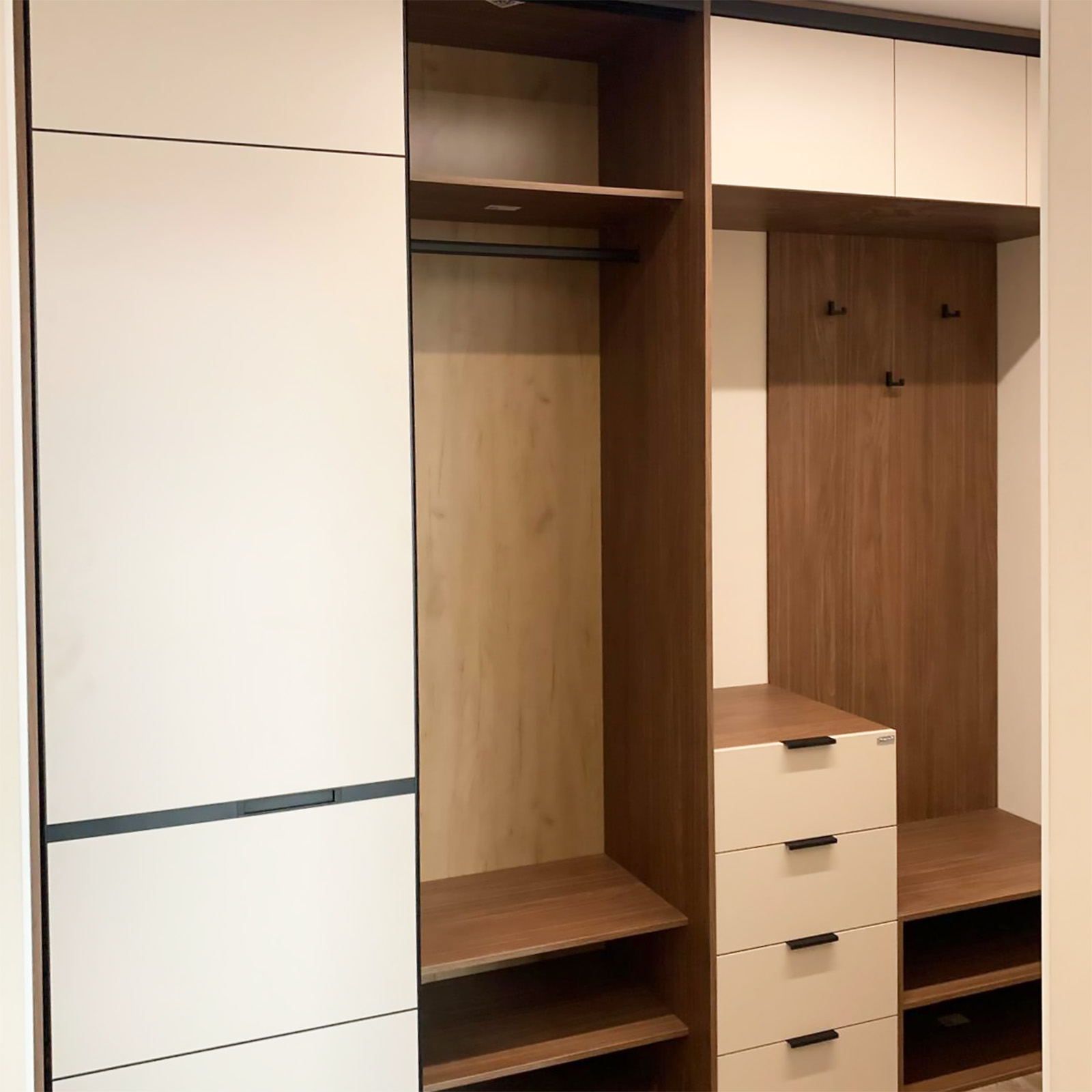 О проектеОписаниеПроект сделан для квартиры. Выбрали самое классическое сочетание - кашемир для фасадов и орех Линкольн для каркаса.