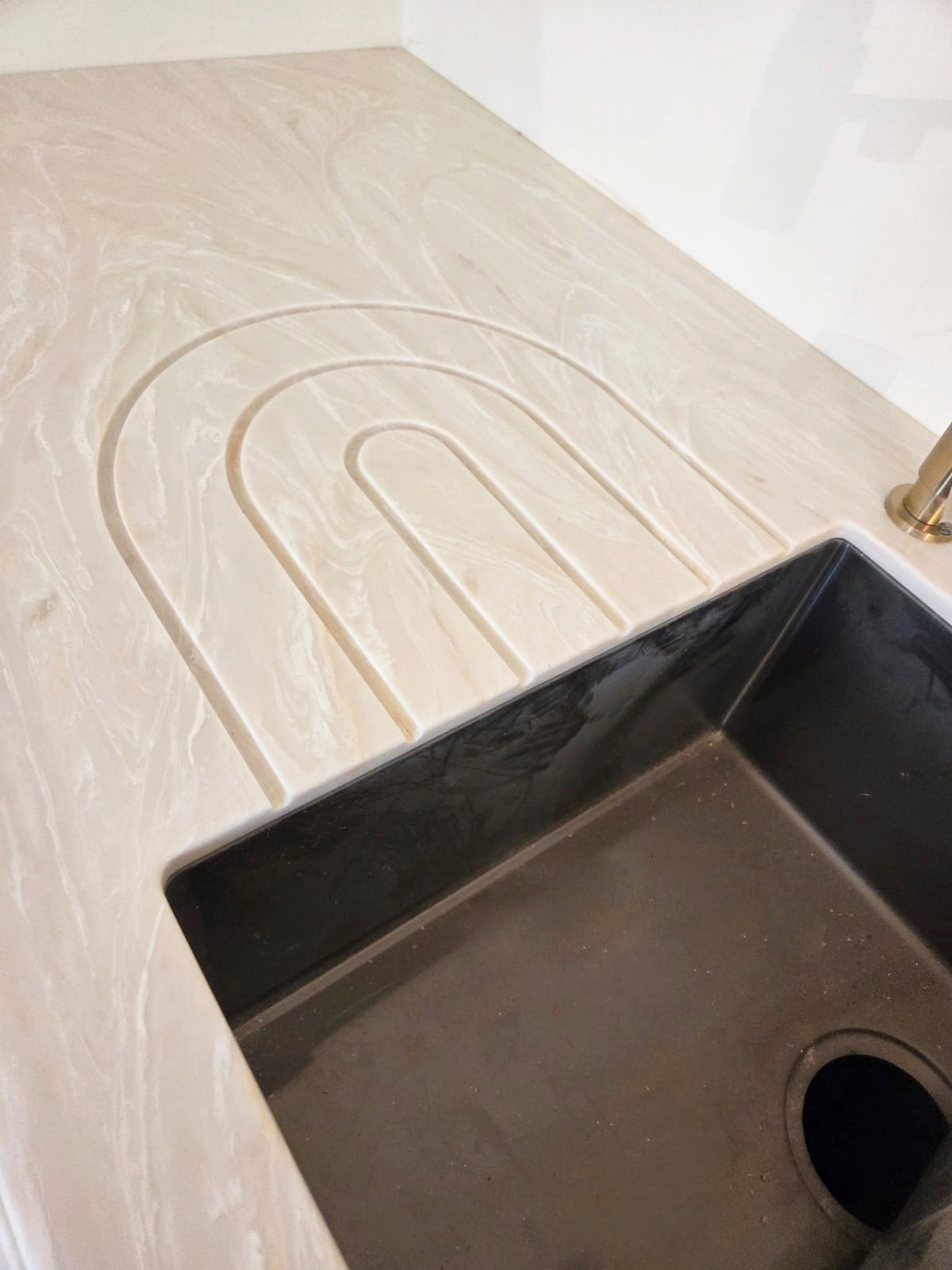 В комплект к ней была выбрана столешница из искусственного камня похожего на оникс. Мойка подстольного монтажа дополнена проточками слева.
