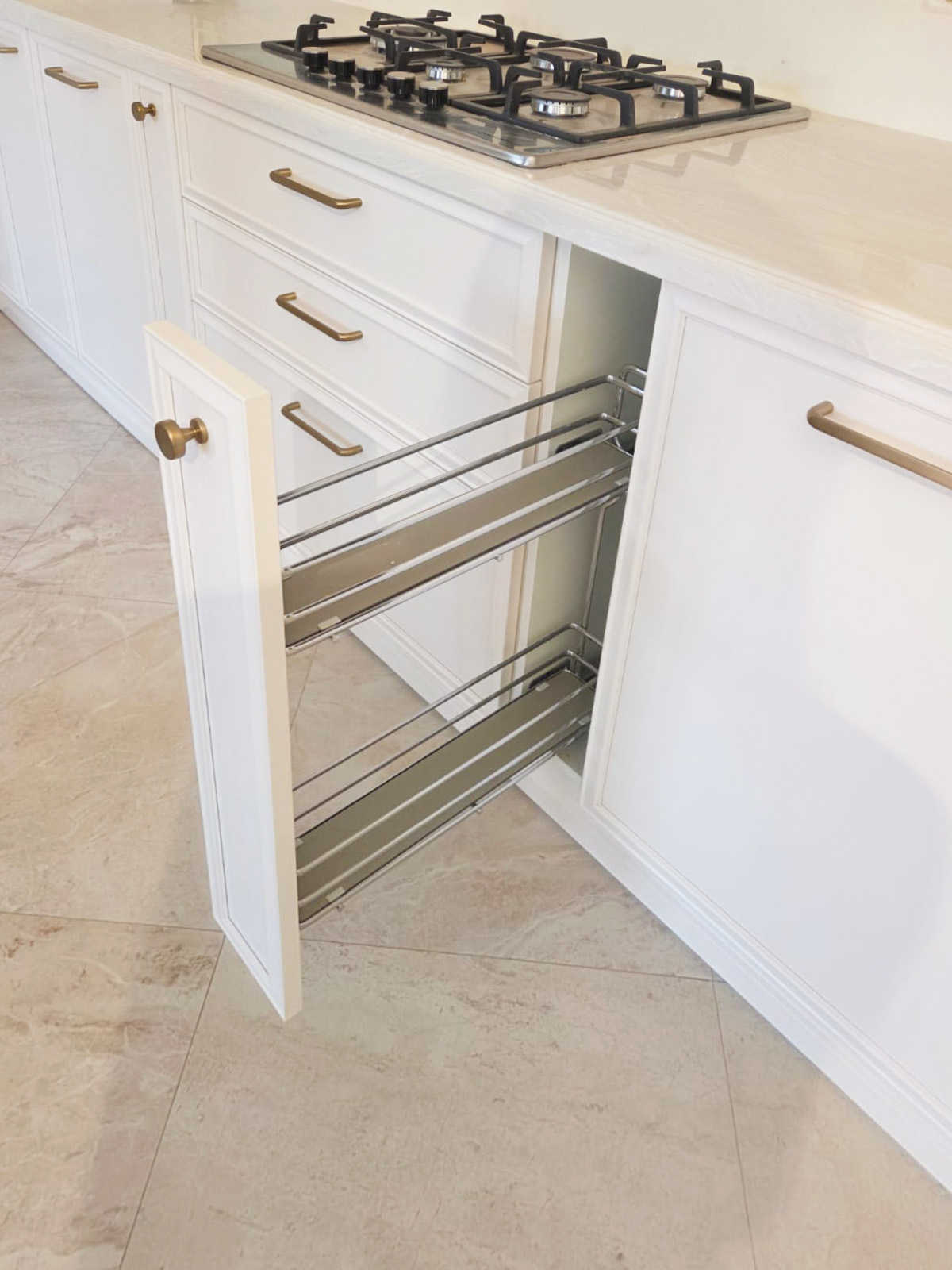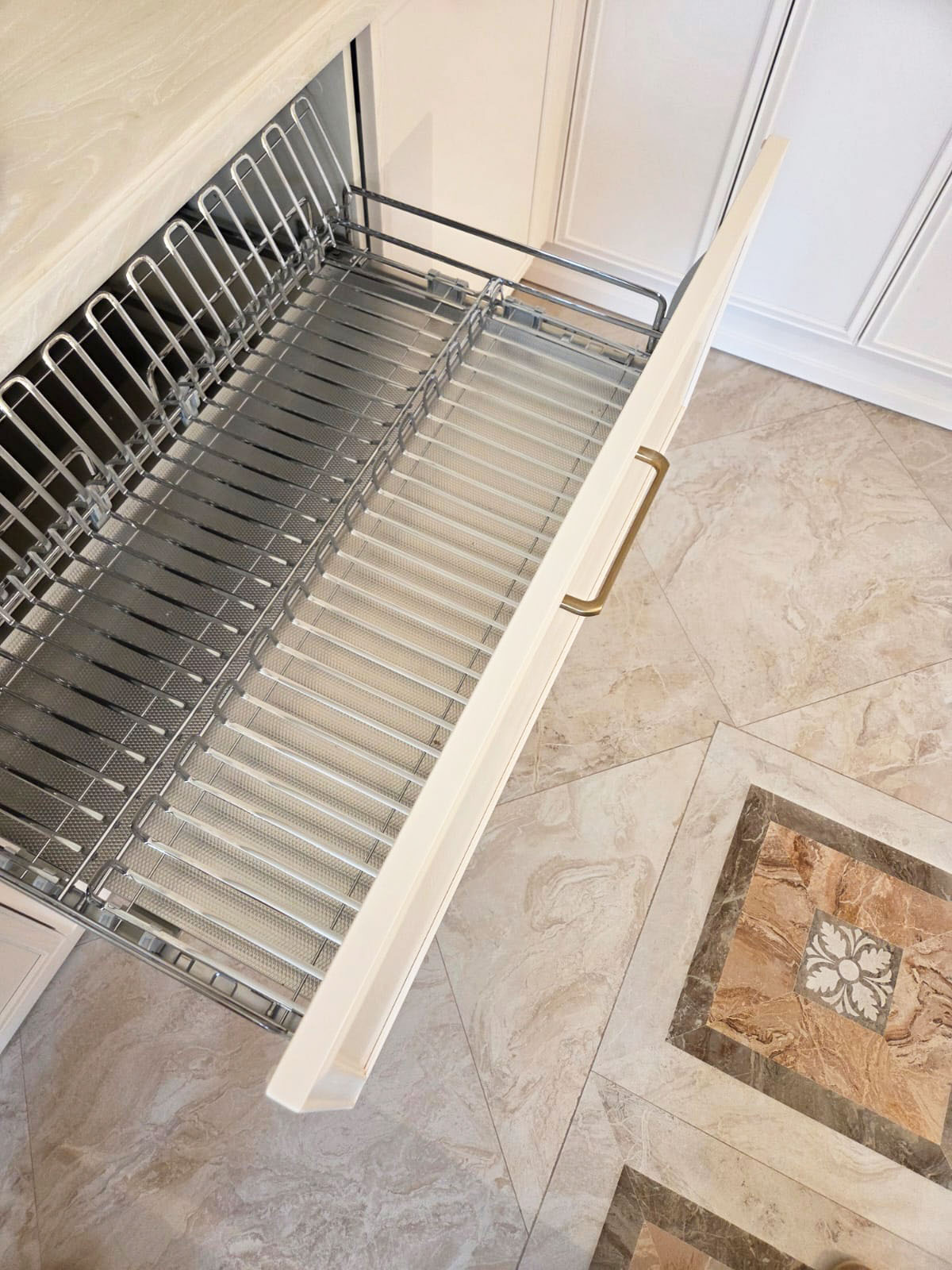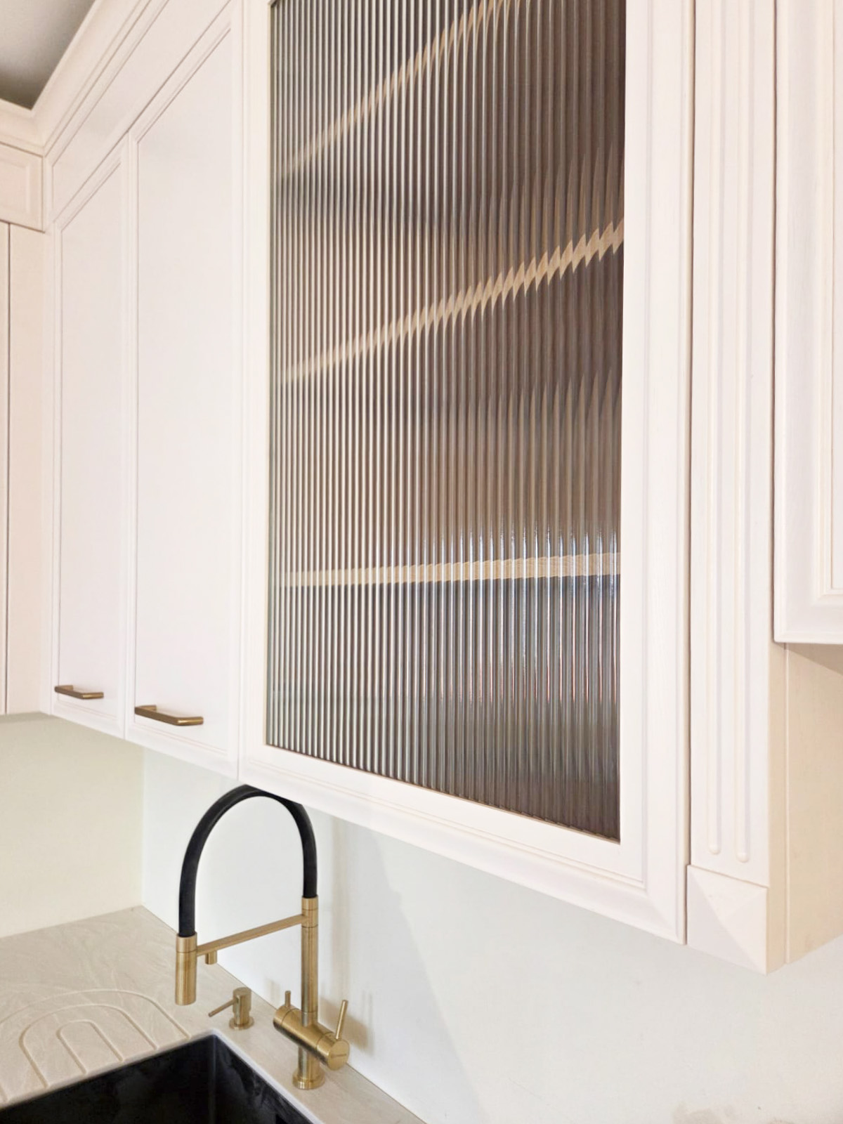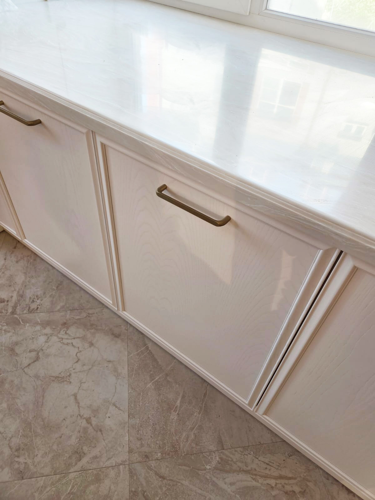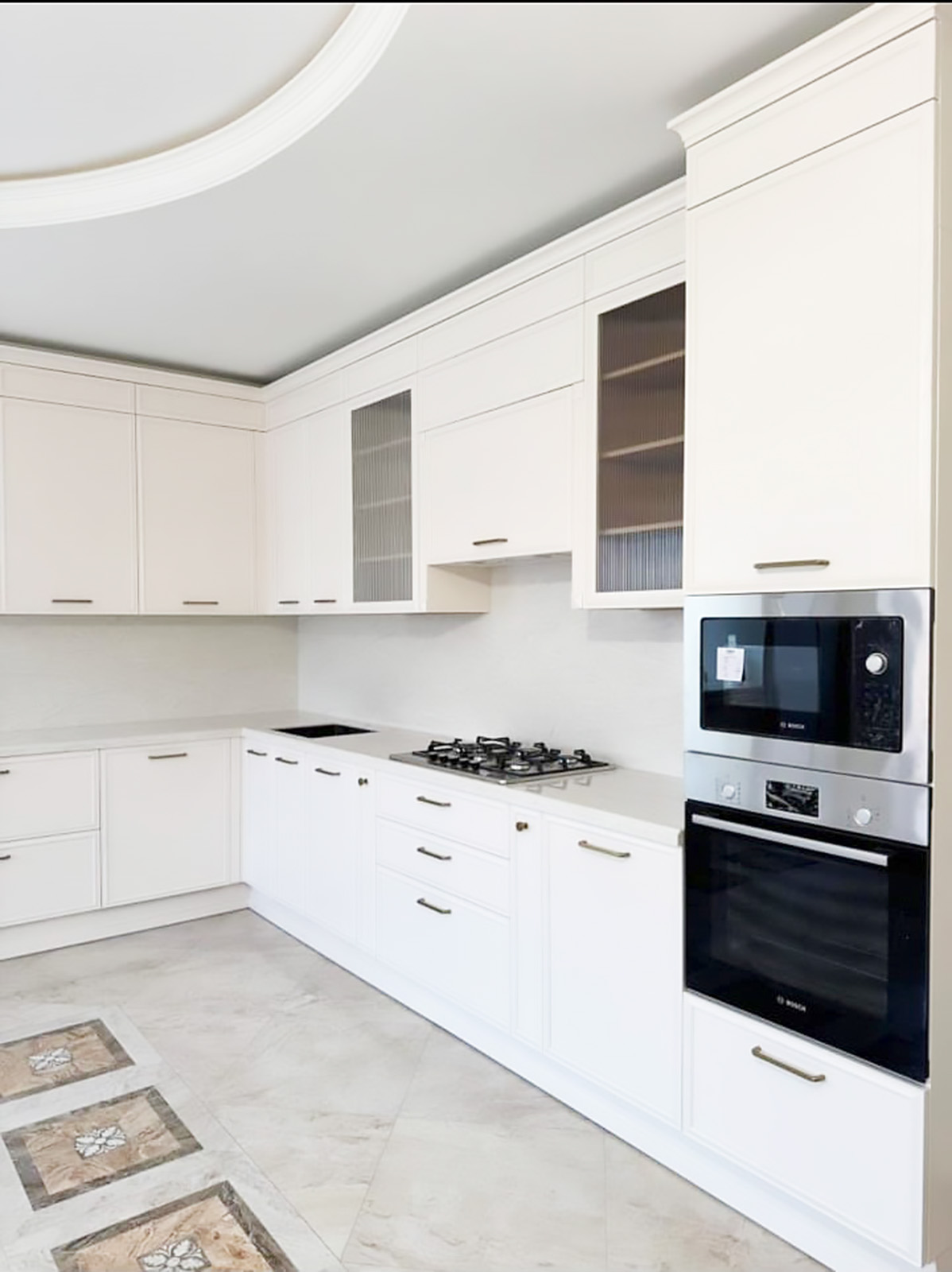 Кухня выкрашена в жемчужно-белую эмаль, в комплект подобраны золотые элементы ( ручки, смеситель).