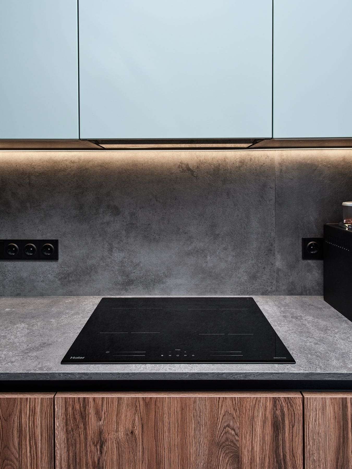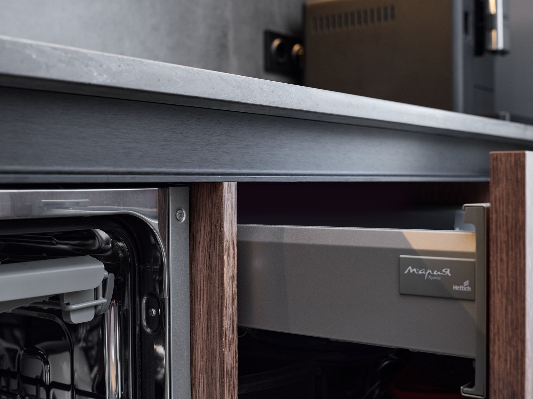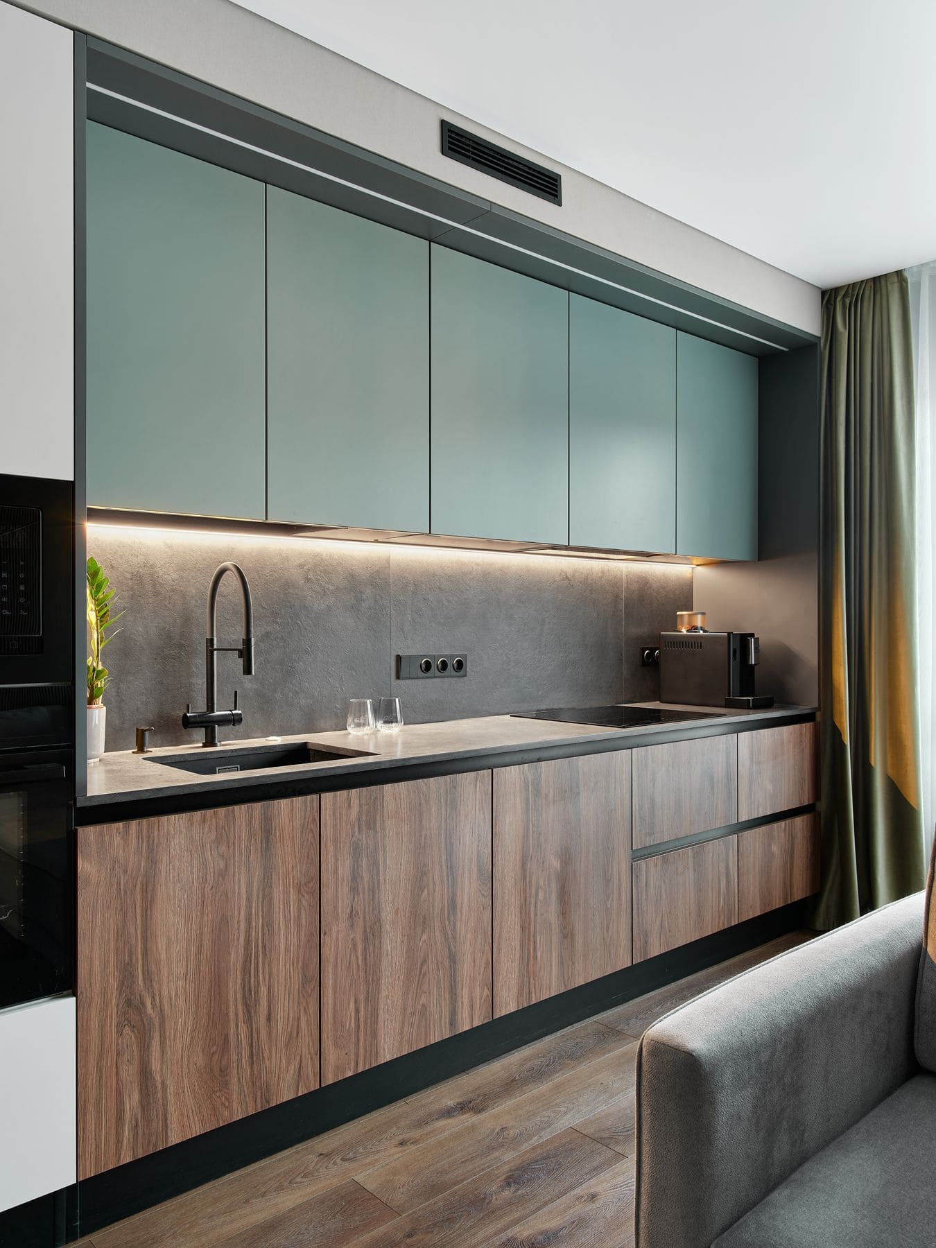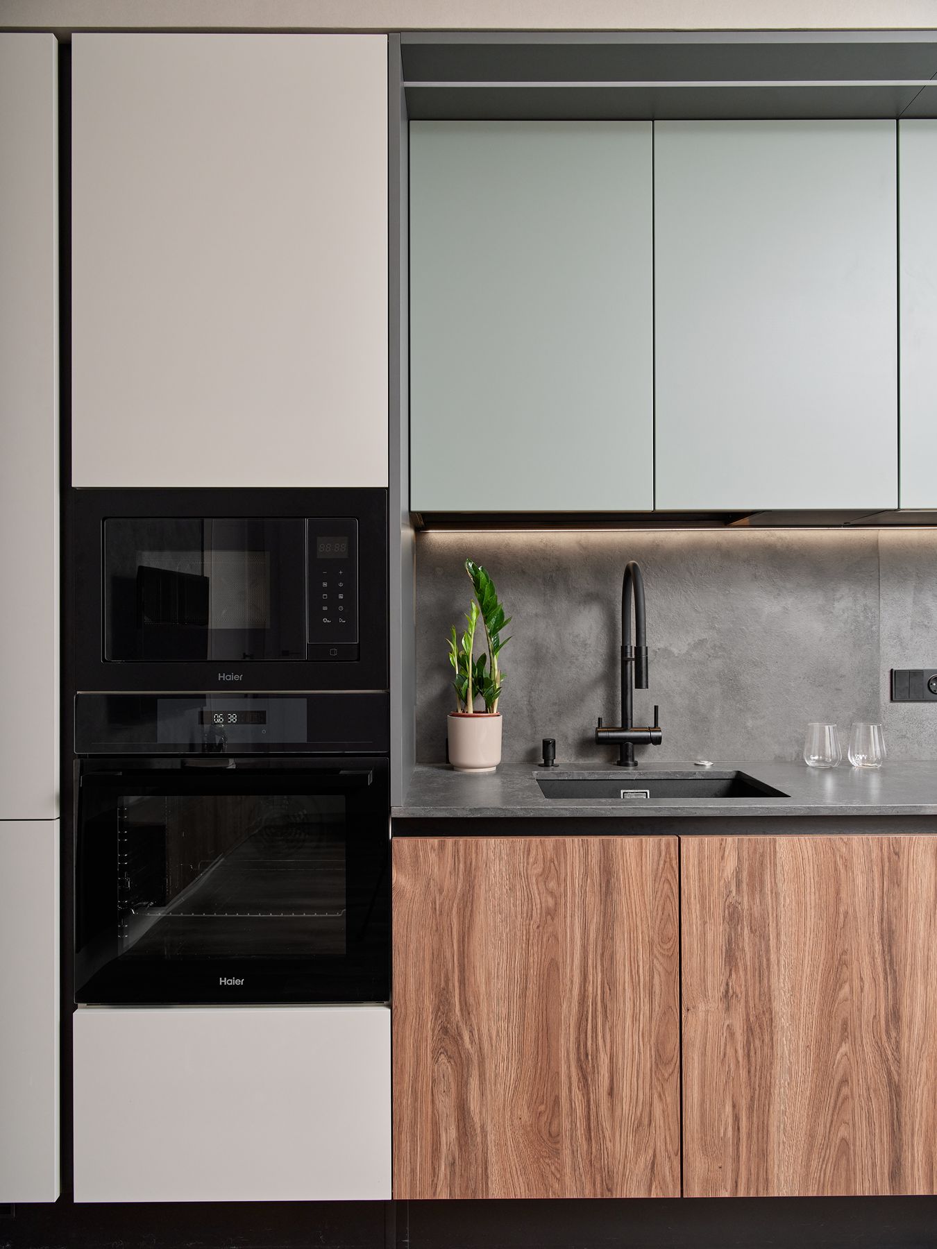Кухня выдержана в мягких природных цветах. Фасады нижних модулей и колонны модели Mix 22 выполнены в цветах «дуб чарльстон темно-коричневый» и «кашемир». Они прекрасно гармонируют с фасадами верхних модулей модели Teramo серо-зеленого цвета.
