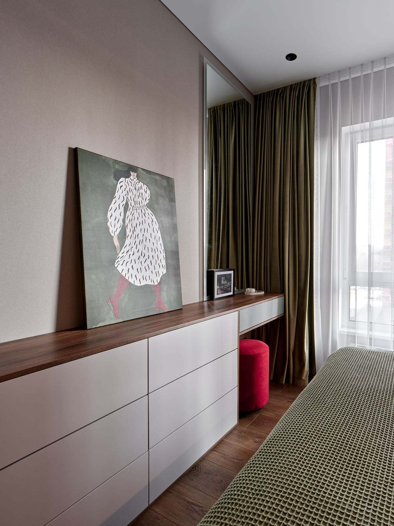 Прихожая выделяется благодаря шкафу Mix 22 теплого древесного оттенка. Акцентом служит консоль Teramo серо-зеленого цвета.