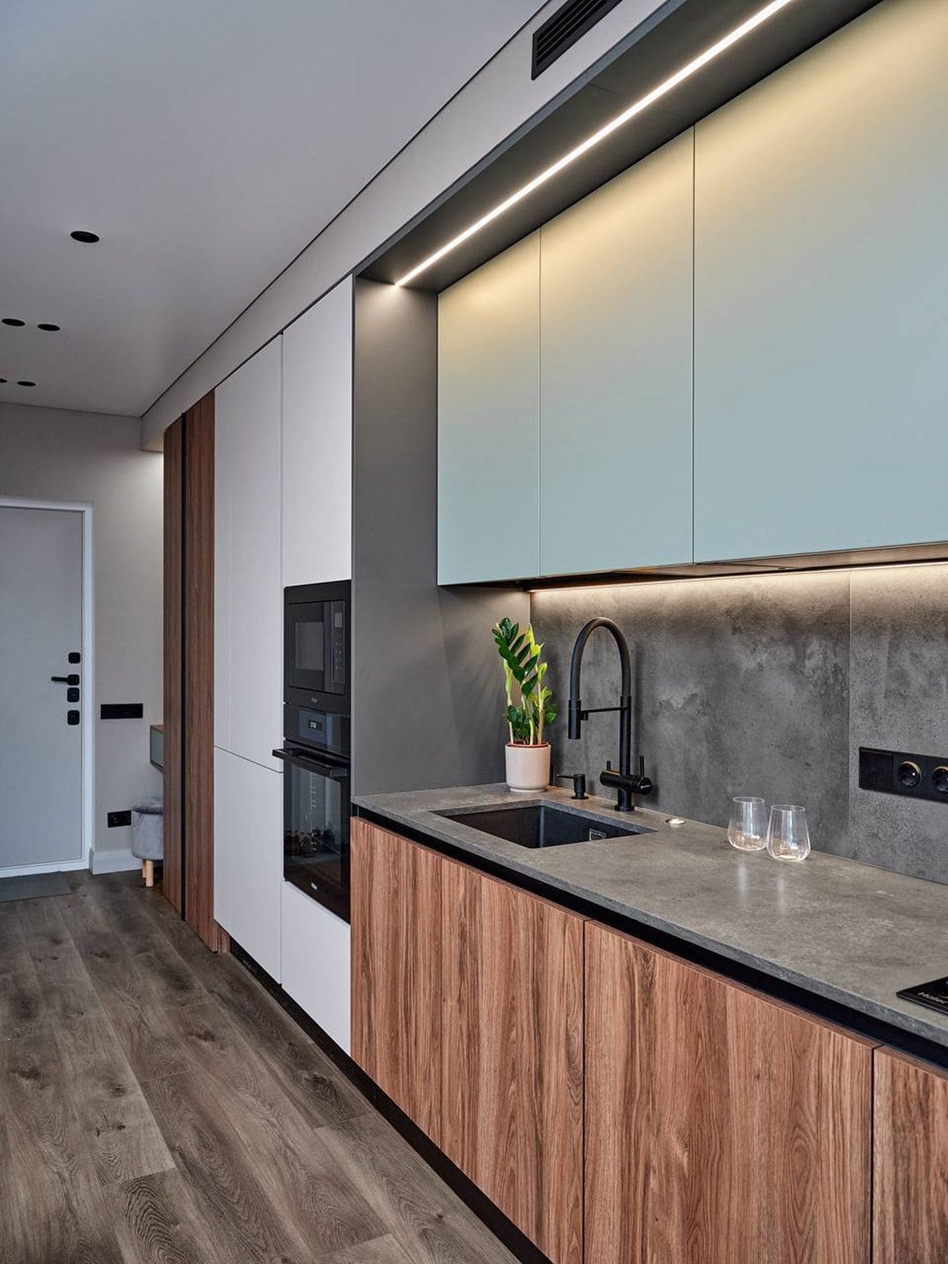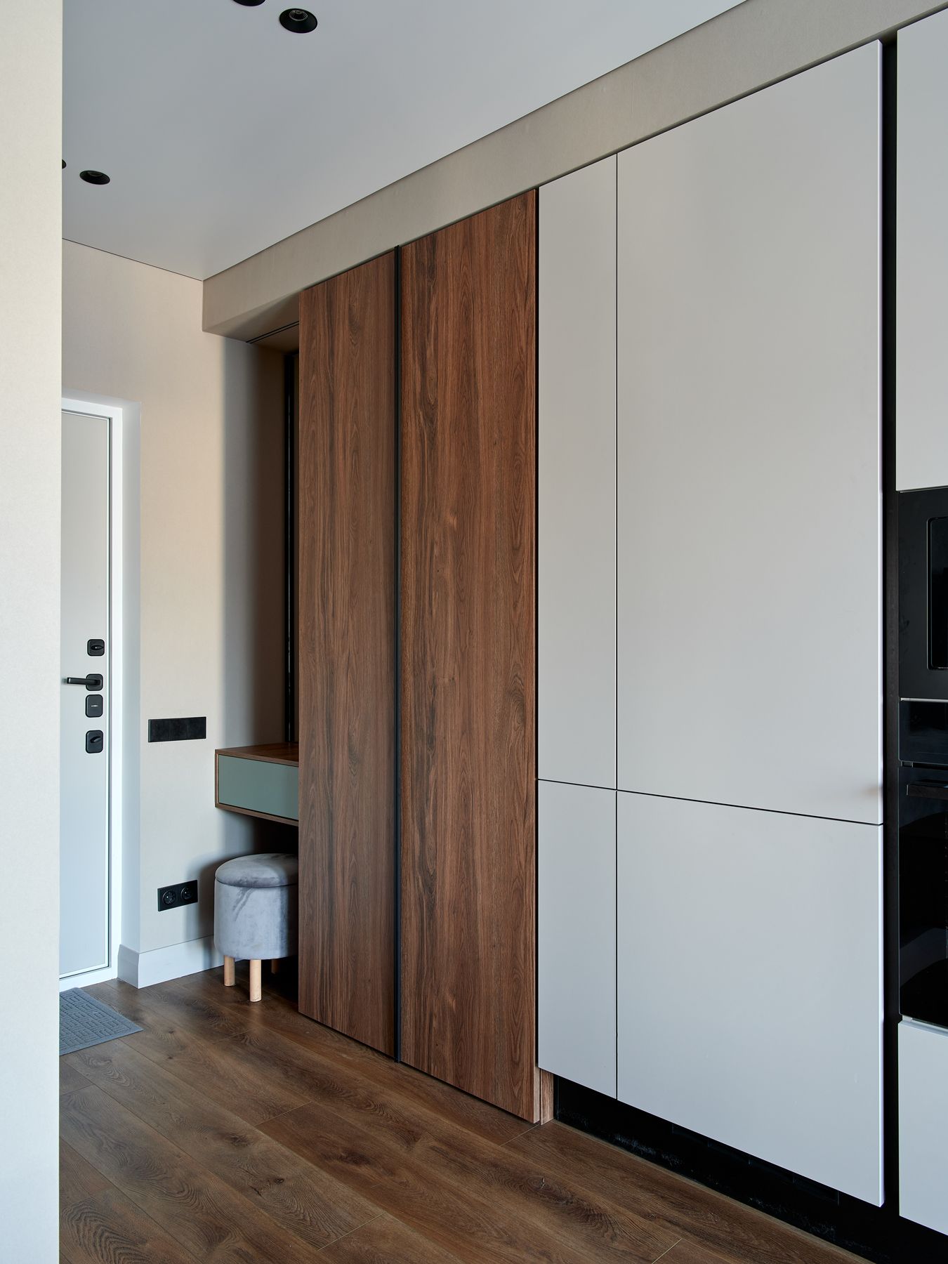 Особенностью проекта является уникальная система хранения, охватывающая обе зоны – прихожую и кухню. Границы между ними обозначены цветом фасадов.