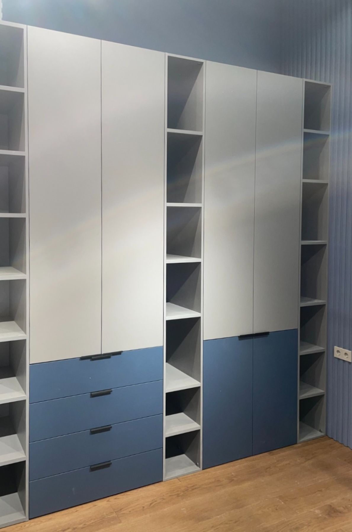 Матовый светло-серый цвет создаёт ощущение простора и чистоты. Глубокий сине-голубой оттенок придаёт мебели характер, ассоциирующийся с «мальчиковыми» качествами, – спокойный, уверенный, не кричащий. Чёрные лаконичные ручки подчёркивают современный минималистичный стиль.