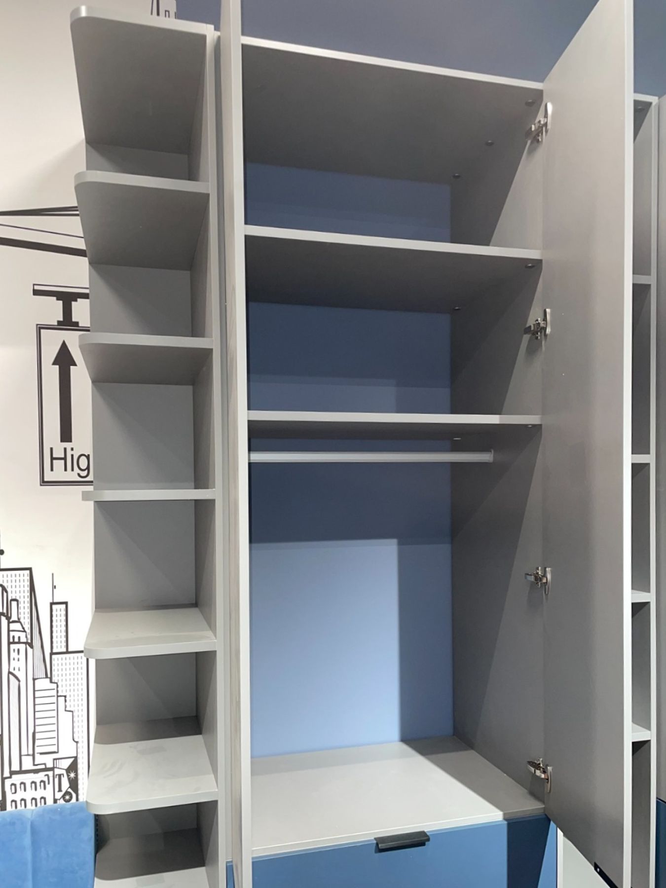 Шкаф гармонично вписывается в интерьер детской, сочетается с элементами урбанистики (на стене виден рисунок с силуэтами зданий).