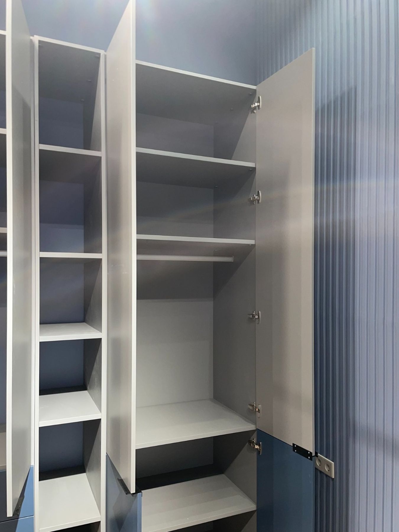 О проектеОписаниеЭто современный шкаф для детской комнаты мальчика, выполненный в спокойных тонах серого и синего цветов.