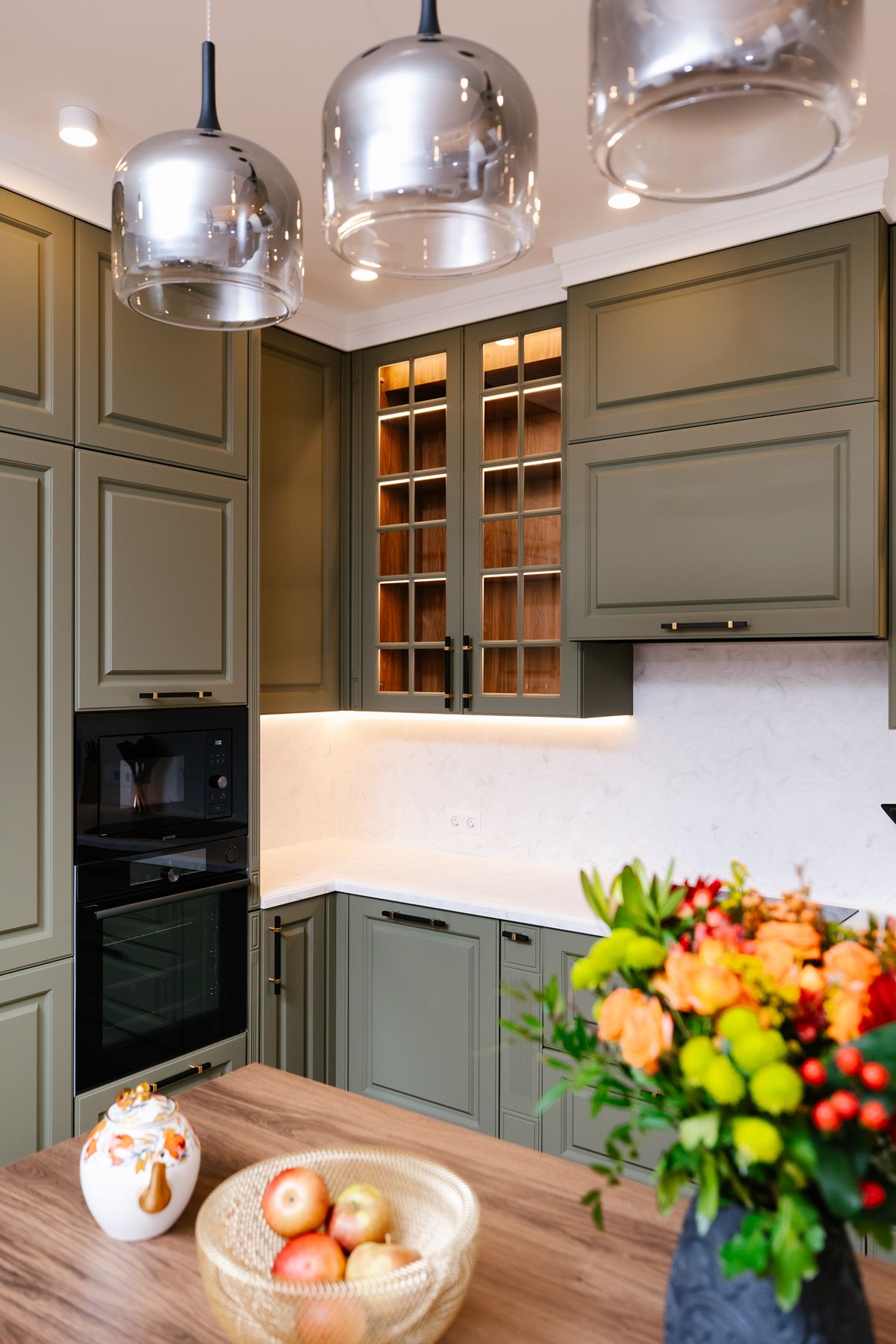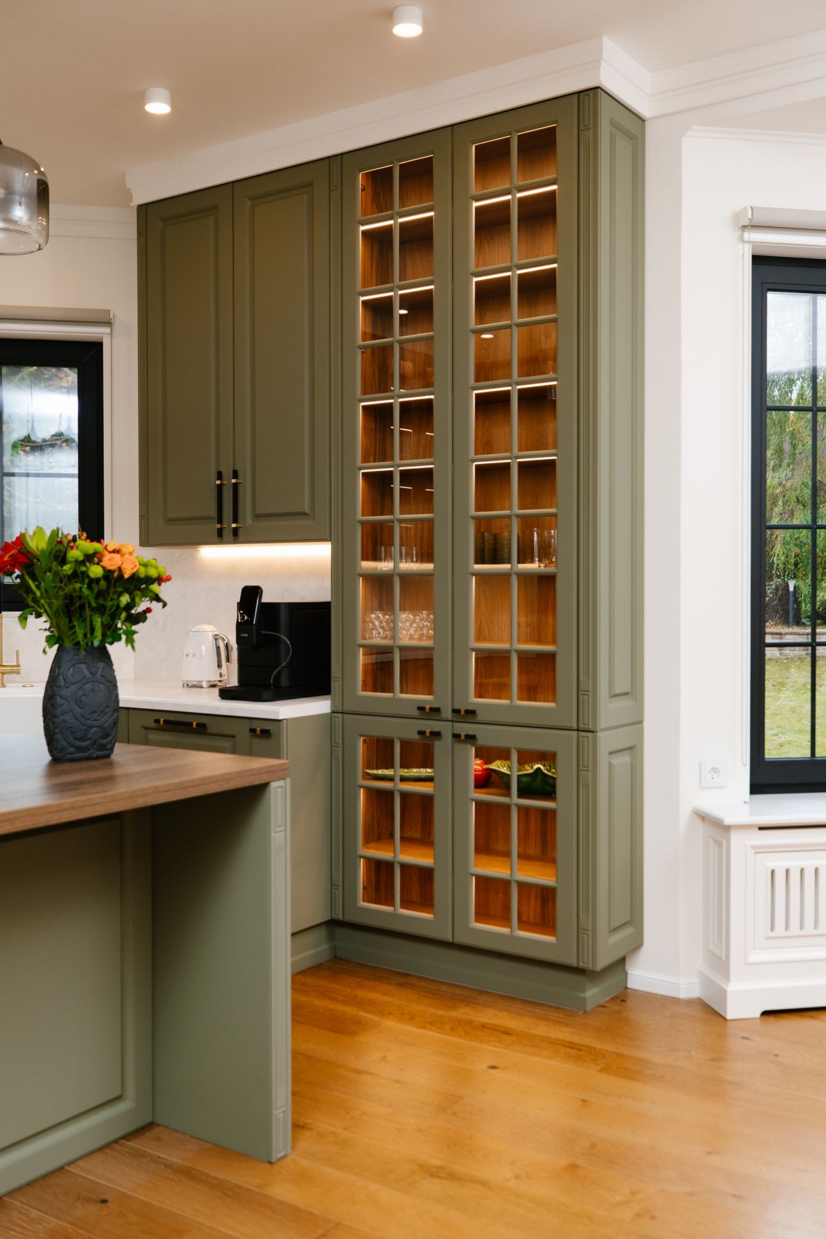 Агата Дрангаактриса“Я мечтала о зеленой кухне. Хотелось, чтобы она была необычной, с витражными стеклами, латунными ручками и деревом. Когда нашли нужный оттенок, я поняла — это она!
