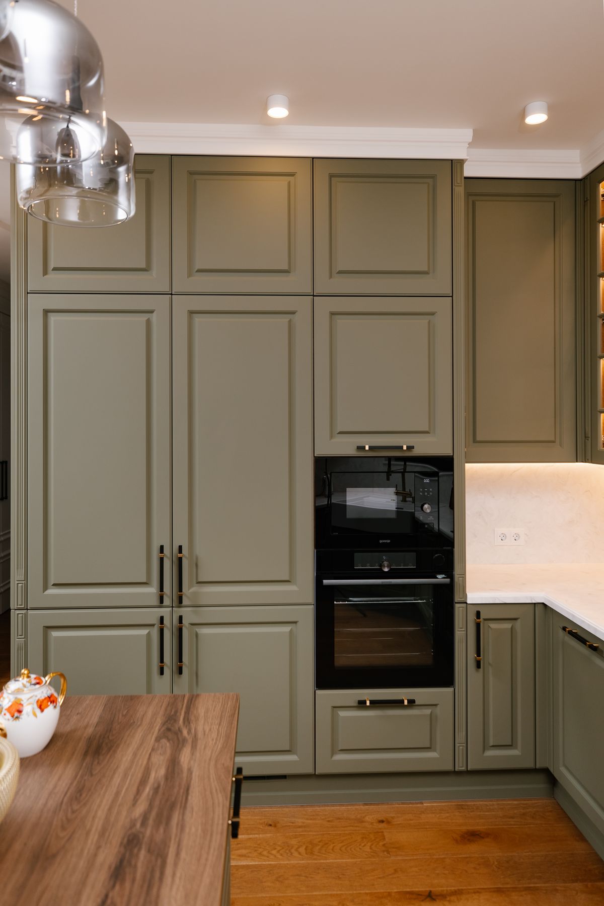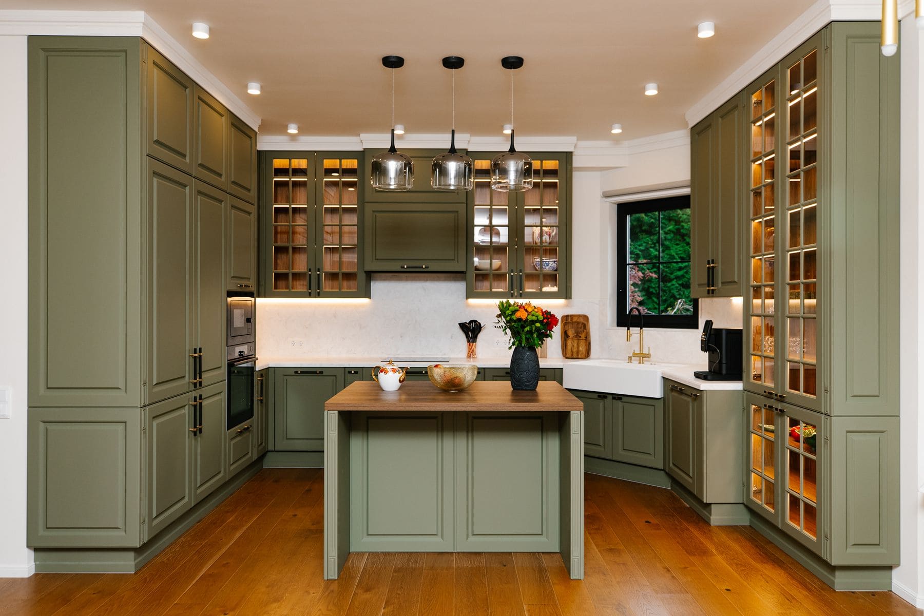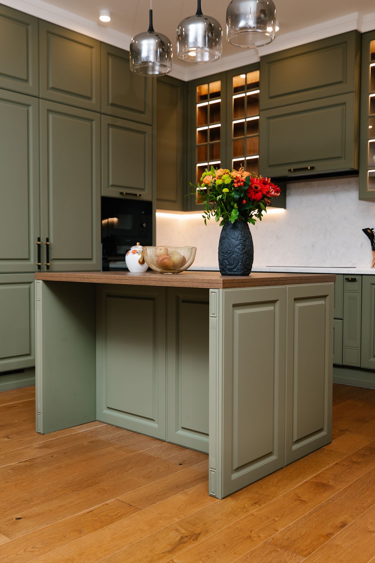 Для реализации проекта мы выбрали элегантную модель Nicolle в неоклассическом стиле. Её фасады, покрытые эмалью soft-touch, привлекают внимание необычным оттенком зеленого цвета. Поверхности фасадов приятны на ощупь и создают ощущение мягкости и комфорта.
