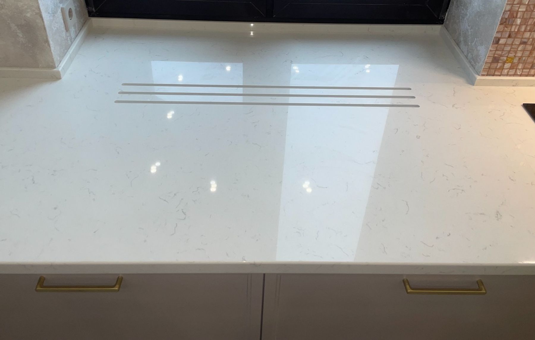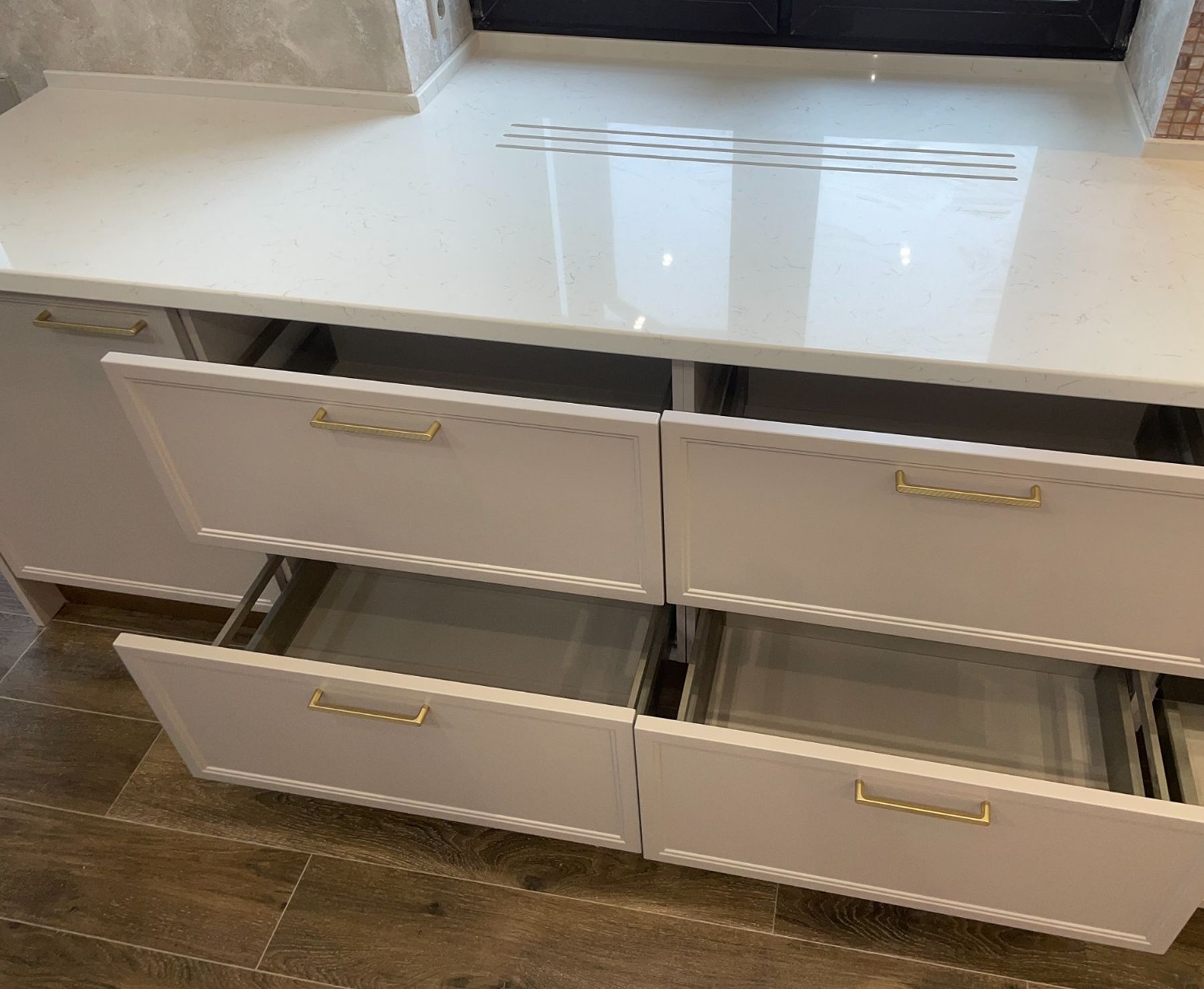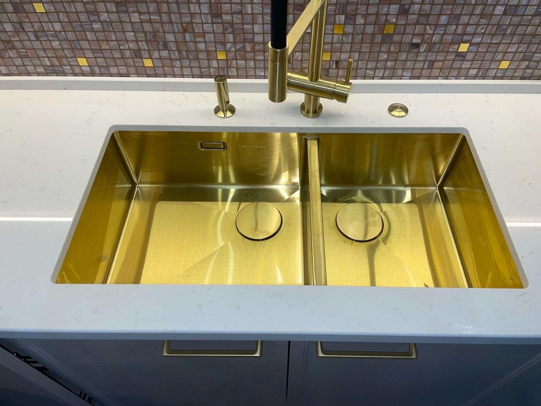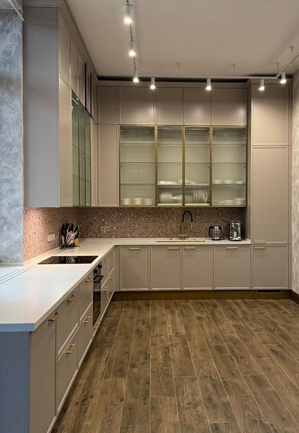 Кухня получилась современной, тёплой и утончённой, с идеальным балансом между функциональностью и декоративностью. Золотые акценты (ручки, мойка, смеситель, подсветка) придают интерьеру премиальный характер, а фасады делают пространство уютным.