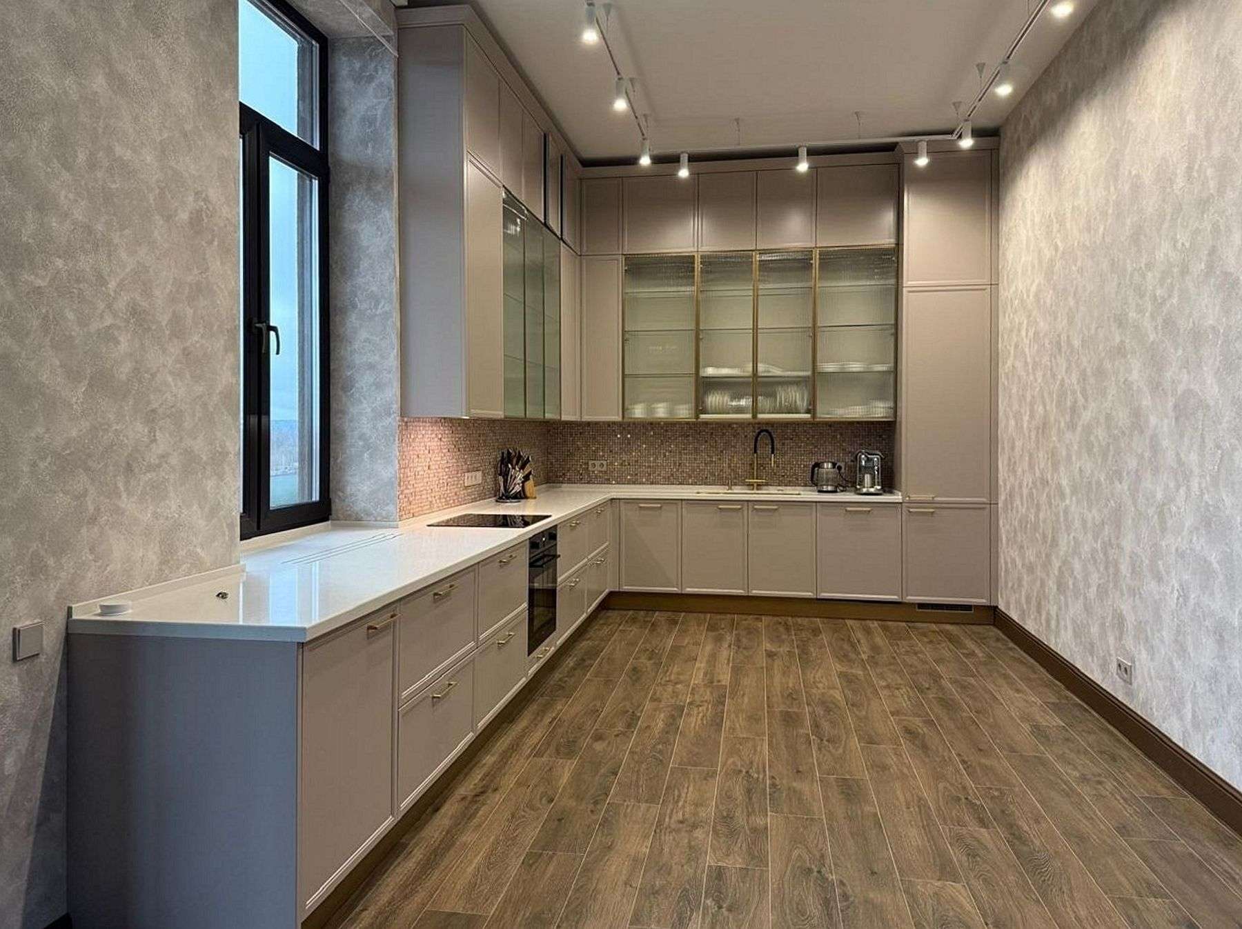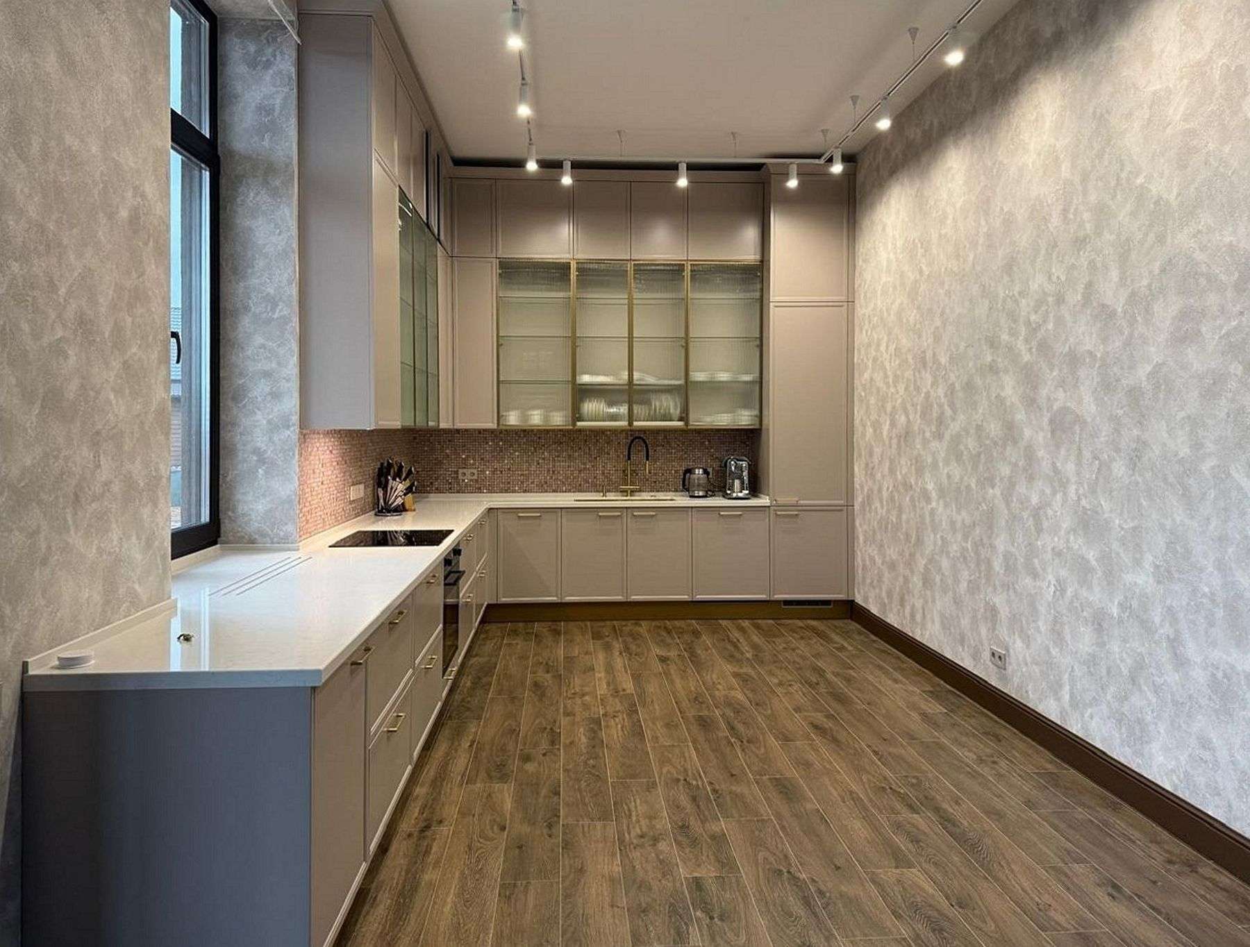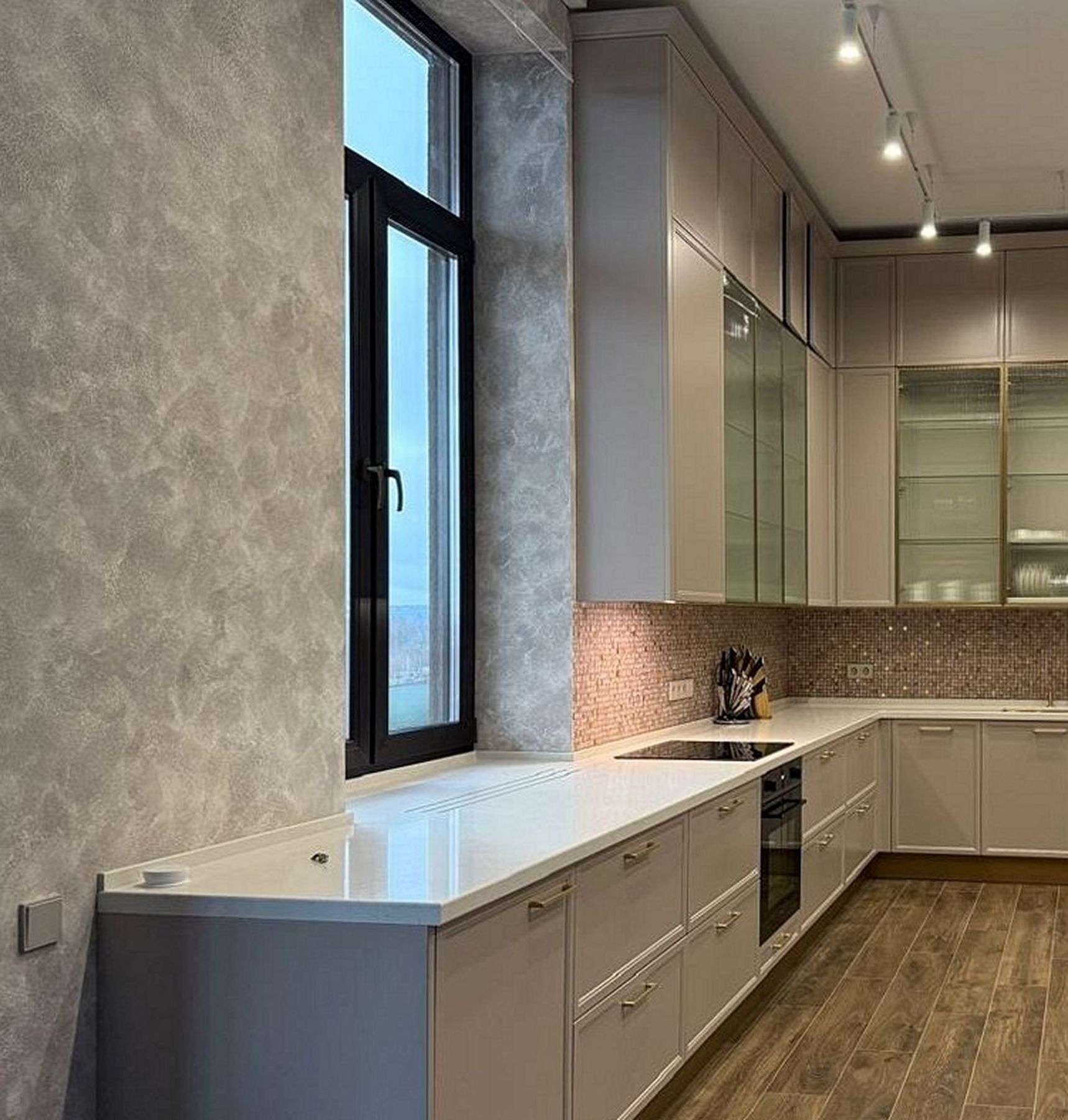 О проектеОписаниеКухня выполнена в современном стиле с элементами элегантной классики. Основной акцент сделан на лаконичность форм, благородные материалы и тёплое освещение, создающее уютную атмосферу. Композиция выполнена в Г-образной планировке, что обеспечивает удобство при готовке и рациональное использование пространства.