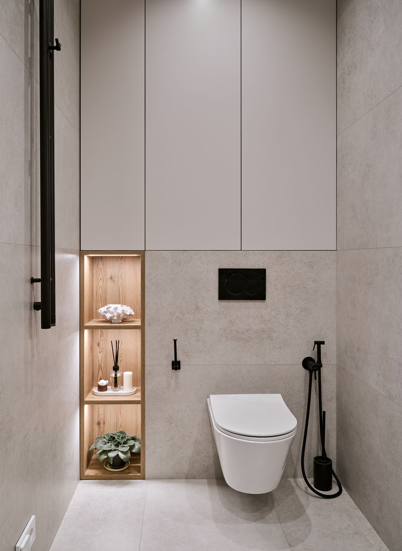Санузел оснащен тумбой Mix 22 с белоснежной столешницей из искусственного камня и оригинальной раковиной. Ниша с инсталляцией дополнена шкафчиком и открытой полкой с подсветкой.