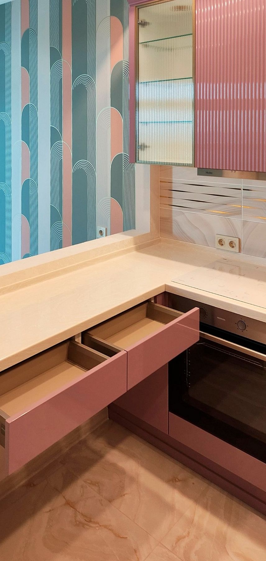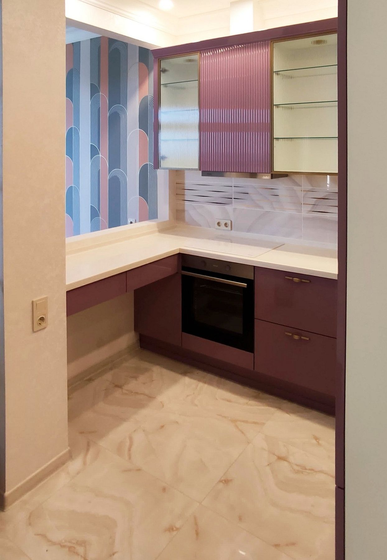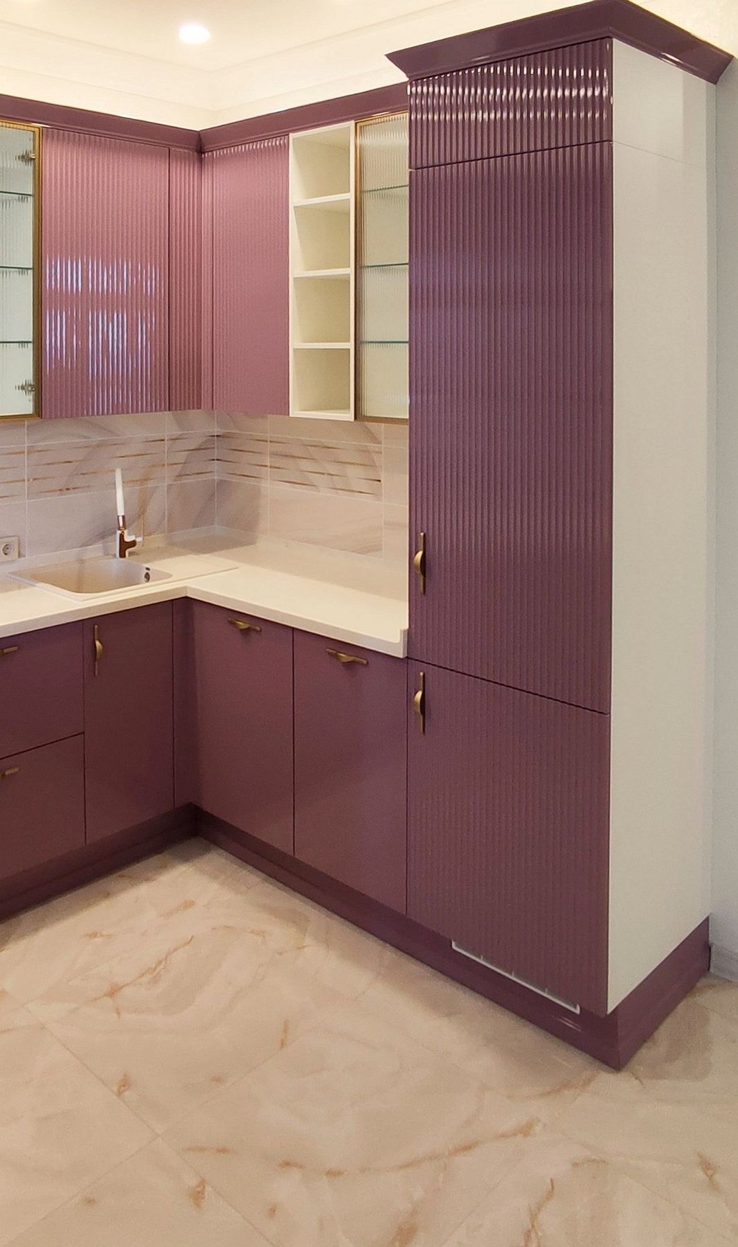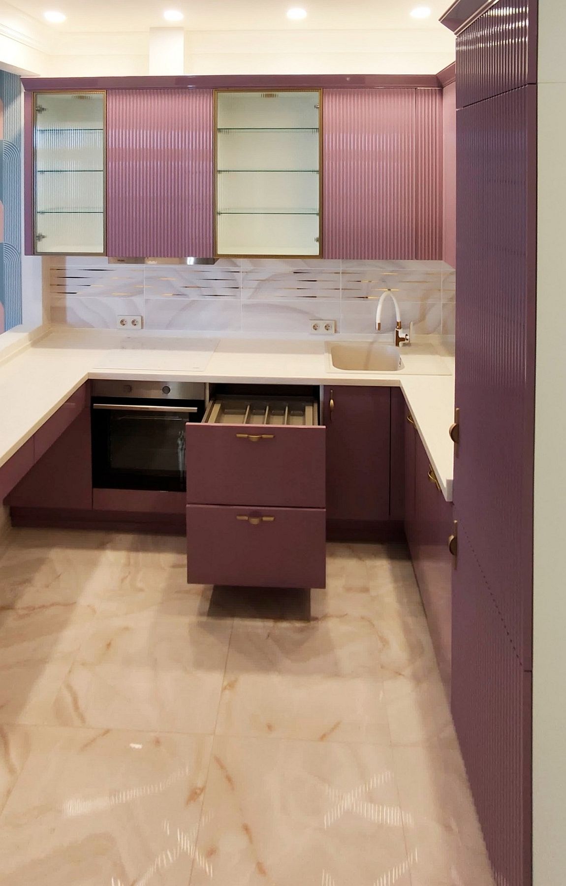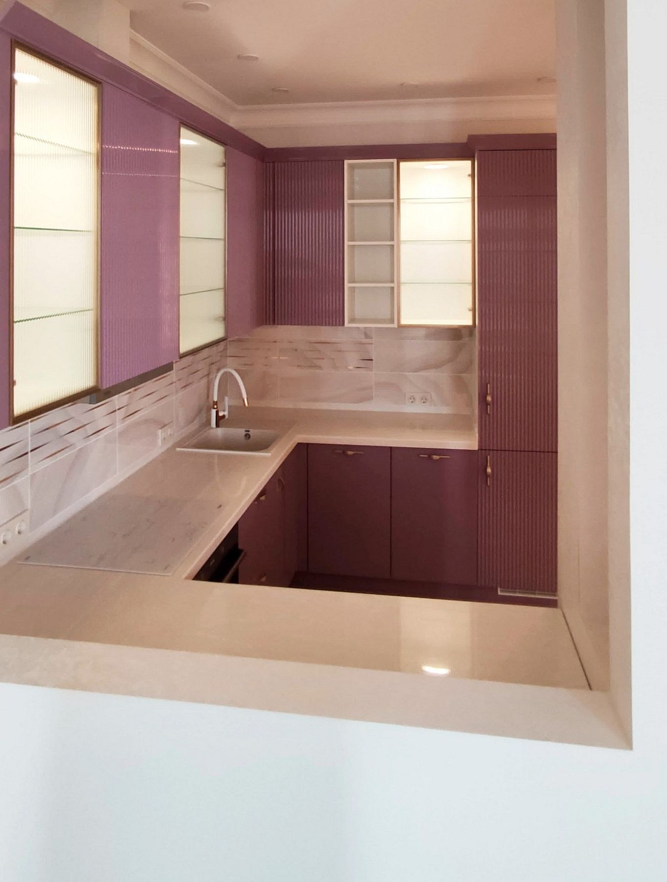 Кухонный гарнитур в нежных пастельно-фиолетовых тонах формирует цельный и элегантный образ. Ключевой акцент – стильные витринные модули с золотым профилем, которые добавляют интерьеру воздушности и роскоши, не утяжеляя пространство. Планировка продумана до мелочей: от встроенной техники и угловой мойки до просторной барной стойки, которая плавно объединяет две функциональные зоны. Арочный портал стал изящным архитектурным элементом, завершающим композицию.
