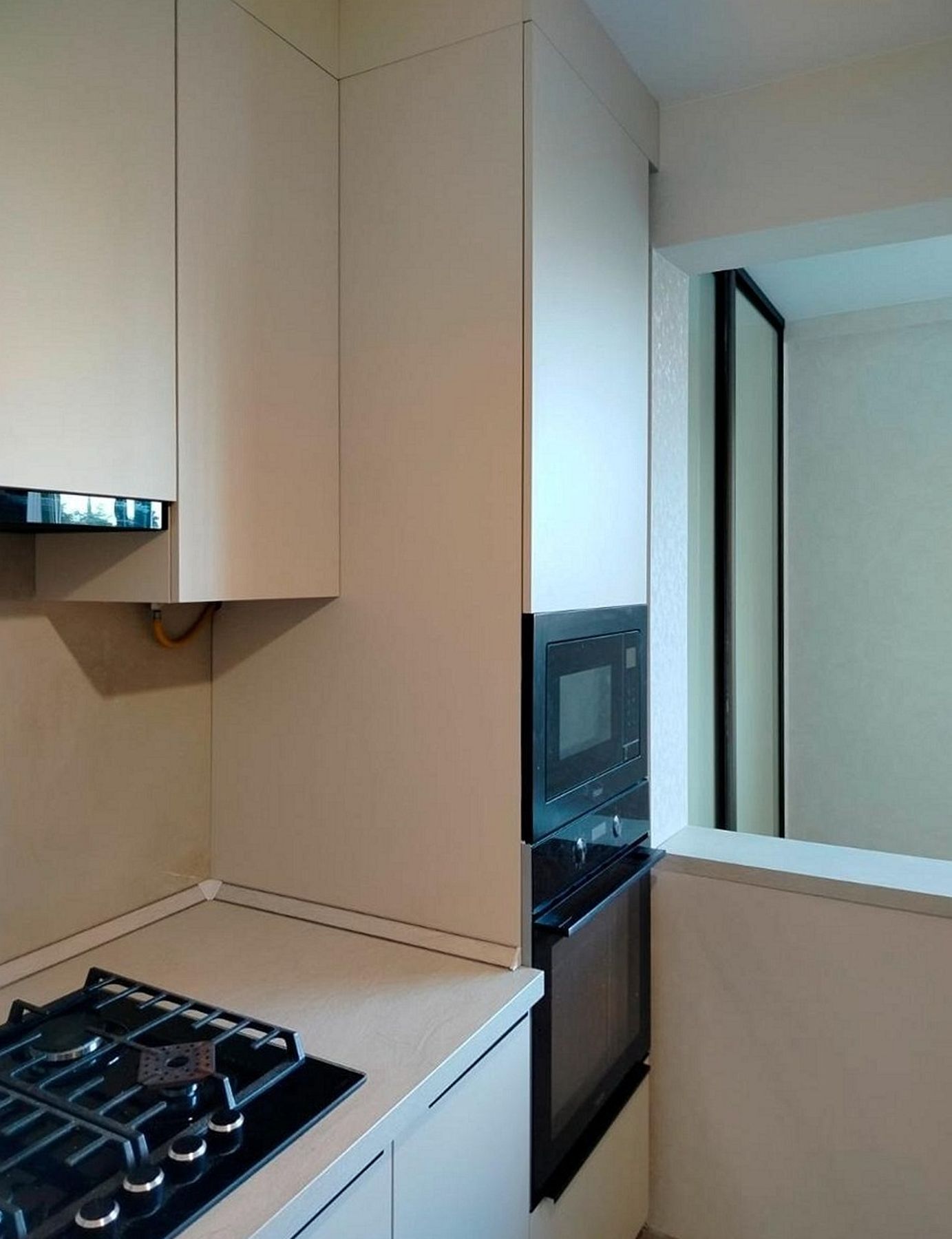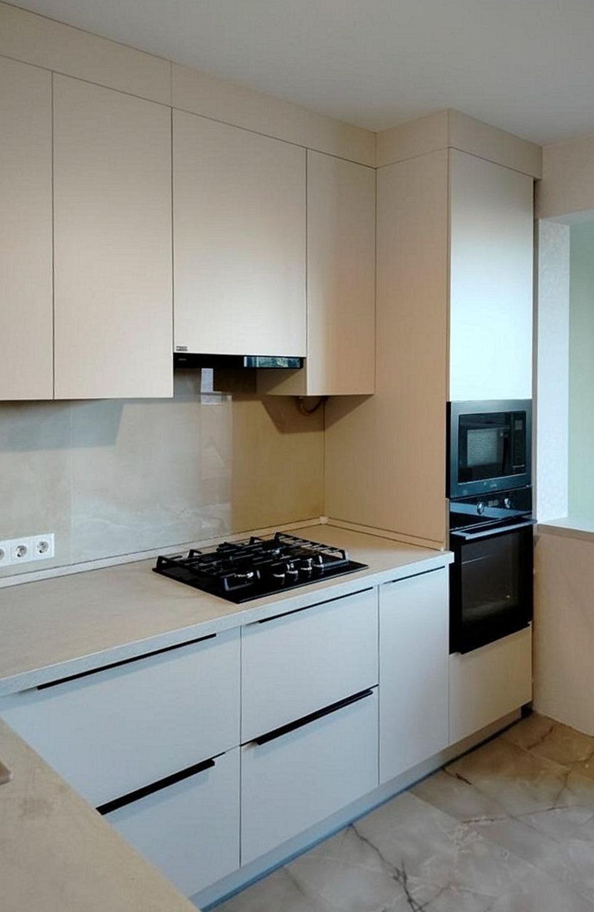 Ключевая особенность – шкафы, выполненные до самого потолка в цвете «Карат бежевый». Это решение не только создает монолитный, стильный облик, но и предотвращает скопление пыли наверху, увеличивая полезный объем для хранения. Практичность обеспечивает широкая столешница «Дюна сахара» шириной 750 мм. Вся встроенная техника, включая духовой шкаф и микроволновую печь, компактно размещена в высокой колонне, обеспечивая идеальную эргономику.