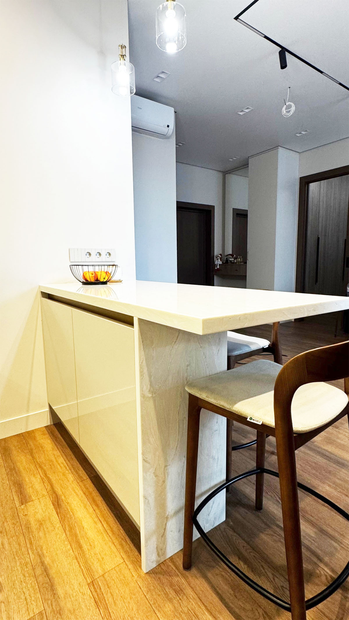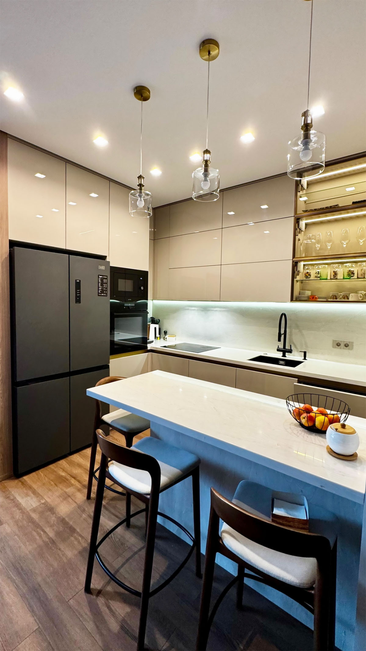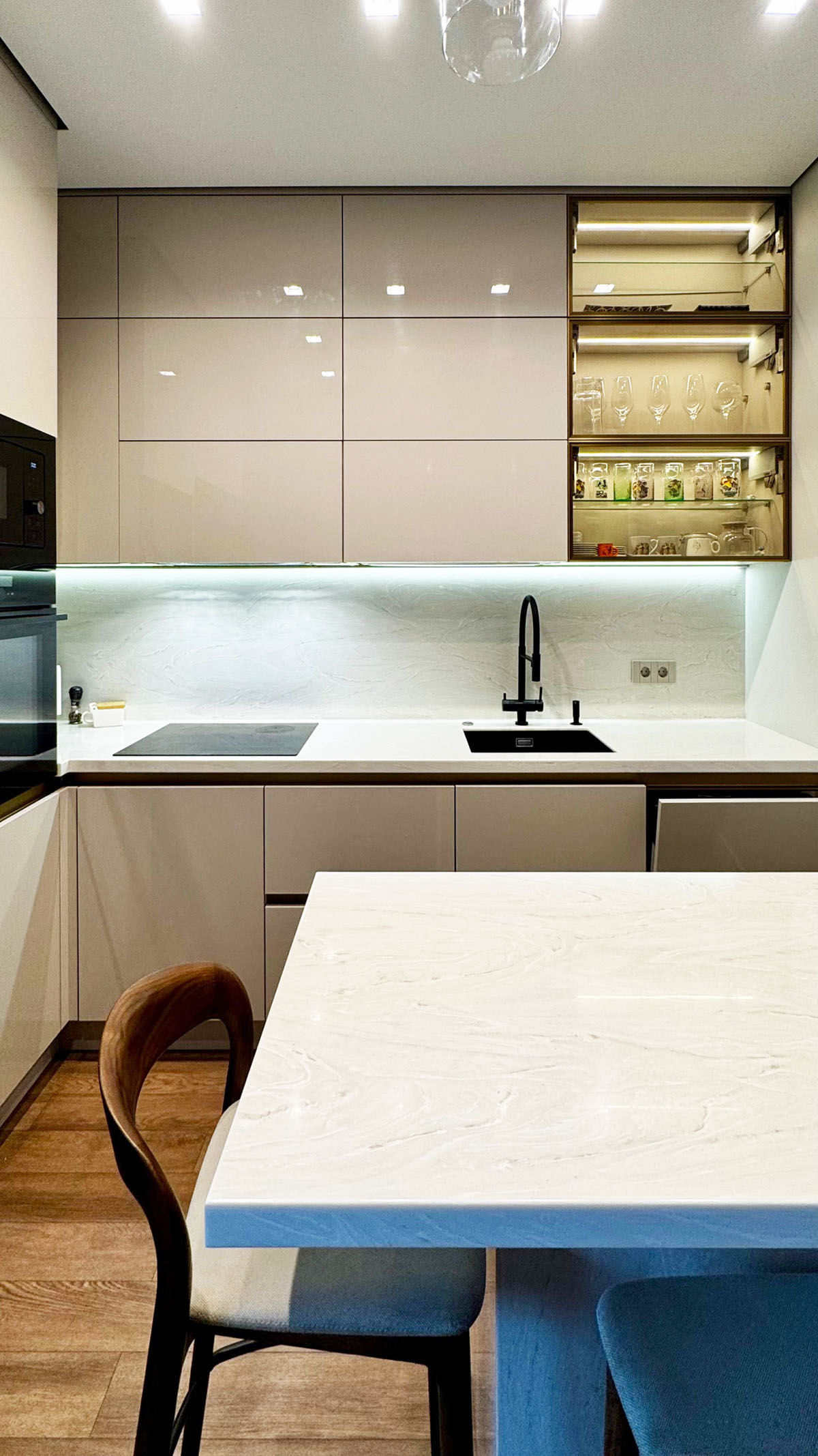 Получилось гармоничное и уютное пространство для всей семьи с помощью современных решений и утонченного дизайна кухни.